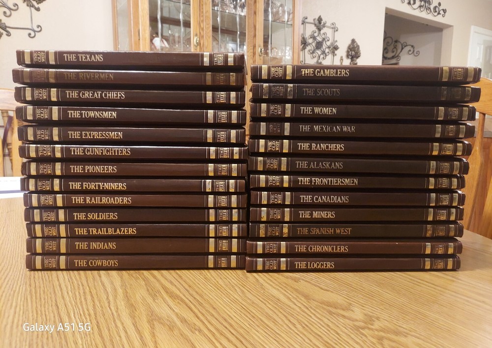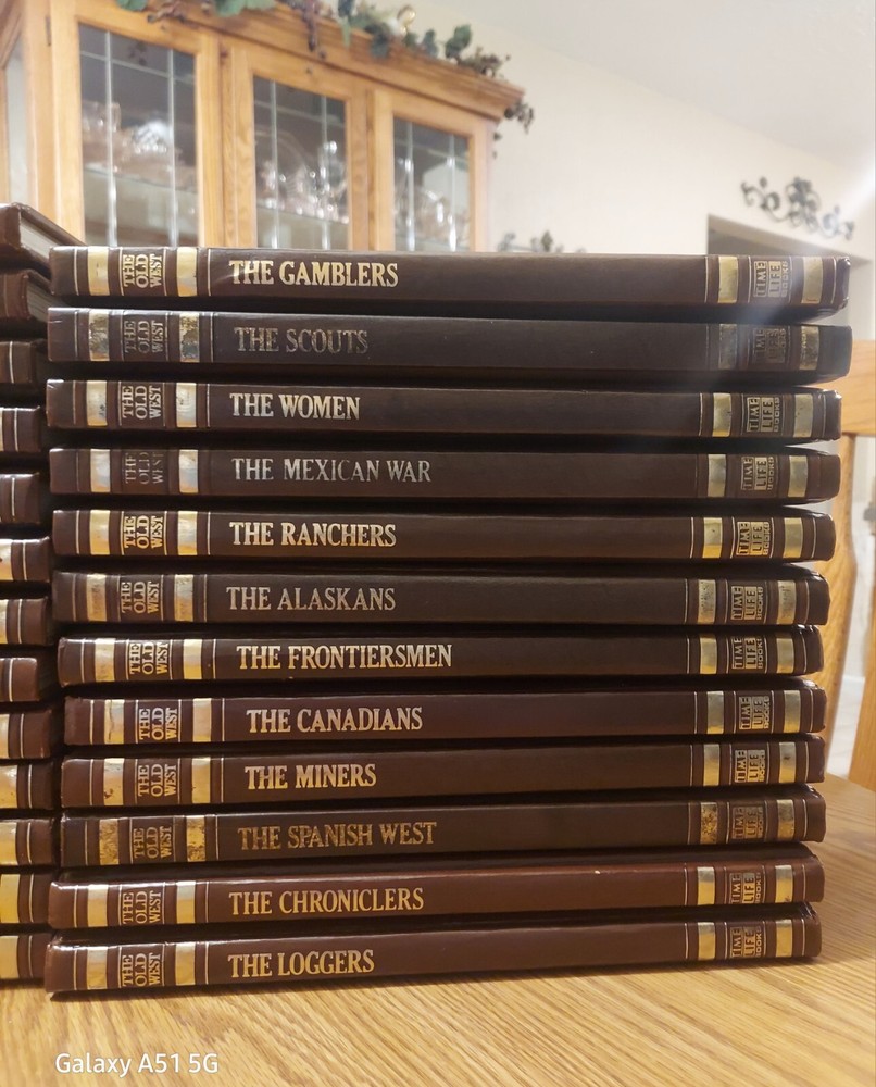 This is a rare vintage set of 25 books from the Time-Life Books The Old West Series. The books are leatherette bound and come with the Master Index for easy reference. The set includes a variety of titles on American history, westerns, and United States/ State & Local/ West topics. The books are in great shape and would make a wonderful addition to anyone's collection. This is a must-have for any book collector or old west history enthusiast. Please take a look at the pictures. They are a part of the description.