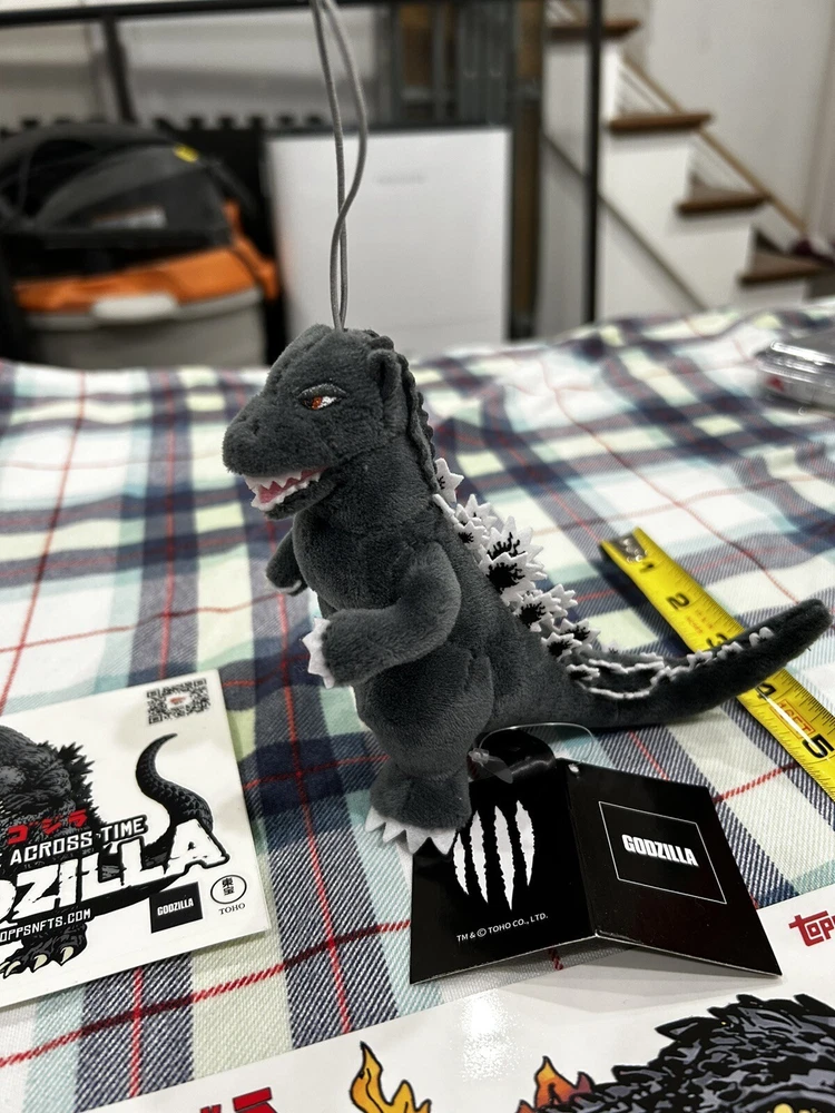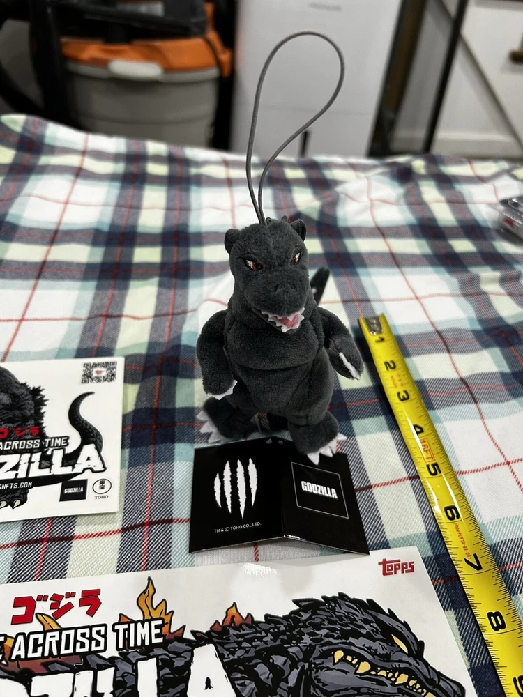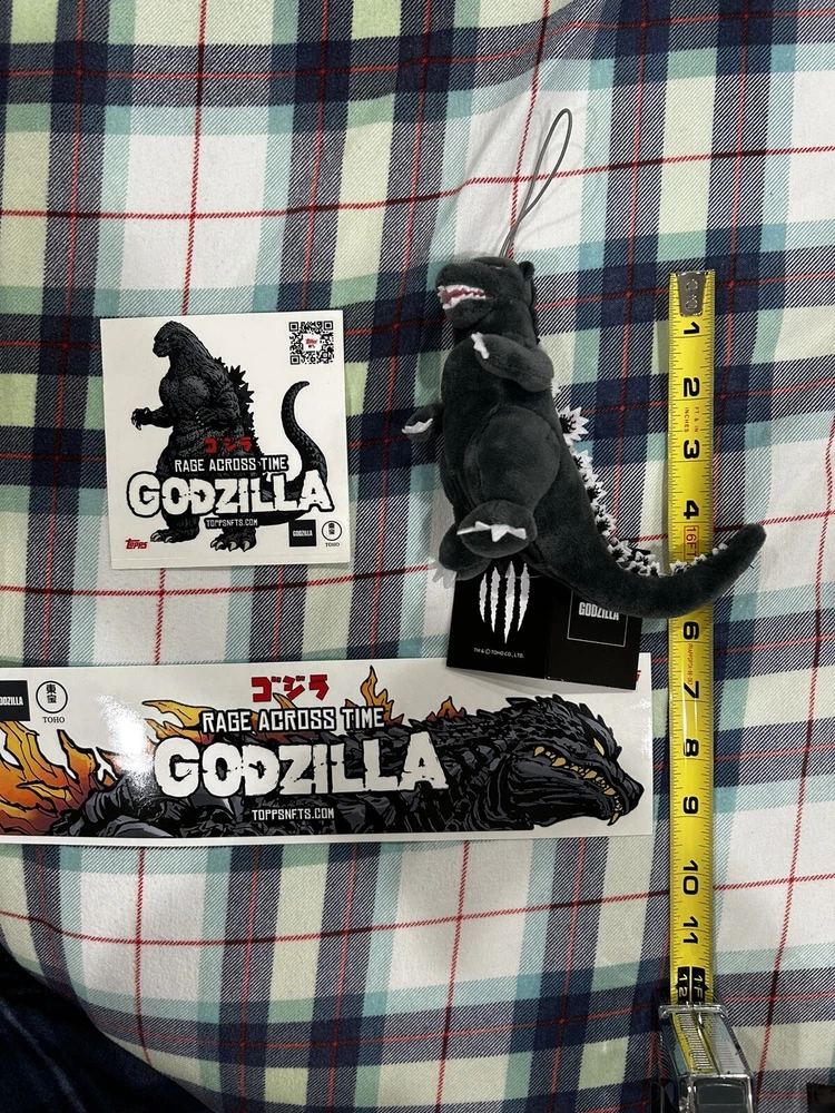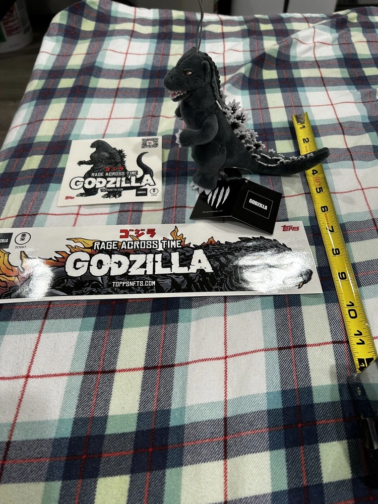 One Godzilla Toho hanging plush new w tags and 2 topps stickers see pictures. All come from a smoke free home