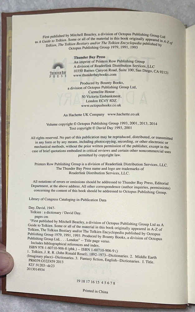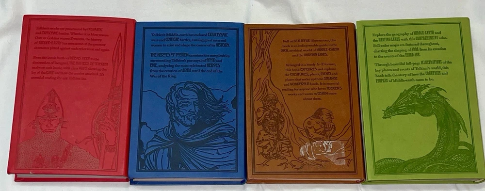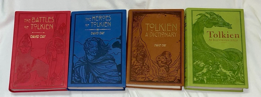 Immerse yourself in the fantastical world of J.R.R. Tolkien with these 4 books of David Day's "World of Tolkien". The set is beautifully bound in faux leather and is flexi-bound for easy reading. The set includes seven books in total. The books are in trade paperback format and published by Thunder Bay Press. The set is a must-have for any Tolkien fan and is sure to provide hours of enjoyable reading. Excellent condition! Some were never read; some only flipped through once. Great colors on the outside of each book. Red - the Battles. Blue - the Heroes. Brown - the Dictionary. Green - the Illustrated Atlas. Great addition for the Tolkien fan.