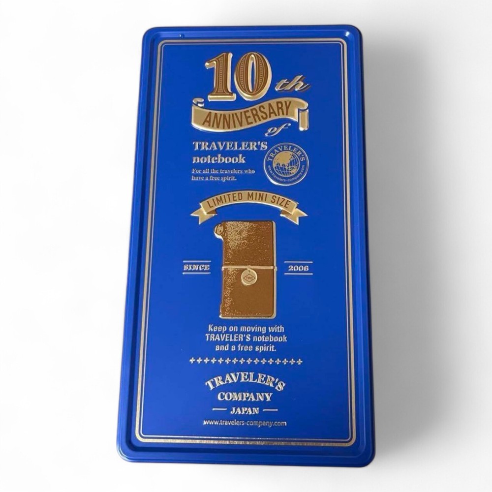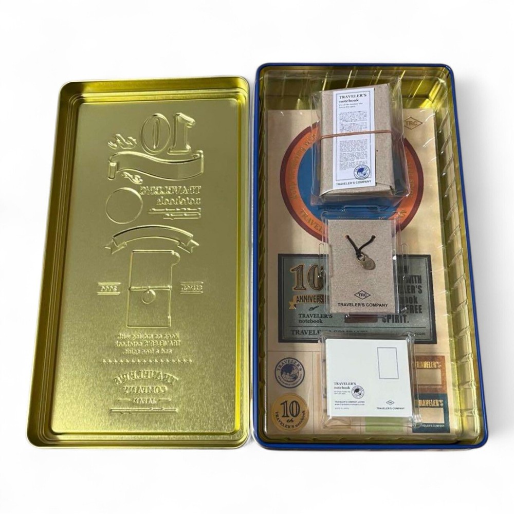 TRAVELER'S COMPANY Mini 10th Anniversary Can Set – Camel Leather (Limited Edition) Celebrate a decade of journaling excellence with this exquisite TRAVELER'S COMPANY Mini 10th Anniversary Can Set . Released in 2016 to commemorate the brand's 10th anniversary, this limited-edition set encapsulates the spirit of travel and adventure in a compact form. Set Includes: Mini Leather Cover (Camel) : Handcrafted from the same high-quality leather as the regular and passport sizes, this miniature cover measures H47 x W32 x D6 mm. It features a special 10th-anniversary stamp on the back, symbolizing its commemorative nature. Blue Tin Box : A beautifully embossed tin measuring H233 x W124 x D43 mm, designed to house the mini notebook and accessories. Refill Kit : Includes 10 sheets each for the cover and title page, and 5 sheets each of MD Paper in white and cream (lined, grid, and blank), along with kraft paper. This allows for personalized assembly of the mini notebook. Brass Charm : A miniature charm that can be attached to your regular TRAVELER'S notebook, adding a unique touch. Sticker Sheet : Full-sized stickers to decorate and personalize your notebook. Assembly Guide : Provides instructions for assembling the mini notebook and insights into the history of TRAVELER'S notebook. Product Details: Condition : Brand New / Unopened Release Year : 2016 Country of Manufacture : Thailand (leather), Japan (tin and contents) Materials : Leather, Paper, Metal This set is a must-have for TRAVELER'S notebook aficionados and collectors, offering a unique piece that embodies the brand's dedication to quality and the joy of travel-inspired journaling.