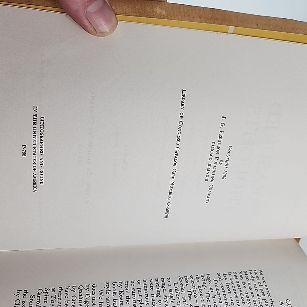 Condition: Outside is a little rough but inside is great This beautiful book titled "Treasured Thoughts" is a mixed collection of stories and poems that is bound in softcover leather with a gilted title. Published in 1968 by J.G. Ferguson Publishing Company in Chicago, IL. About 150 selections by various authors will provide enjoyment and food for thought. Illustrated. The pages are crisp and clean, and the binding is sturdy. This is a rare find for any book lover who enjoys collecting antiquarian and collectible books.
