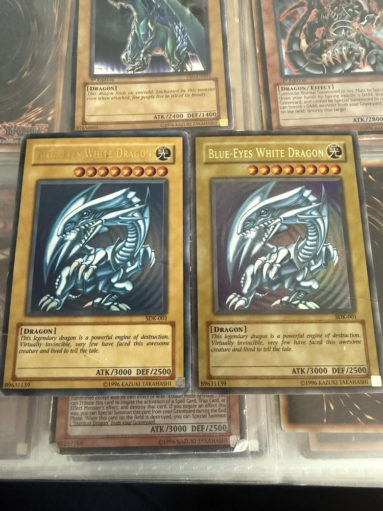 Got these two Blue-Eyes White Dragons in great condition—no major wear, just slight edge scuffing from play. Iconic artwork still pops, and they’re perfect for collectors or casual dueling. A steal for the price!