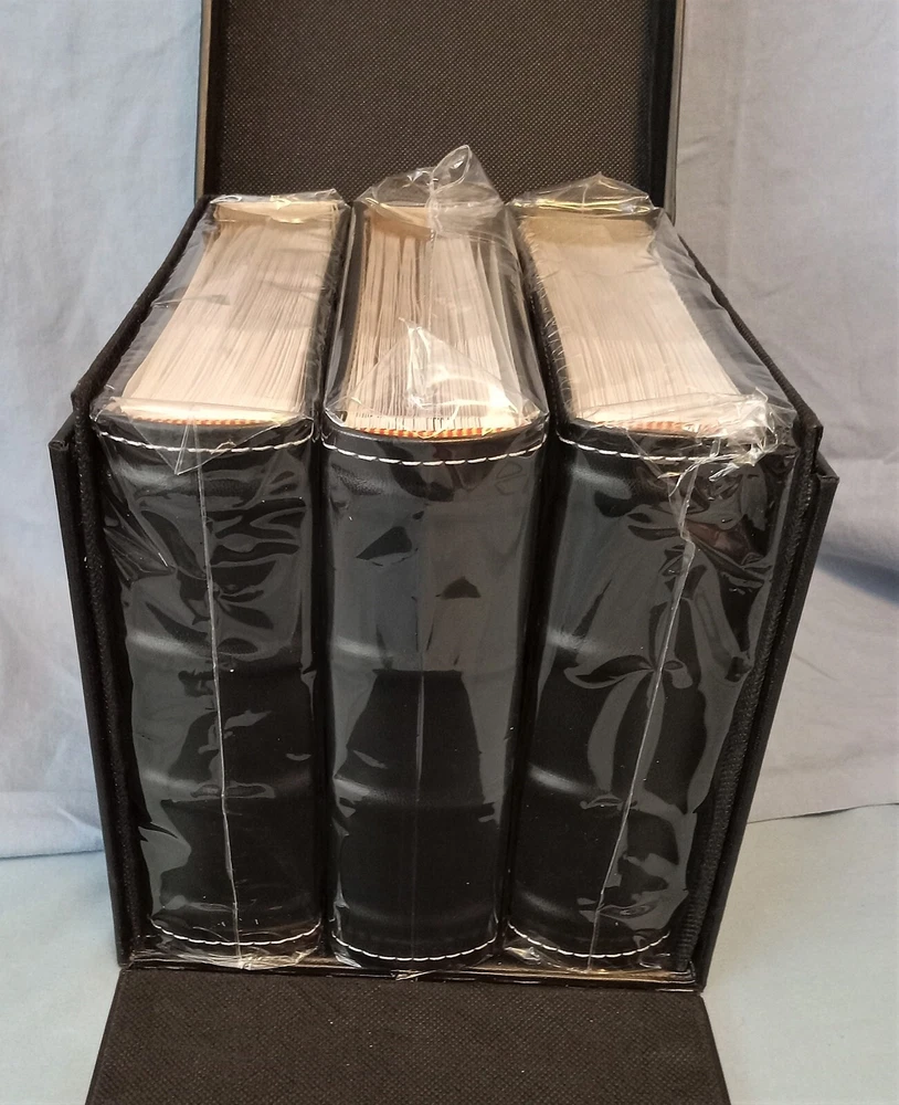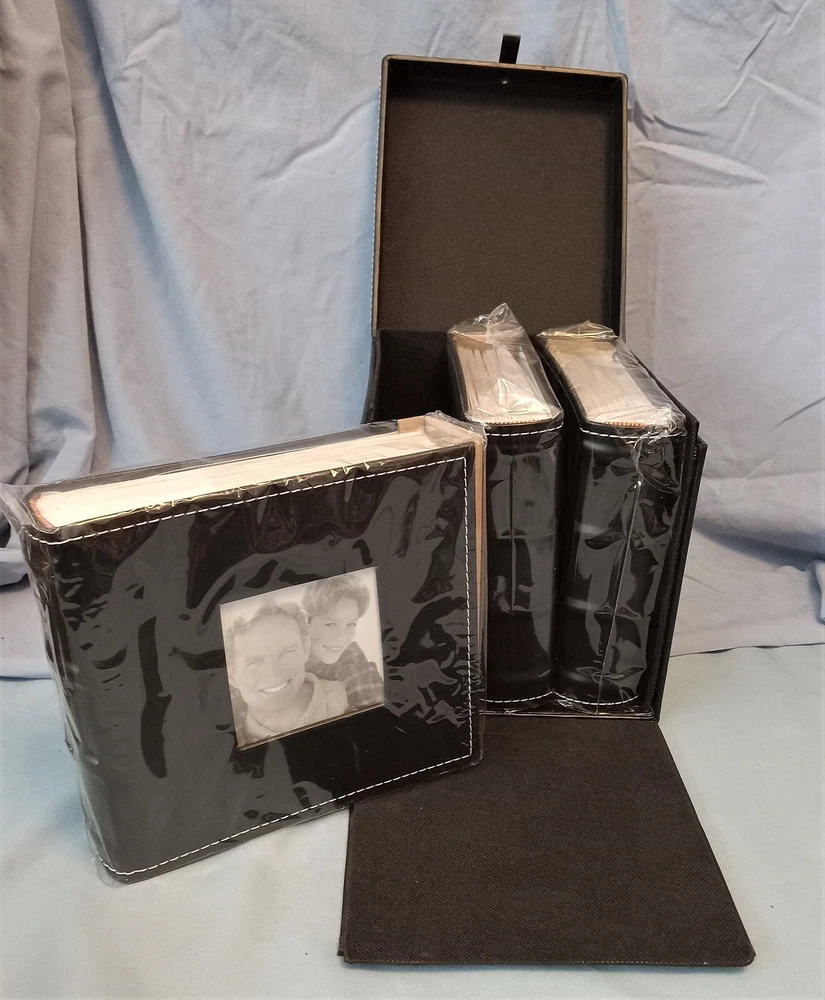 Two's Company Faux Leather 3 Photo Album Set Holds 300 4x6 Photos W/ Storage Box - NWOT Create beautiful memories and more with this lovely set of elegant black faux leather book bound photo albums. Included is a stylish faux leather box to hold the albums! The front of each album has a photo holder. Slip-in style photo pages with a place to write your photo descriptions. Album size: approx. 6.75" x 7.5" 100 pages - holds 2 - 4x6 photos per page Holds Total of 100 photos per album New and Unused without original tags. Original packaging on albums intact. See photos as part of description. Package weight is over 5 lbs - being shipped USPS Ground Advantage is least expensive.