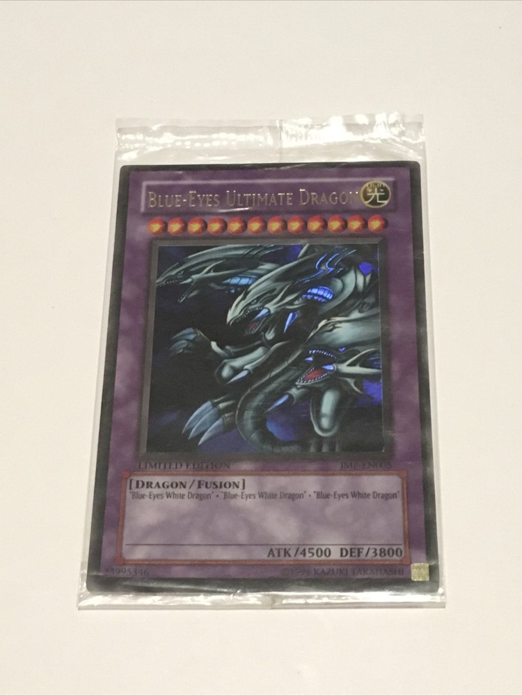 ULTRA RARE Blue-Eyes Ultimate Dragon JMP-EN005 Yugioh Jump Sealed. This item is brand new sealed in the original packaging as shown. There is either a bend/dent on the card or on the plastic itself but I honestly can’t tell. I tried to show I’m photo 3 and 4 but it’s not easy to tell. I also didn’t want to take it out of the sealed package since it’s never been opened. Other than that possible issue everything else looks mint. I will ship in a box with a ton of bubble wrap.