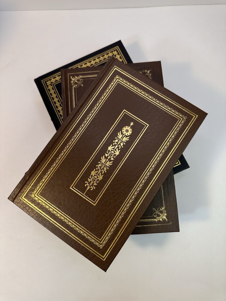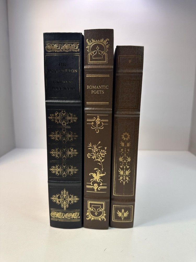 Three books: Romantic Poets William Blake to Edgar Allan Poe; The Decameron Giovanni Boccaccio; Aristotle Rhetoric and On Poetics. Some gold parts is faded, names for two are faded as well