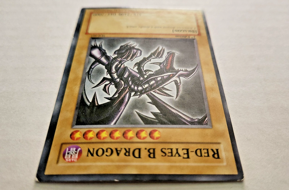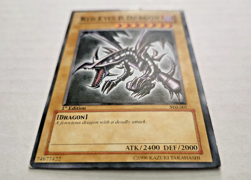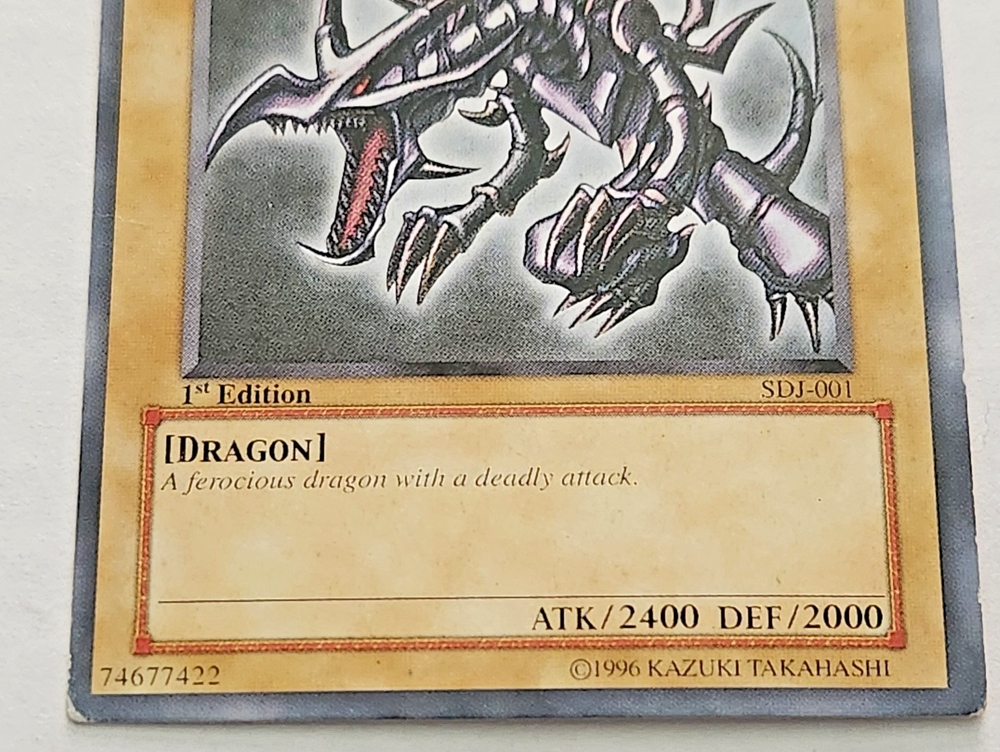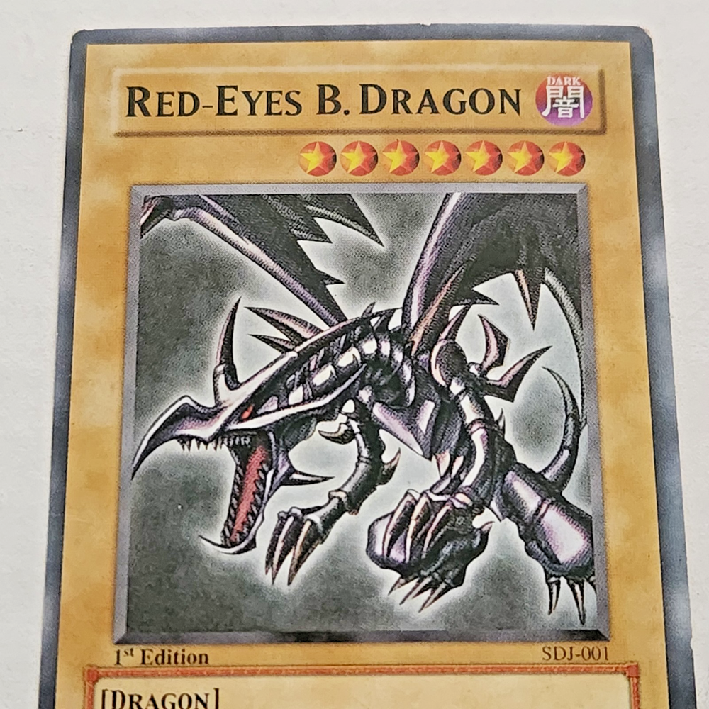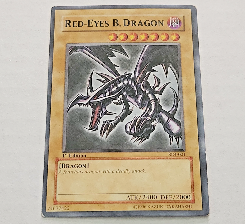 From Starter Deck Joey! Dive into the world of strategic duels with the iconic Red-Eyes Black Dragon card from the Yu-Gi-Oh! TCG Starter Deck. Featuring the formidable beast from the famed franchise, this Ultra Rare SDJ-001 card is a must-have for collectors and players alike, boasting the deadly attack that can turn the tide of any game. This 1st Edition treasure, manufactured by Konami in 1996, is presented in English and designed for the age level of 4+. With its standard card size and regular finish, it fits seamlessly into any deck, making it a versatile addition to your collection. Experience the power of Red-Eyes Black Dragon and leave an impression on the battlefield. Very Good Condition with moderate wear having dinged corners and edges and surface scuffs/scratches. See Pictures. COMBINE SHIPPING! $2.50 shipping up to 4 single cards (no sleeves or cases) $6.00 shipping up to 24 single cards (no sleeves or cases)