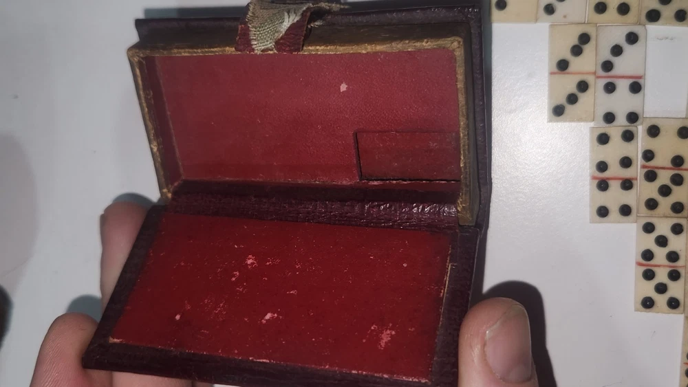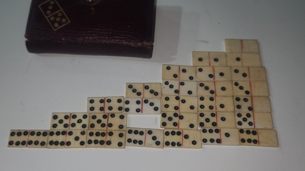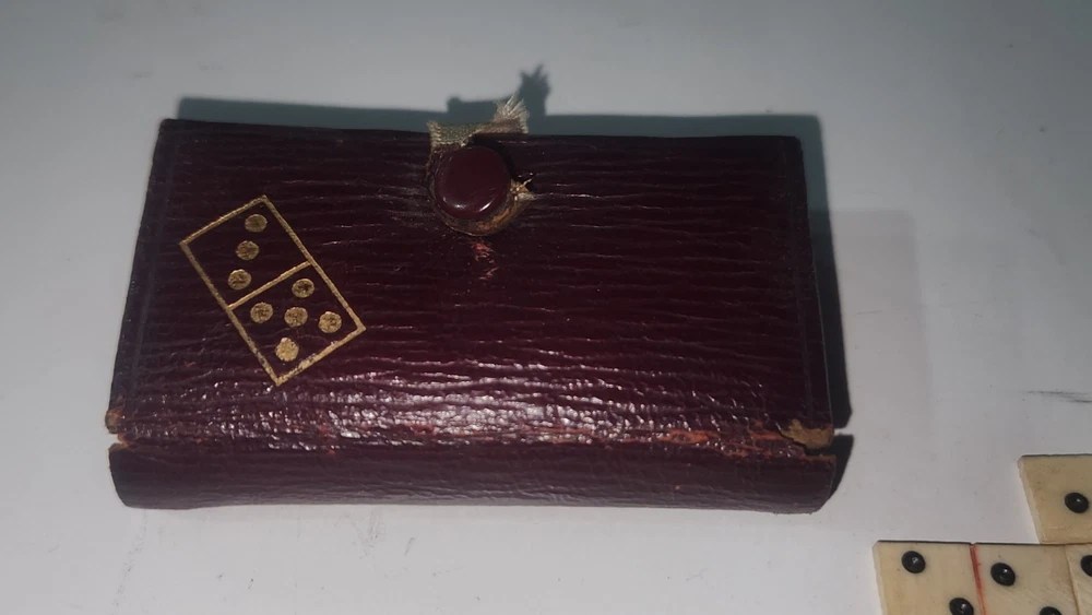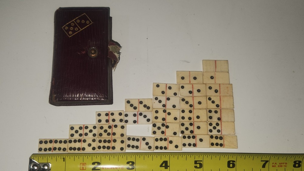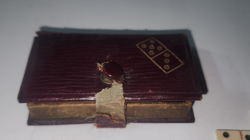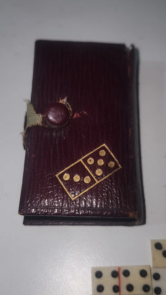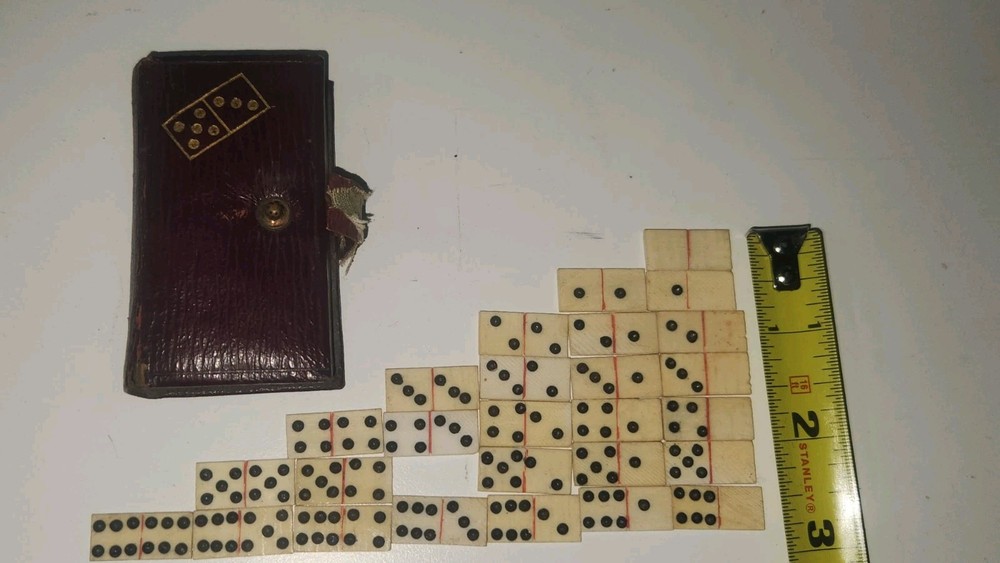 Very cool antique mini domino set. The case is in poor condition. The strap is holding on by a thread. Missing 1 domino to make a complete set. Very old and unique. Great collectors item. Please review photos for additional details. Thank you.