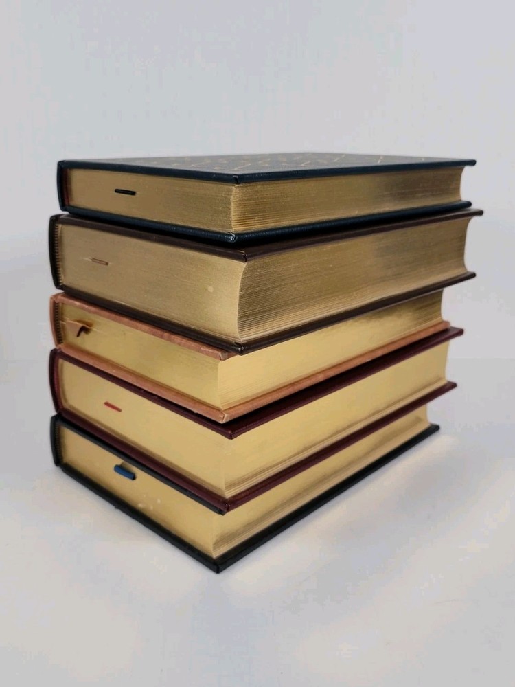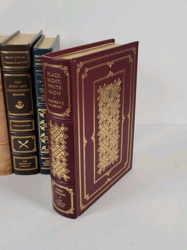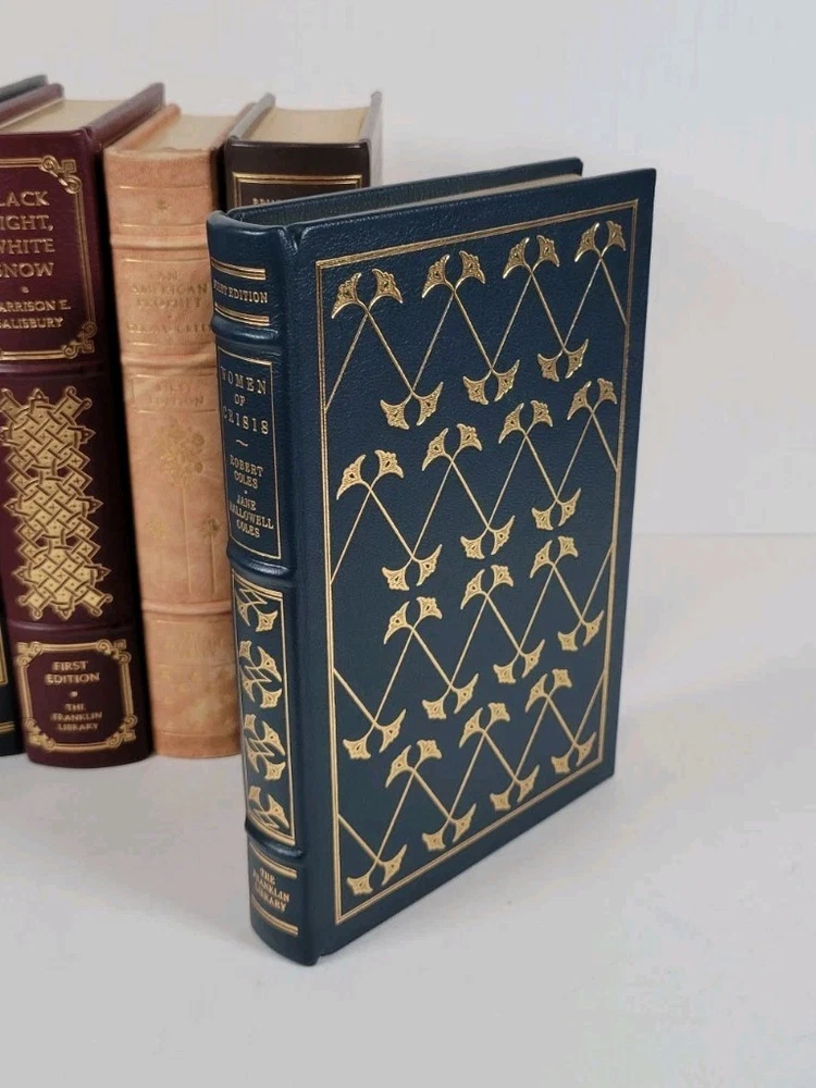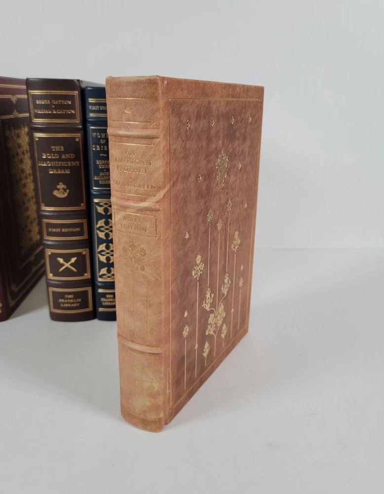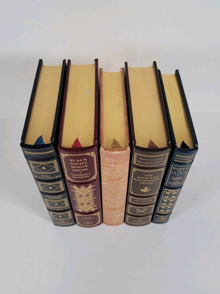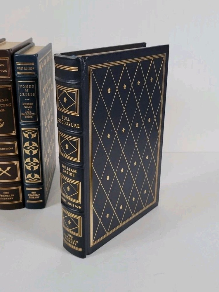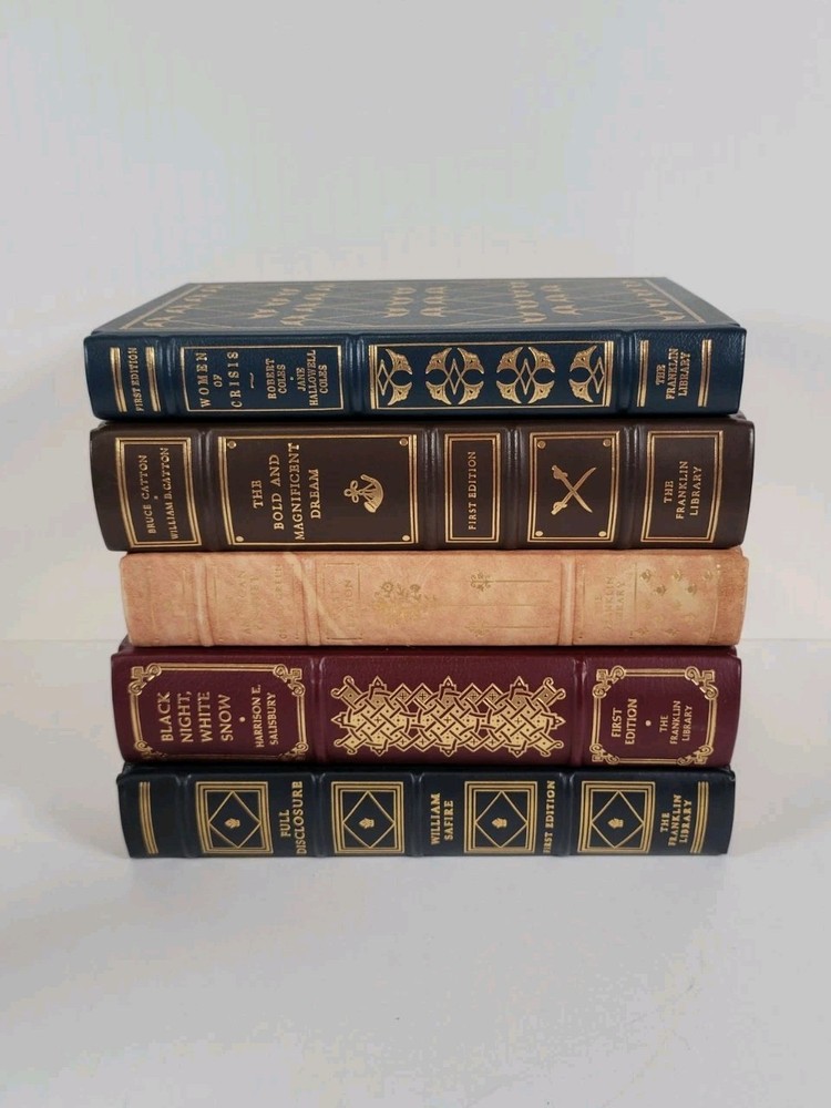 This lot features 5 beautifully bound Franklin Library First Edition Society books exploring the fabric of society, the power of political insight, and the voices that shaped American thought during pivotal decades. These editions are ideal for collectors of political literature, lovers of historical narrative, or those who appreciate finely made books with lasting relevance. Books included : Full Disclosure – William Safire Black Night, White Snow – Harrison E. Salisbury An American Prophet – Gerald Green The Bold and Magnificent Dream – Bruce & William Caron Women of Crisis – Robert Coles & Jane Hallowell Coles Each volume features gold detailing and ribbon bookmarks. All volumes are in excellent condition as seen in the photos. Please feel free to message me with any questions. Thank you!