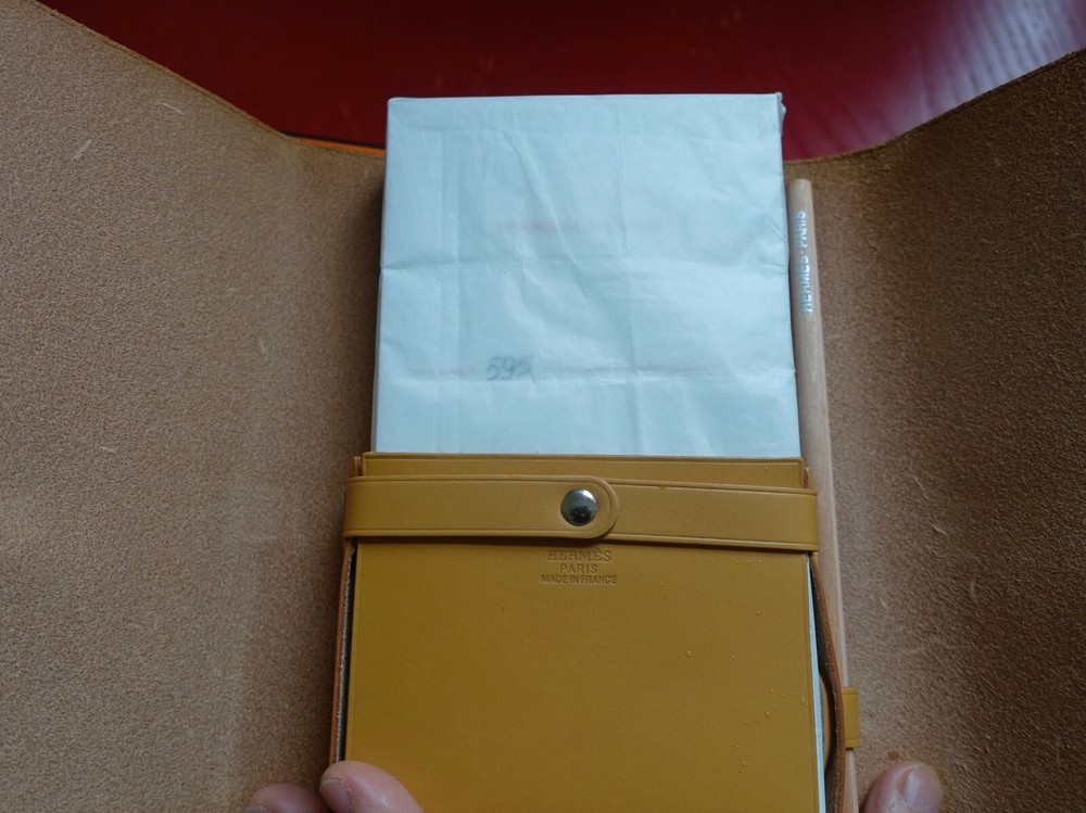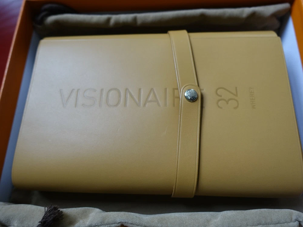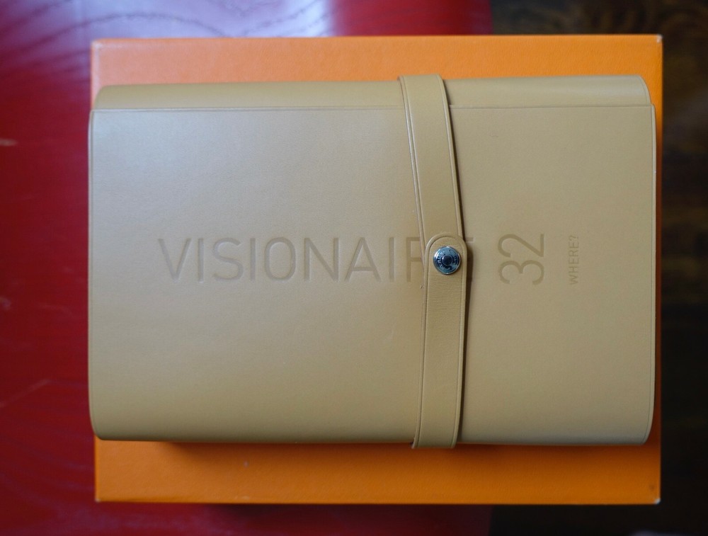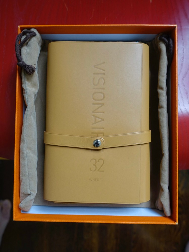 Hermes x Visionaire 32: Where? Limited Edition. Numbered 595 of 3,500. Visionaire 32: Where? was designed by Hermès' President Jean-Louis Dumas and collects 55 post-carded format photographs by Peter Lindberg, Mary Ellen Mark and Andreas Gursky among others. The postcards have been collected in a camel Hermès cover closed with a studded strap snap closure. Matching pencil comes in its own holder. Includes Hermès pouch and original Hermes box and cover. Made in France. Slight wear on edges of box from storage. Brand new. Leather cover, postcards and all other collateral is in pristine condition. Free shipping within the continental US Please contact me if you have specific directives for customs in your country.