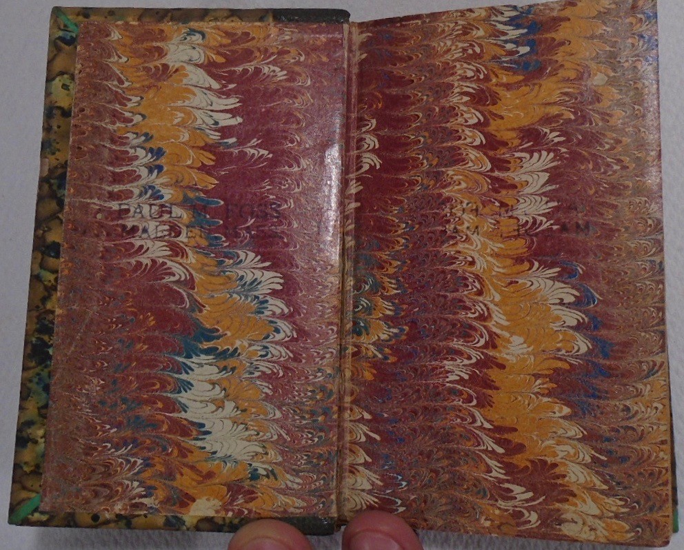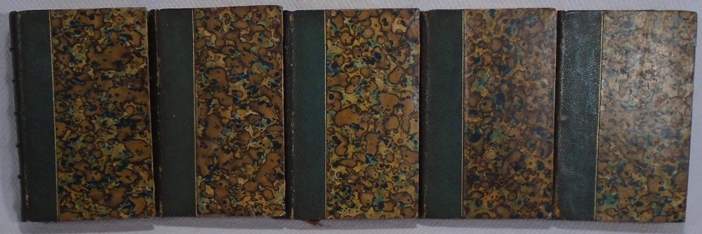 Presumed complete in five volumes. 4 ½ inches tall. Half binding with leather to spine and marbled paper. Stamped, gilt lettering to spine. Gilt top edges. Former owner stamp to front endpages. Very Good. Chipping to lower spine on Vol. V. Bindings tight.