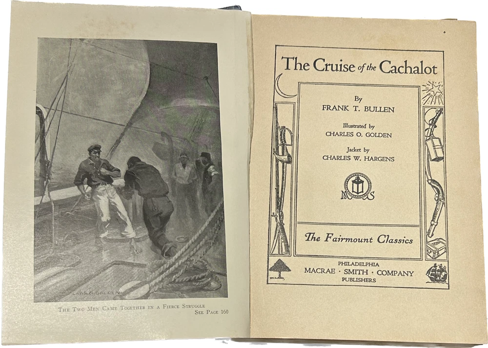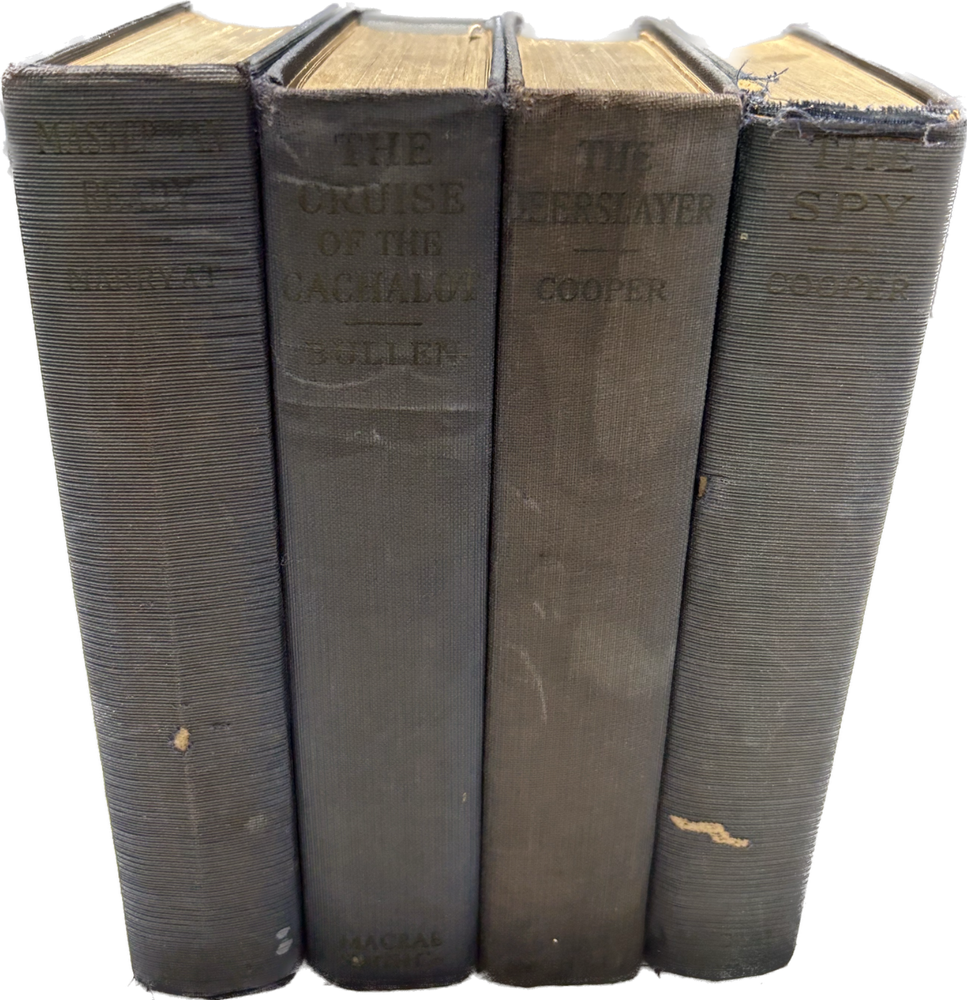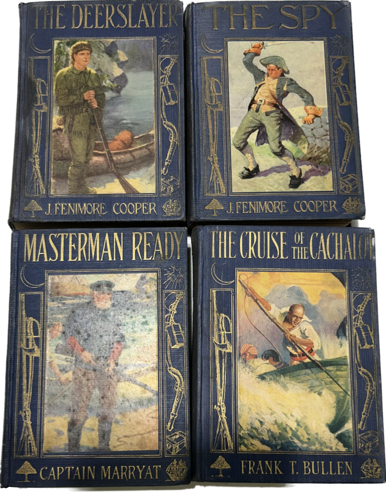 The Spy by J. Fenimore Cooper Illustrated by S Gordon. Published by Macrae Smith Co 437 Pages. Published 1821 The Deerslayer by J. Fenimore. Cooper. illustrated by Donald Humphrey. Published by Macrae Smith Co. 533 Pages Published 1930 The Cruise Of The Cachalot by Frank T Bullen. Illustrated by Charles O Golden. Published by Macrae Smith Co. 309 Pages Published 1929 The above 3 books are A FAIRMOUNT CLASSICS Books Masterman Ready by Captain Merryat Illustrated by Donald Humphrey. Published Macrae Smith Co. 378 Pages Was first published 1841. They were all written between 1841 - 1898 The front covers of these books are still with good color. The spines are faded and the pages are yellowed due to age. The backs are good except on book has white spots on the back cover. These books are very old and rare. Please let me know if you have any further questions. BS
