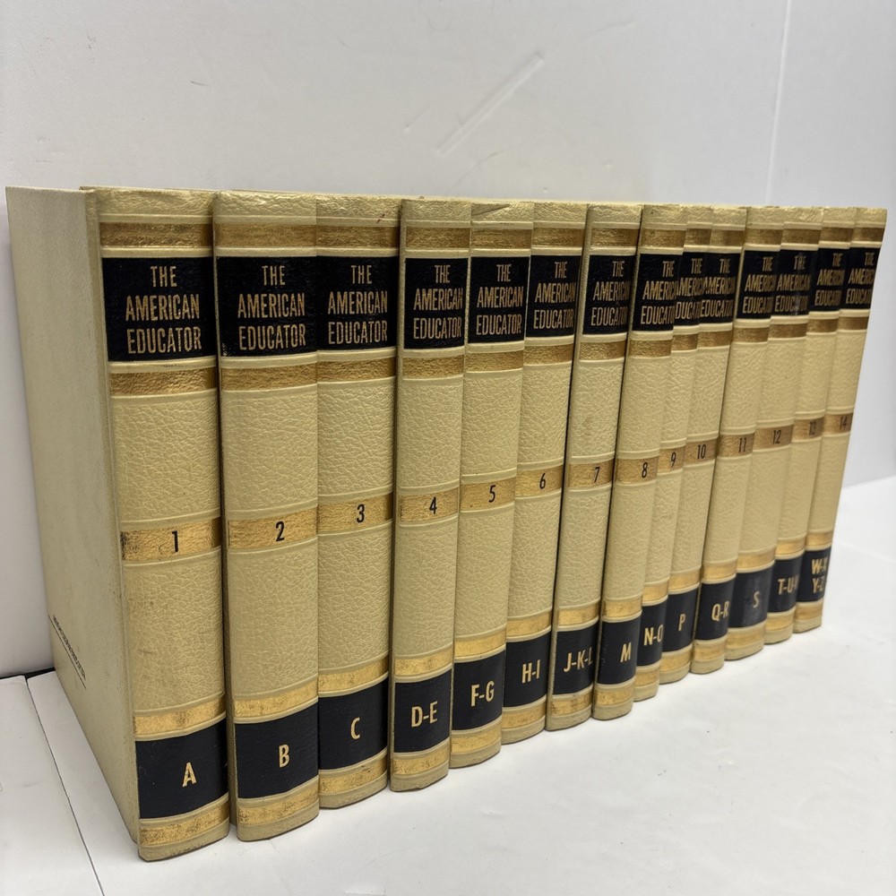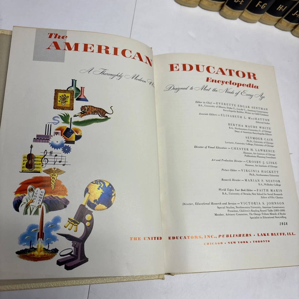 The product is a full set of 14 leather-bound volumes of "The American Educator Encyclopedia" from 1958, published by The United Educators, Inc. The encyclopedia, with English language and illustrated features, covers a wide range of educational topics and serves as a valuable reference for educators and students. The set, printed in 1966 and authored by various contributors, represents a significant collection of knowledge and insights from the 1950s, making it a unique and collectible item for those interested in historical educational materials.