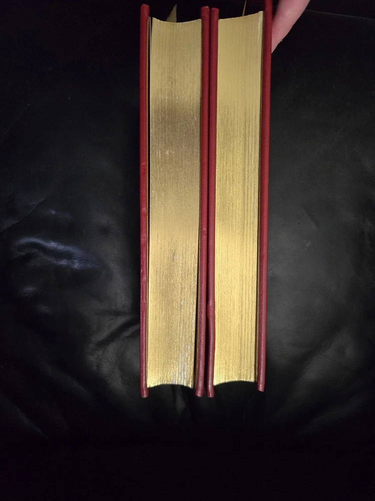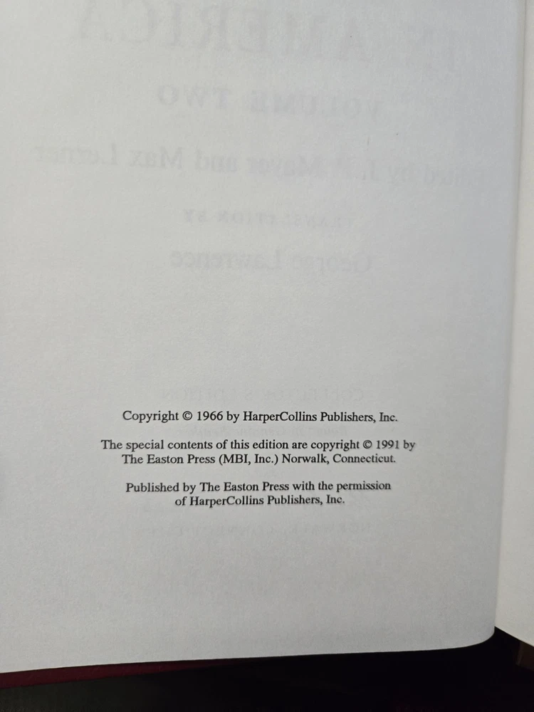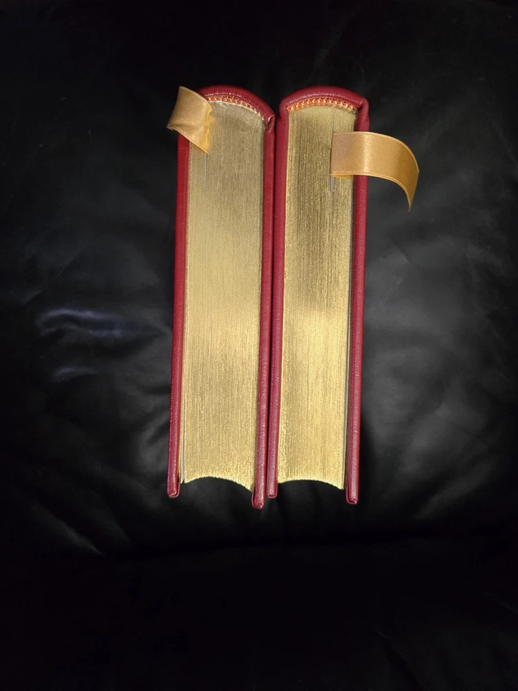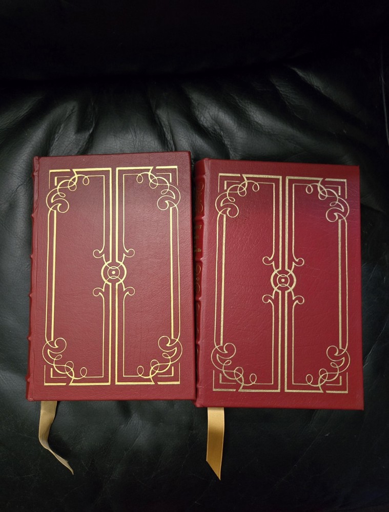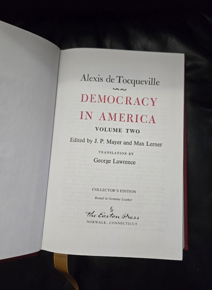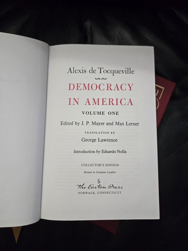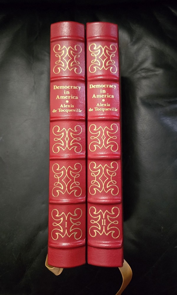 This is the stunning 2-volume collector’s edition of Democracy in America by Alexis de Tocqueville, published by Easton Press. These vintage volumes are part of the Easton Press series of classics, crafted with premium materials for a lifetime of beauty and durability. Bound in full genuine leather with hubbed spines, 24k gold gilt page edges, and satin ribbon markers. A foundational text in political philosophy and American history, this set is ideal for collectors, students of government, or admirers of beautiful leather-bound books. Included Titles: Volume 1 Volume 2 Both volumes are in good vintage condition with minimal wear. Clean pages, bright gilt edges. No writing or highlighting. See pictures for additional details. As this is free (included) shipping, I will choose whichever option is most economical regardless of buyer choice. Please note that for both ecological and economical purposes, I recycle and reuse packaging, so your item(s) may arrive in a recycled box, etc.