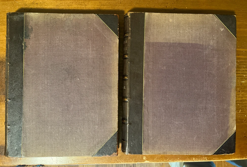 11 x 8.5 inches. Original 1/2 leather bindings with cloth boards in very good condition; light scuffs, etc. Marbled endpapers. Contents secure. Light foxing. A very attractive set.