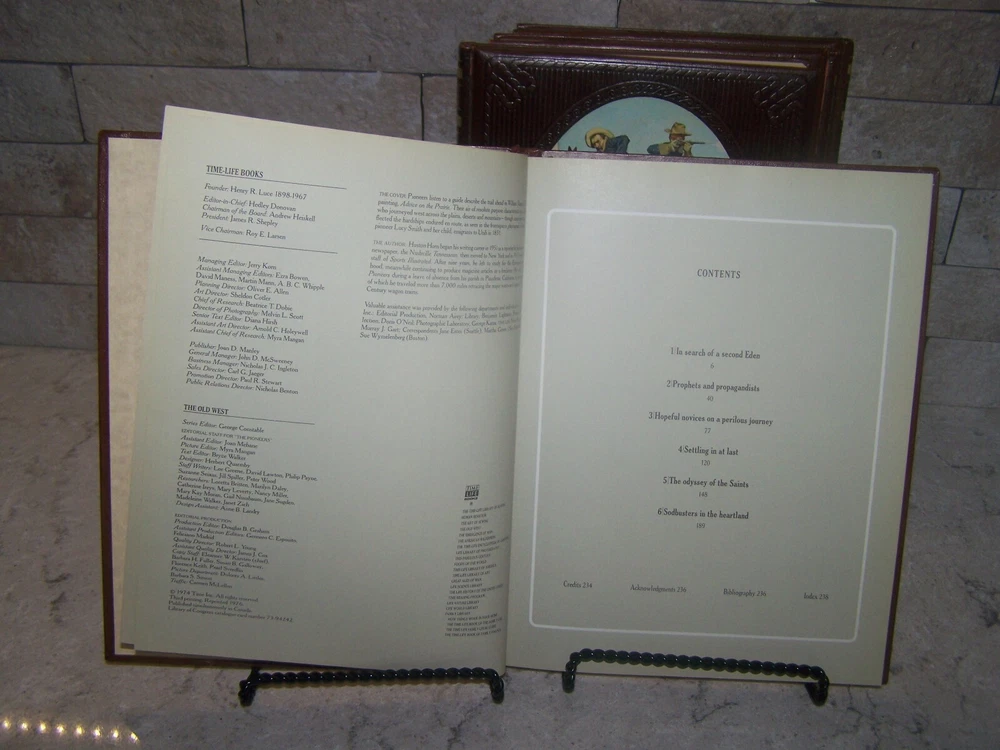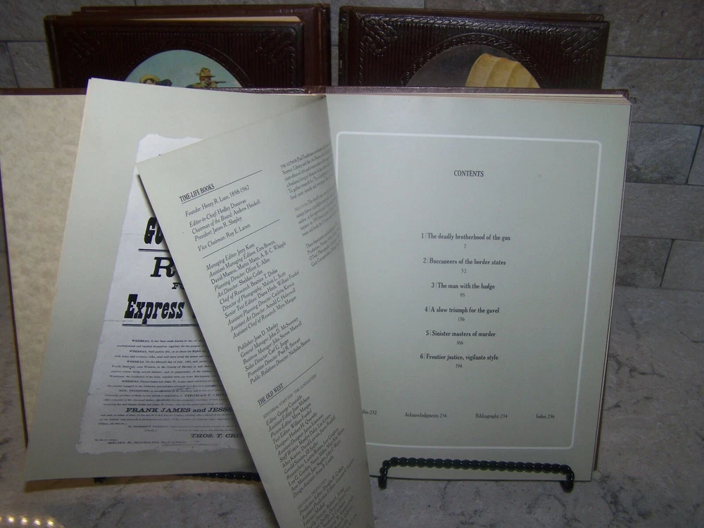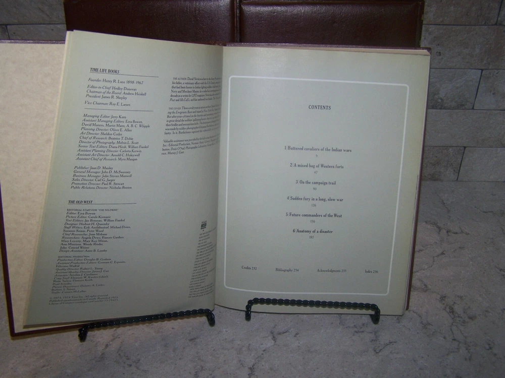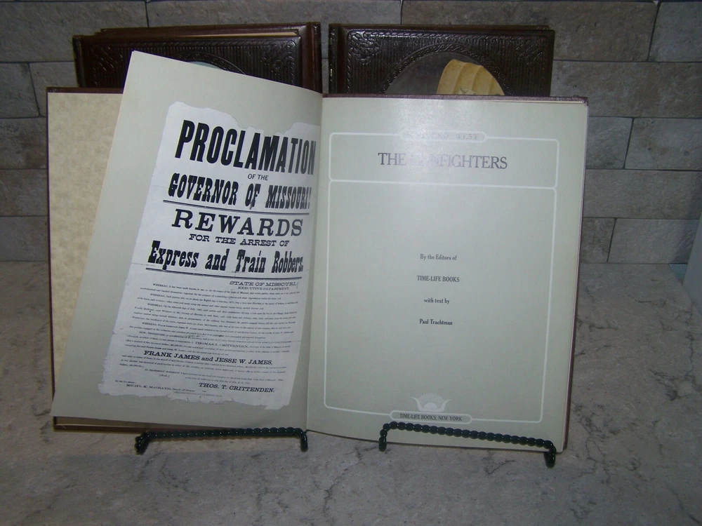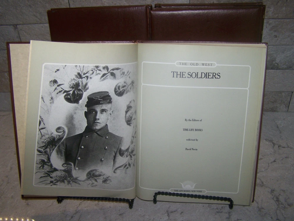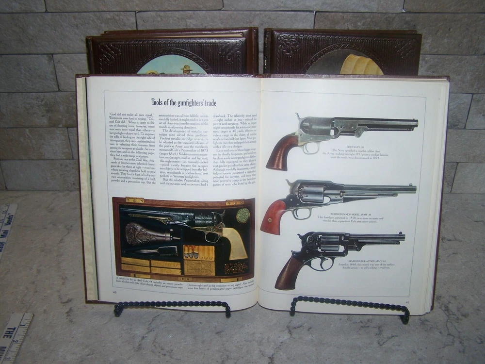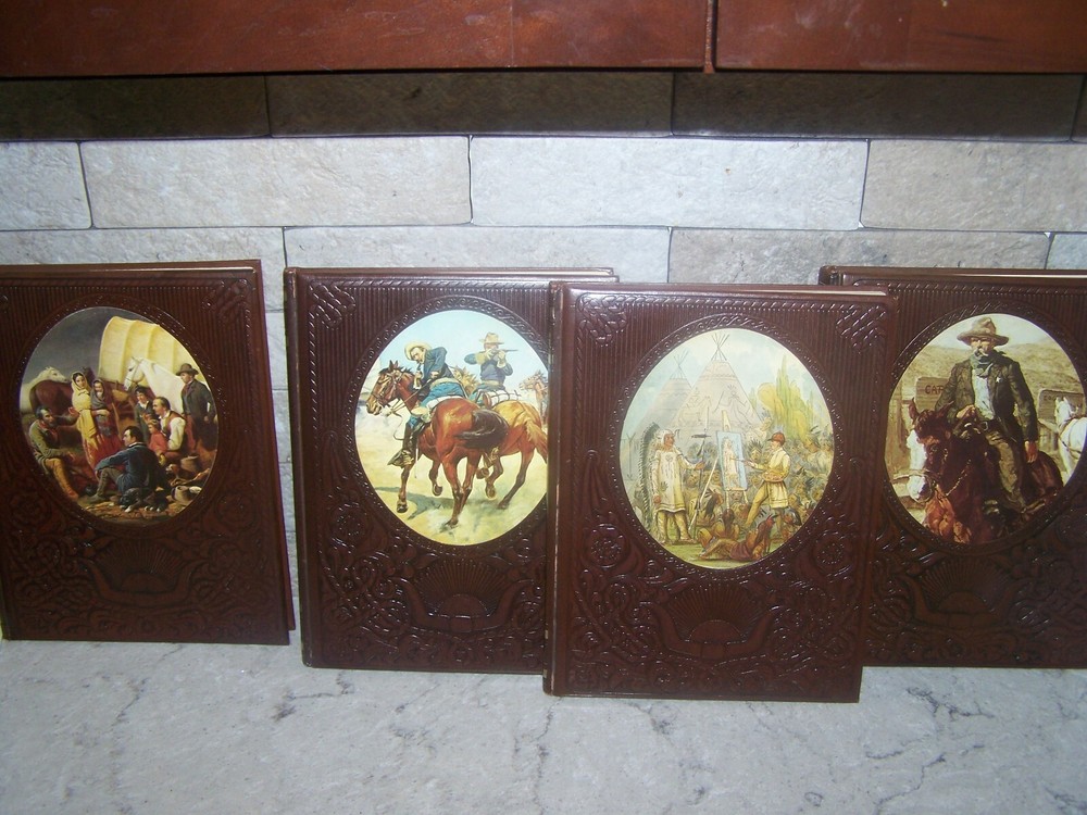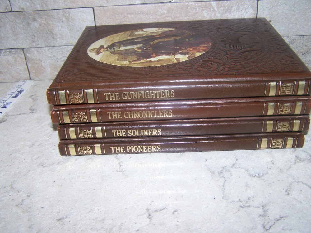 Nice 4 Volume set of Time Life's "Old West" series leatherette covered HB books. Set includes: The Gunfighters - beautiful color plates of period fire arms The Solders - color plates of soldiers in "full dress") The Pioneers - infor on religious/Morman history The Chroniclers - several color plates of "extravagant panoramas" of the wilderness to include art work by Remington and Russel Each volume highlights a specific group of people that were instrumental in settling the Old West and includes B&W photos as well as, at least, one color plate (some volumes have more). Great information for the history buff, as well. A detailed index closes each volume. All in good to excellent condition (Please see photos as they are part of the description). Easels not included. Free shipping to lower 48. A must for your old west collection.