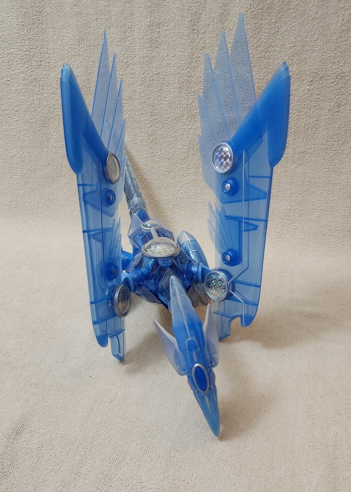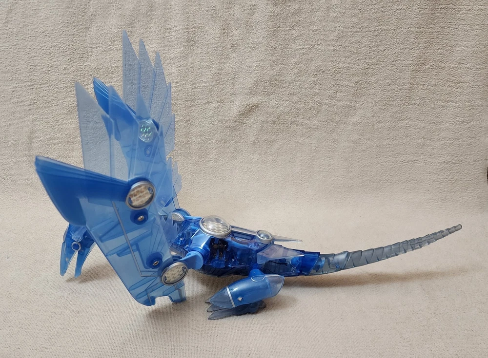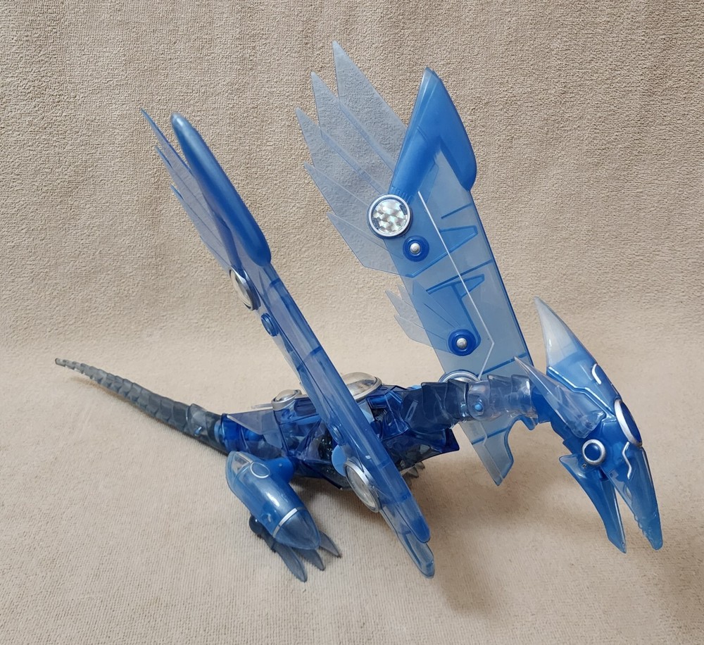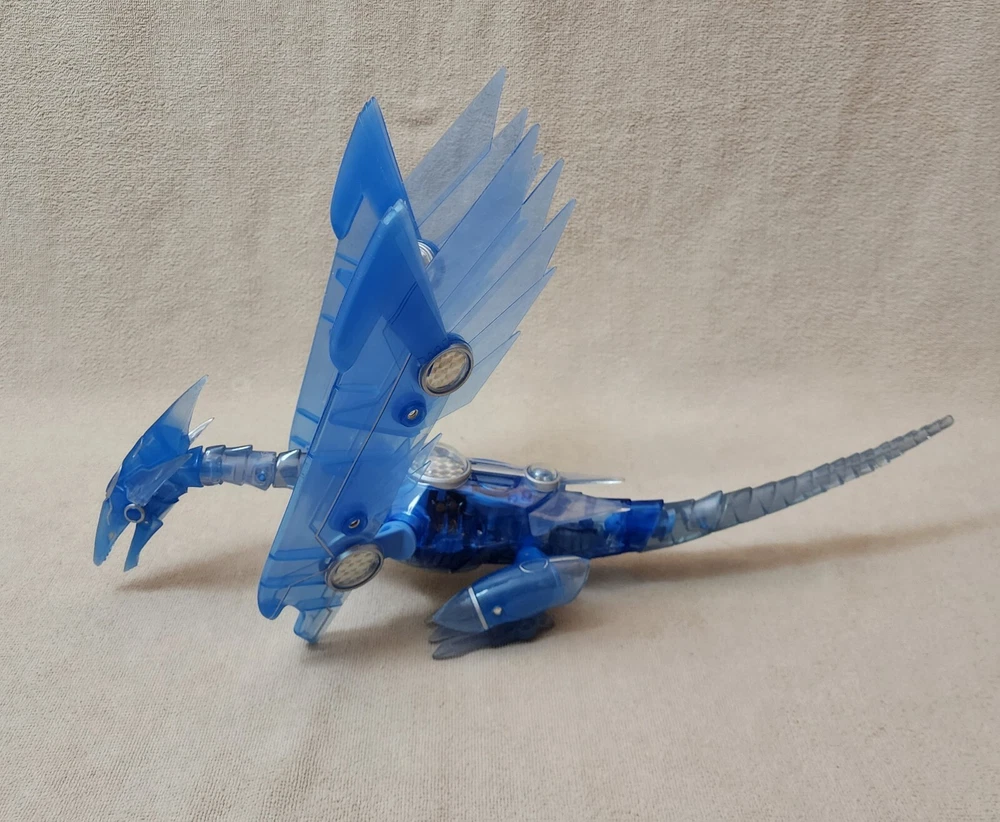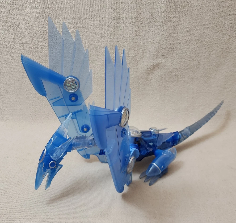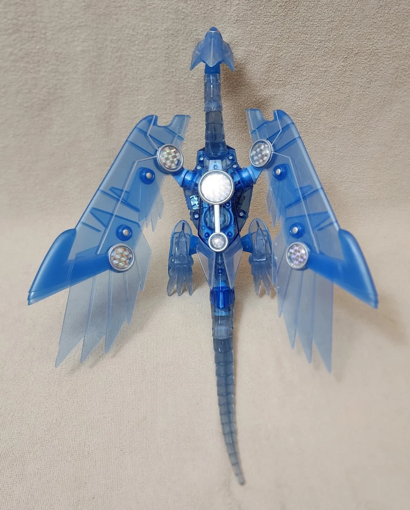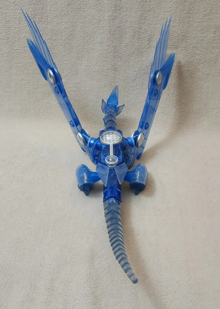 You are looking at a very gently handled vintage 1996 YU-GI-OH! Blue Eyes Shining Dragon This electronic jointed electric blue transparent dragon features a lighted belly and screeching sounds when belly is pressed and a button on its back that flips the position of its wings and feet from a flying to sitting position. Released by Mattel; copyright 1996 Kazuki Takahashi. Excellent gently handled condition with very little wear; lights and sound work. Uses 3 of the button style batteries, which are included. About 19" long and 12" wingspan.