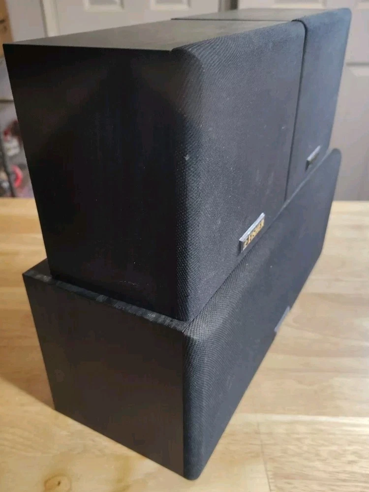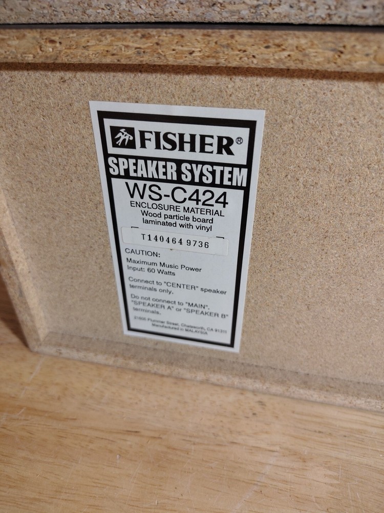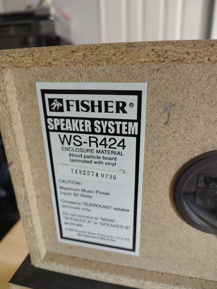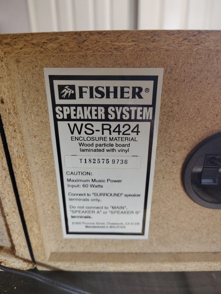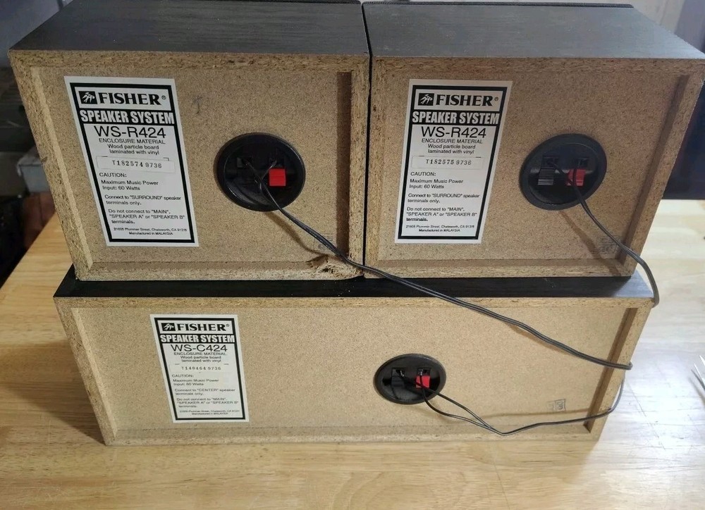 This vintage Fisher surround sound speaker system includes two WS-R424 and one WS-C424 speakers. The speakers have a rectangular shape and are made of wood. They are compatible with universal brands and models. The system configuration is unknown, but the speakers are wired and have a RMS power of 60W. The speaker system features an all-in-one design and has various aspects such as item weight and manufacturer warranty. The model is ws-r and the speakers are suitable for home audio use. This product was made in China and is being sold as-is. One surround speaker has a small spot in the back that's been damaged see last picture. Doesn't affect sound no air escapes.