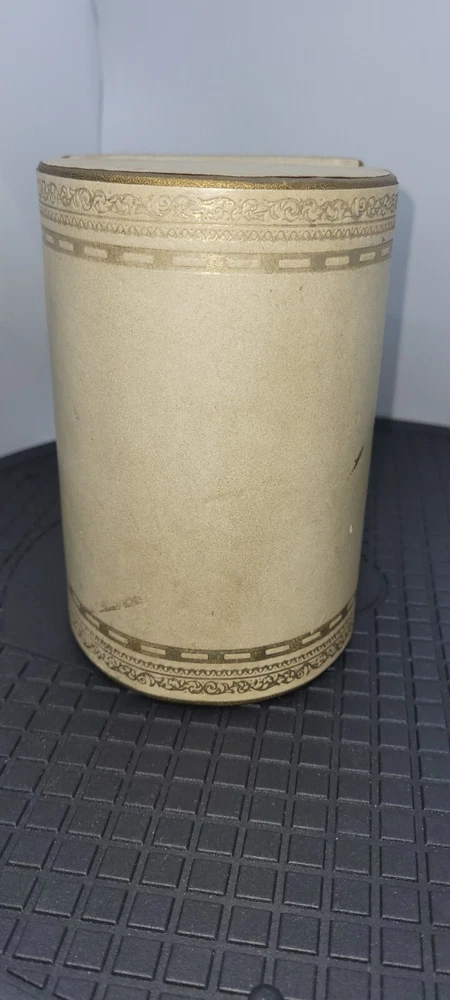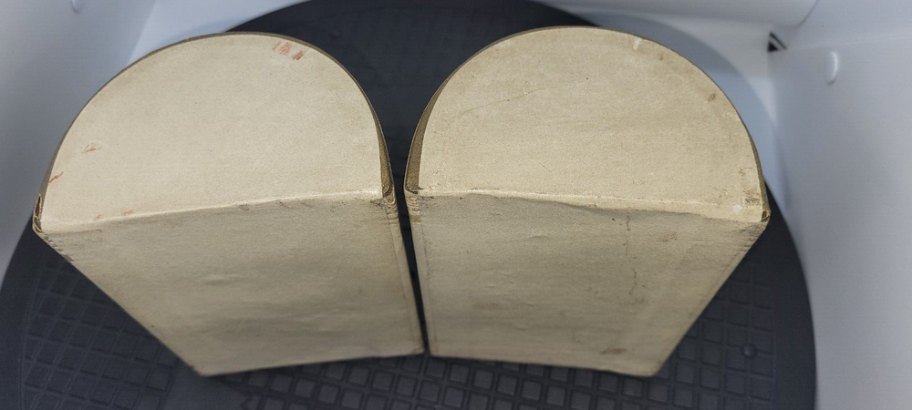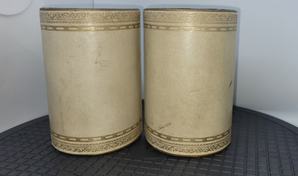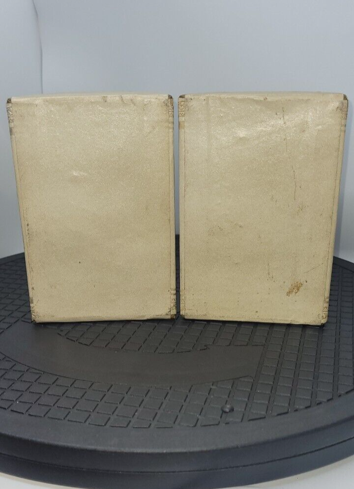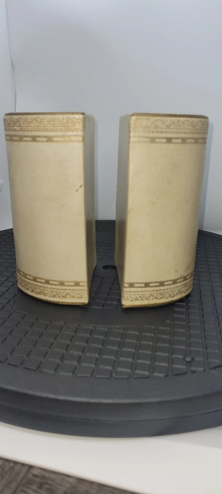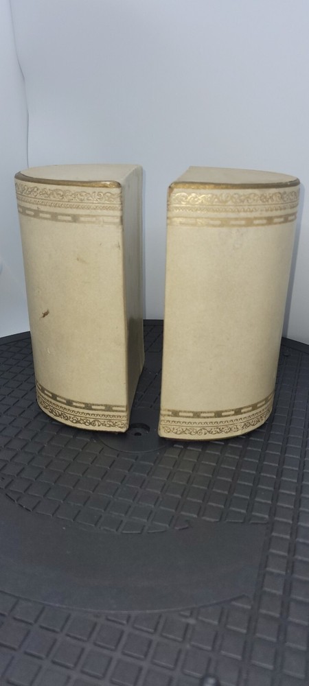 Vintage Art Deco Bookends Faux Leather Bound Gold Detailing Set Of 2 Felt Bottoms. Please see all photos as part of the description. Bookends show signs of use and age including all over stains, marks, dents, and one area on top has a slit. I did not attempt to wipe them or use any cleaners. 6" tall 4" inches W 2.75" D