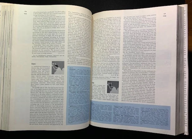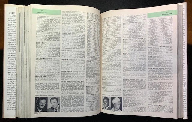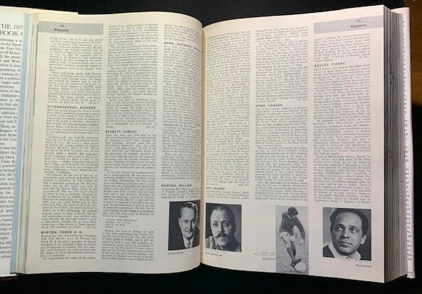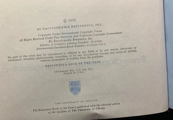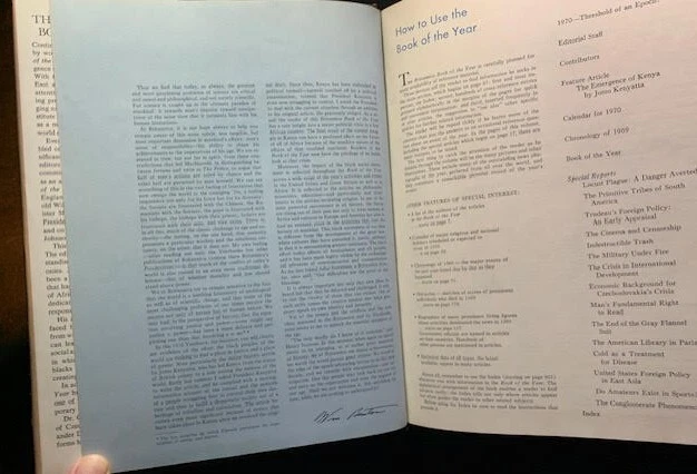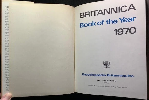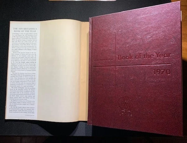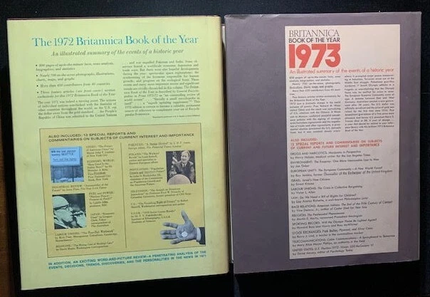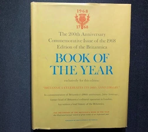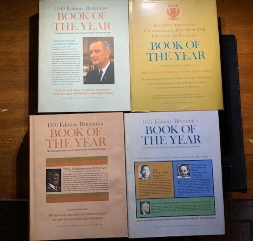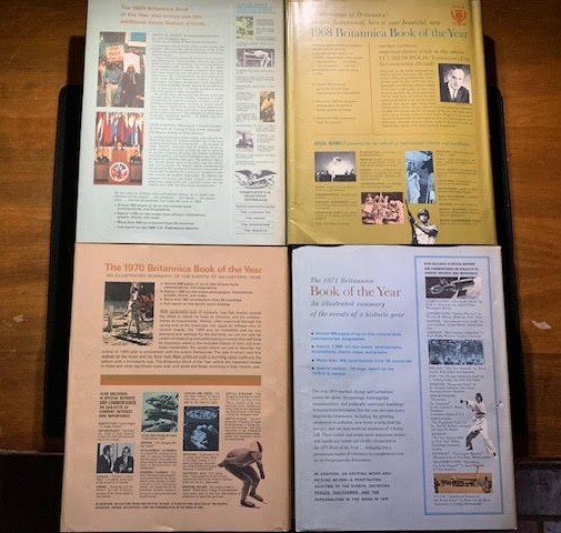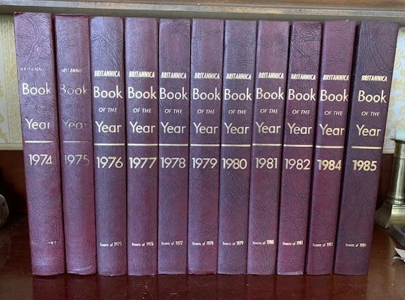 17 volumes of Britannica's Book of the Year between 1968 and 1985. 1983 has gone missing. First 6 volumes have dust jackets. Includes the 200th Anniversary edition from 1968.