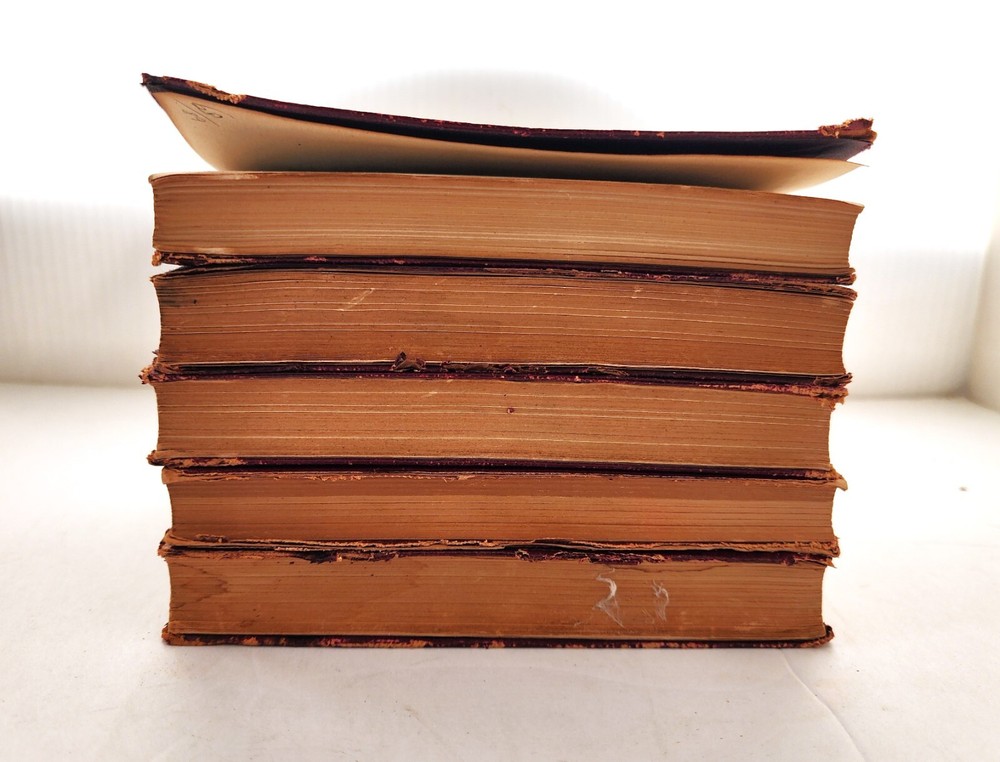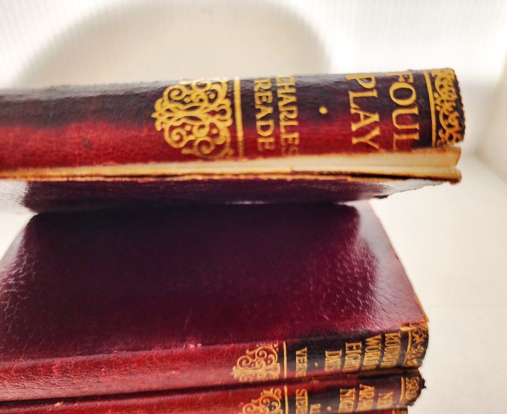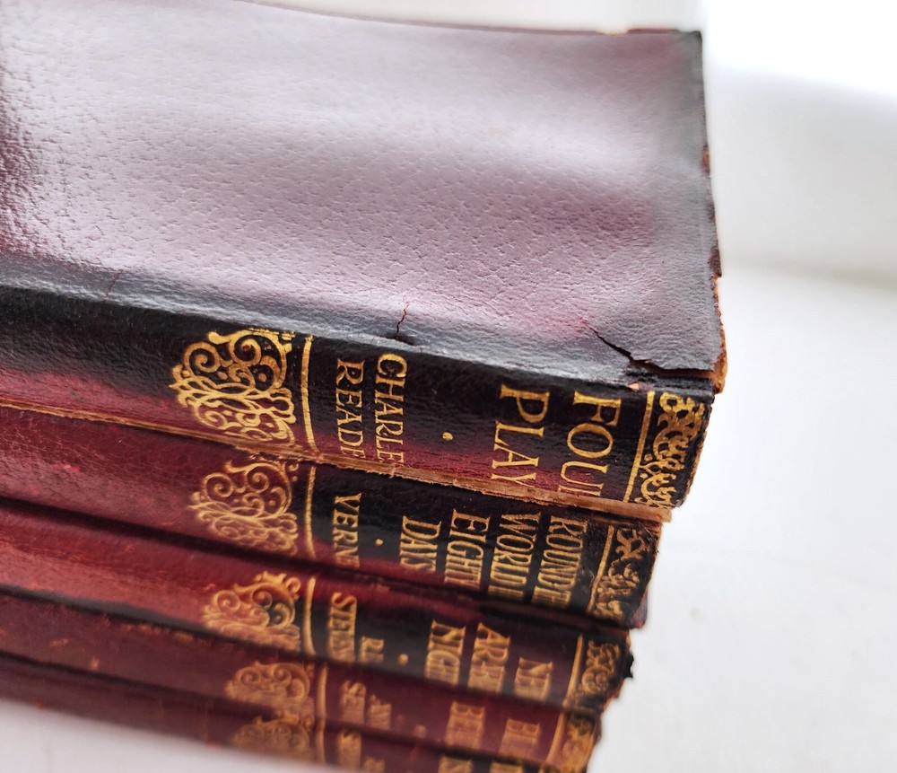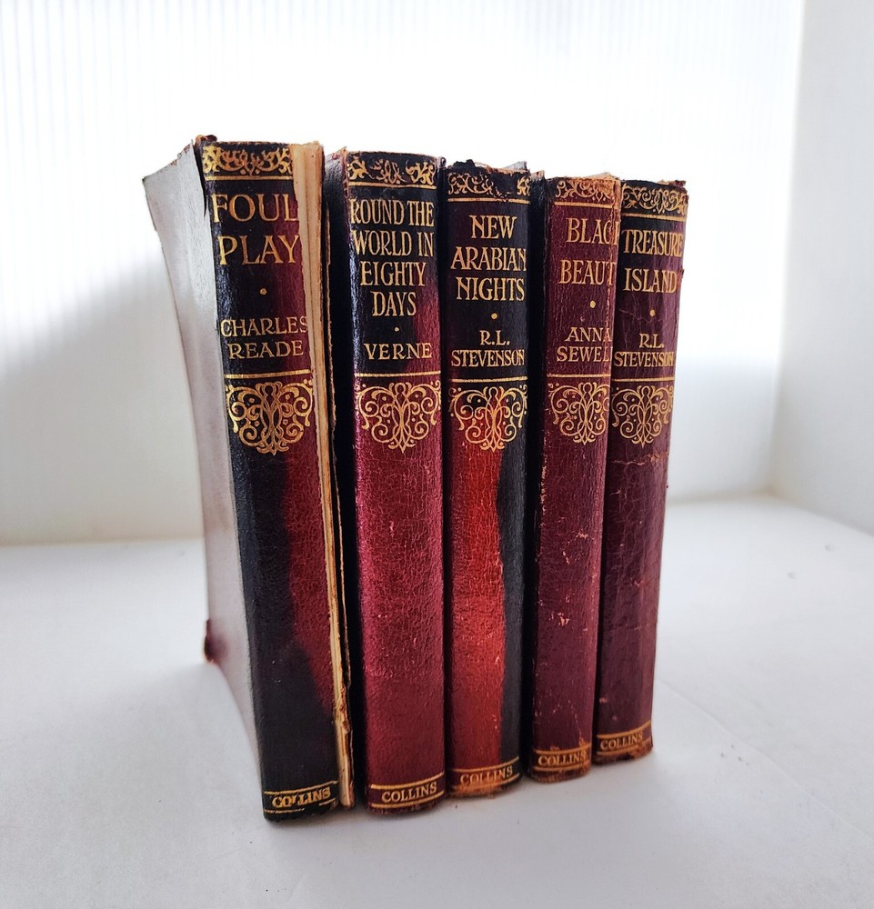 1920s/1930s Collins illustrated pocket books. Set of FIVE books. Red leather binding over paper. A beautiful gift set! In acceptable vintage condition. Leather binding does show signs of wear (cracking, warping), as do pages. These blemishes are consistent with age. Please see photos for details of condition and message me with any questions prior to purchase. Foul Play- Charles Reade Round The World In Eighty Days- Verne New Arabian Nights- R.L. Stevenson Black Beauty- Anna Sewel Treasure Island- R.L. Stevenson USPS Media Shipping included in price.