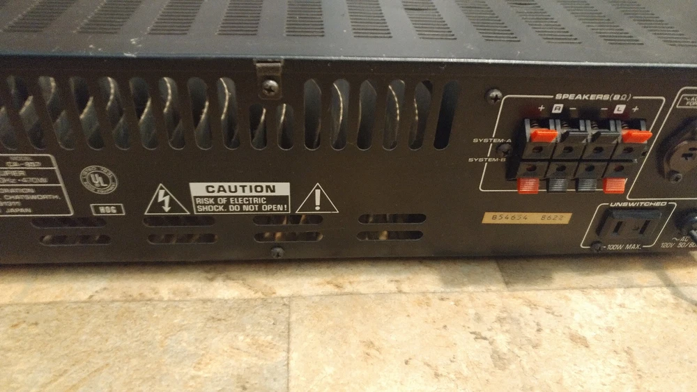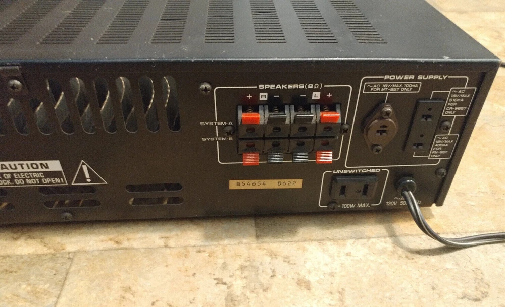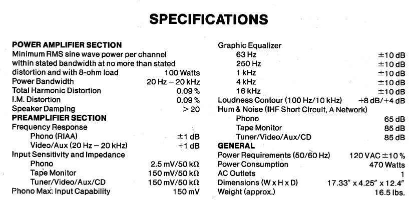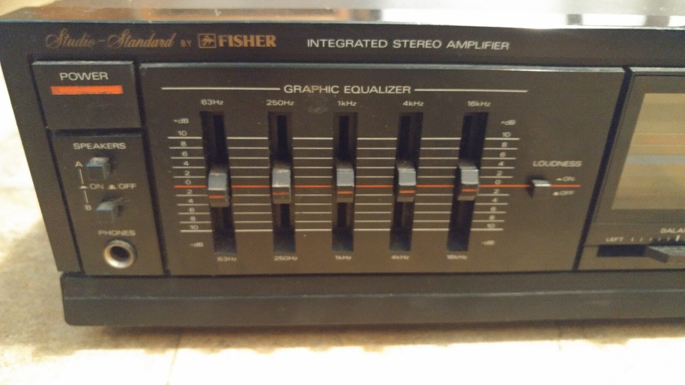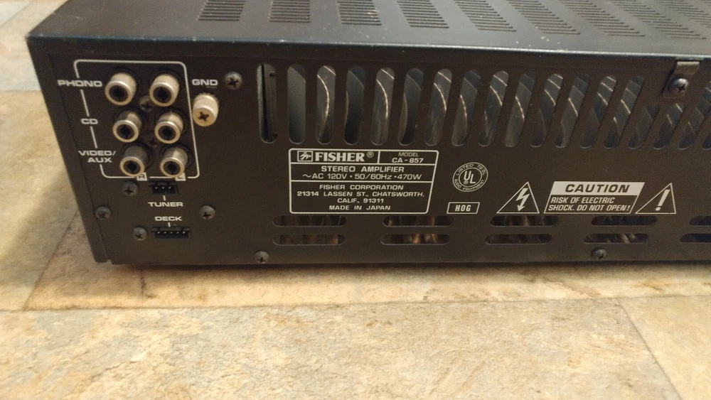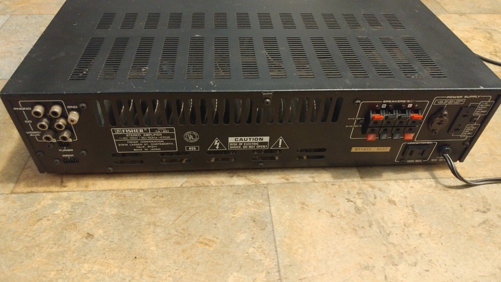 USED FISHER CA-857 Integrated Stereo Amplifier (1986) Specifications Power output: 100 watts per channel into 8Ω (stereo) Frequency response: 20Hz to 20kHz Total harmonic distortion: 0.09% Damping factor: 20 Input sensitivity: 2.5mV (MM), 150mV (line) Signal to noise ratio: 65dB (MM), 85dB (line) Dimensions: 17.33 x 4.25 x 12.4 inches Weight: 16.5lbs Year: 1986