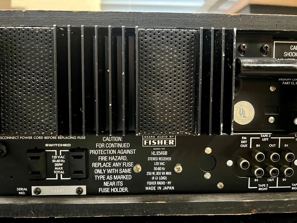 For Sale is a Fisher Model 143.92541600 AM/FM Stereo Receiver; Tested and it works great and is in very nice condition. Needs a few bulbs replaced. Because the age of this unit, Selling AS/IS with No Returns. You can see a demo here: https://youtu.be/LfqP5rONurU -Tuning range: FM, AM -Phono Input -Power output: 20-20 watts/ch into 8Ω (stereo) (couldn't find exact info) -Frequency response: 20Hz to 20kHz -Total harmonic distortion: 0.5% -Input sensitivity: 2.1mV (MM), 150mV (line) -Speaker load impedance: 8Ω (minimum) -Year: 1975 -Three sets of speaker connections (A, B & C) -Independent bass, treble, and balance control -High filter -Mono mode -Loudness contour -Easy tuning control -Vintage silver face design -Wooden case -Dimensions: 21” x 15.5” x 7” -Weight: 35 Pounds