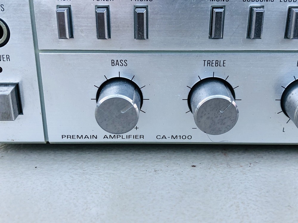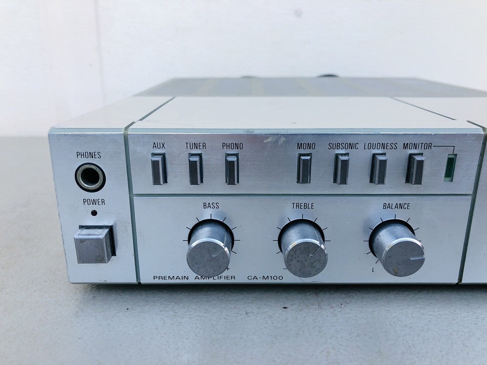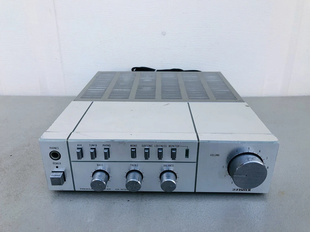Vintage Fisher Premain Amplifier CA-M100 Unit powers on but has not been tested further. AS-IS, Not fully tested. Shows normal cosmetic use and age.