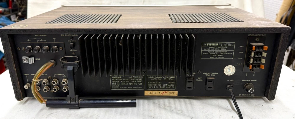 Vintage Fisher RS-2004A Stereo Receiver You are bidding on a Vintage Fisher RS-2004A Stereo Receiver (45 watts per channel into 8Ω (stereo)) Good Vintage Condition . Some static in the knobs when adjusting. Good Sound (A+B) Left & Right Speaker OUTputs have been tested. Clean Sound. **See Video** Inputs, Am/Fm Radio have been tested (All work) Front Panel has no LIGHTS*** Back Antenna Clip is broken. Small chips in the wood. Everything pictured is what is in the auction. Add $70.00 which covers shipping, handling and insurance via UPS in the 48 Contiguous United States Only. We do not ship outside of this territory. We accept PayPal. Payment by checks (which are held for a 10 day period before items are released) also accepted. We will ship 2 business day (Monday - Friday) after cleared Payment. Maryland residents and customers picking items up in person add 6% sales tax. Sales Tax will be collected by eBay where applicable. If you have any questions, please email them to us before winning the auction. We are happy to help you with any questions you may have on any of our items up for auction. Northwestern Loan Company, one of Maryland's oldest and largest pawn shops, has been under the same family ownership at the same location since 1919. We are located at 1701 Pennsylvania Avenue, Baltimore, Maryland 21217. 070872