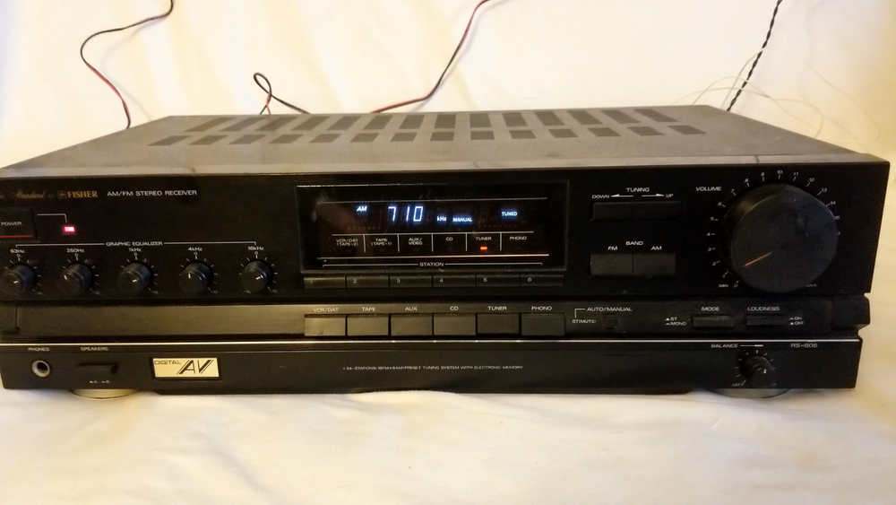 You are bidding on a Vintage Fisher RS-605 Stereo Receiver, 100 Watts. Unit power up and be able to catch AM/FM signal, audio is good. AM antenna missed the AM antenna is temporarily replaced by several rings of wire. Phone and Tape inputs tested and sound acceptable via speakers and headphones. Body have few scratches/dents. For sale Receiver only, no any cables, no manual, no AM antenna. Sold as-is as unit age. Please bid with confidence to own and, only if you intend to complete the deal. Thank you and good luck!