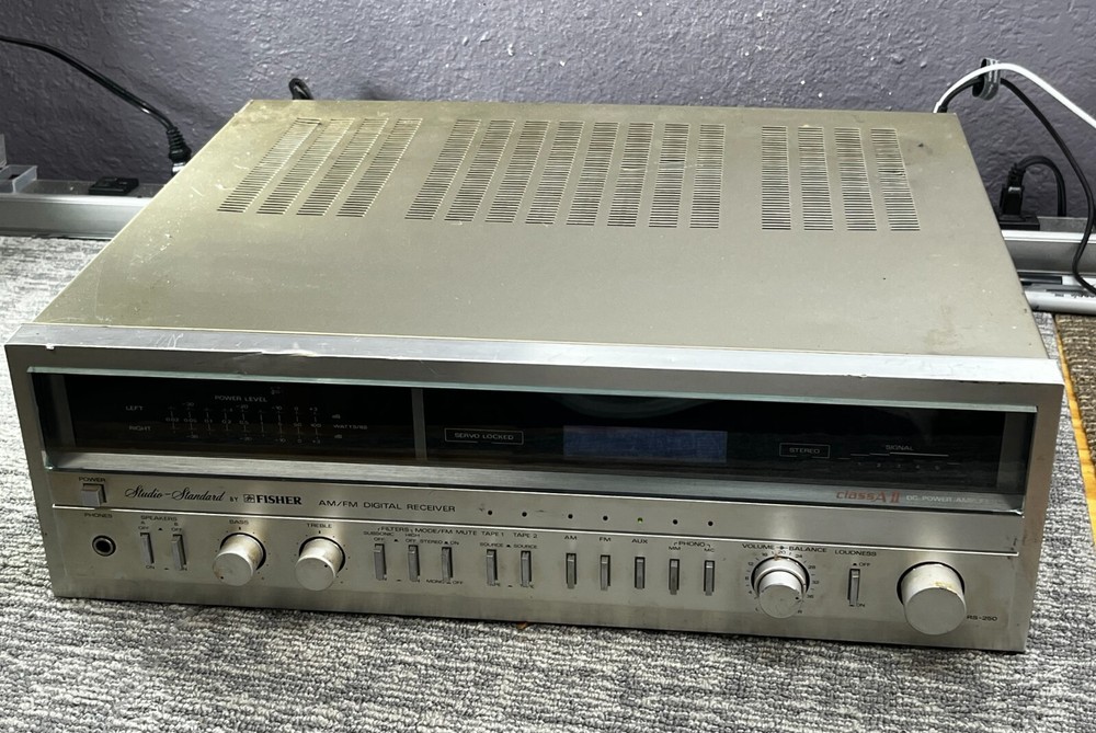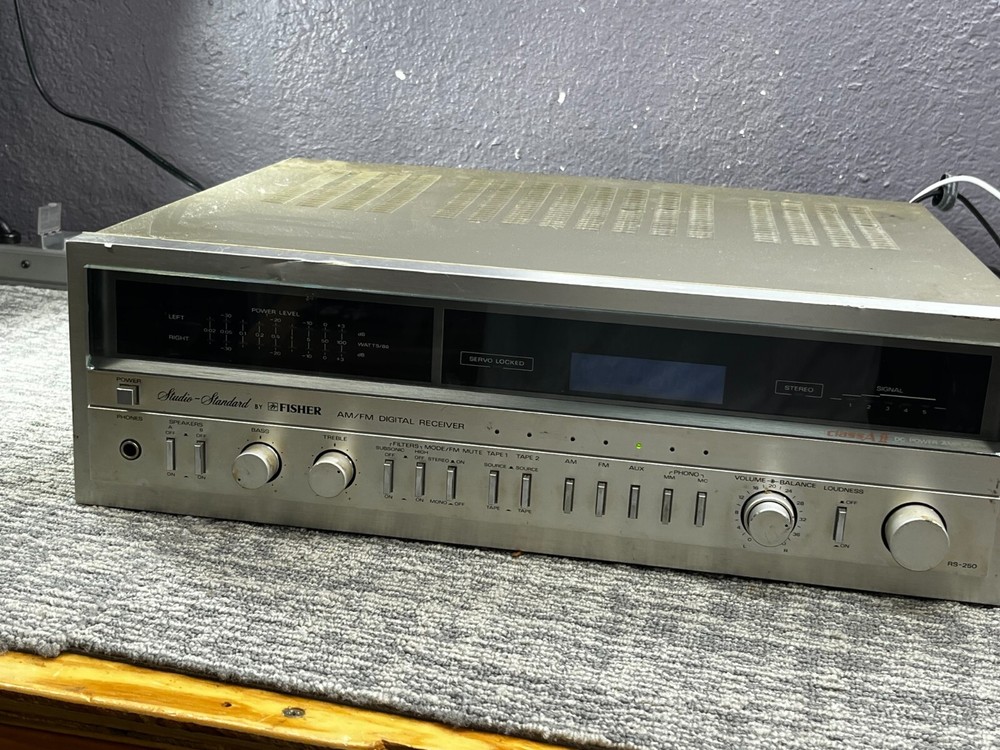 This Vintage Fisher RS-250 Studio-Standard AM/FM Stereo Receiver is in good, tested working condition. Despite its age, it performs reliably, although the clock display does not turn on. There are cut wires on the back, but this does not affect its functionality. Ideal for enthusiasts seeking a classic audio experience with a touch of vintage charm. Comes Exactly as Shown in Photos No Returns Fast Shipping !
