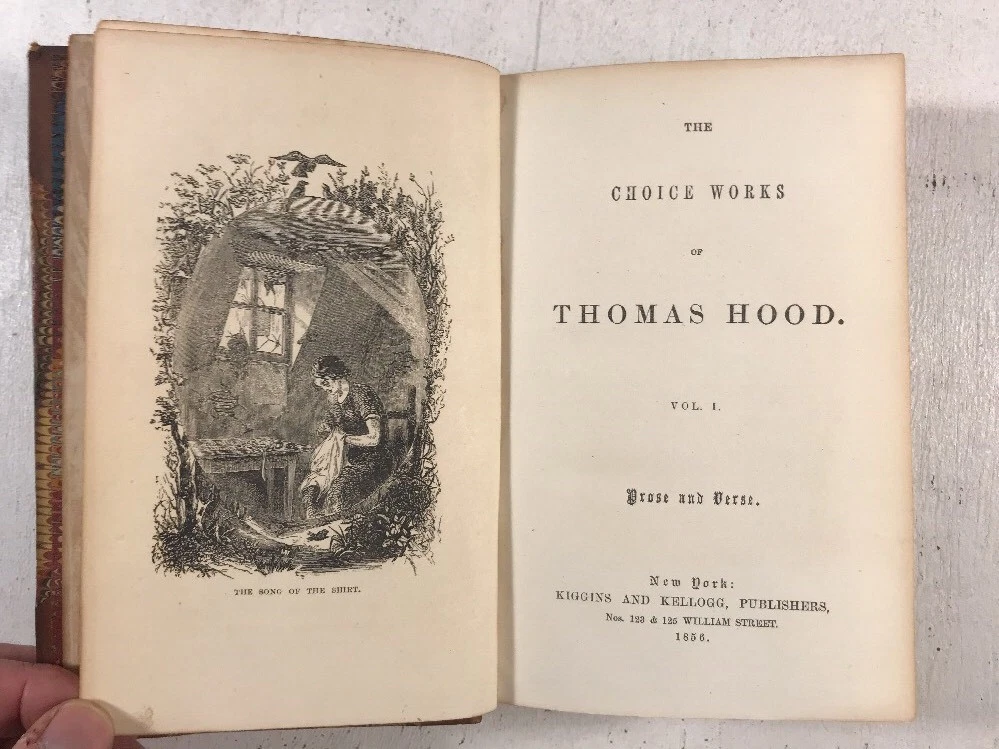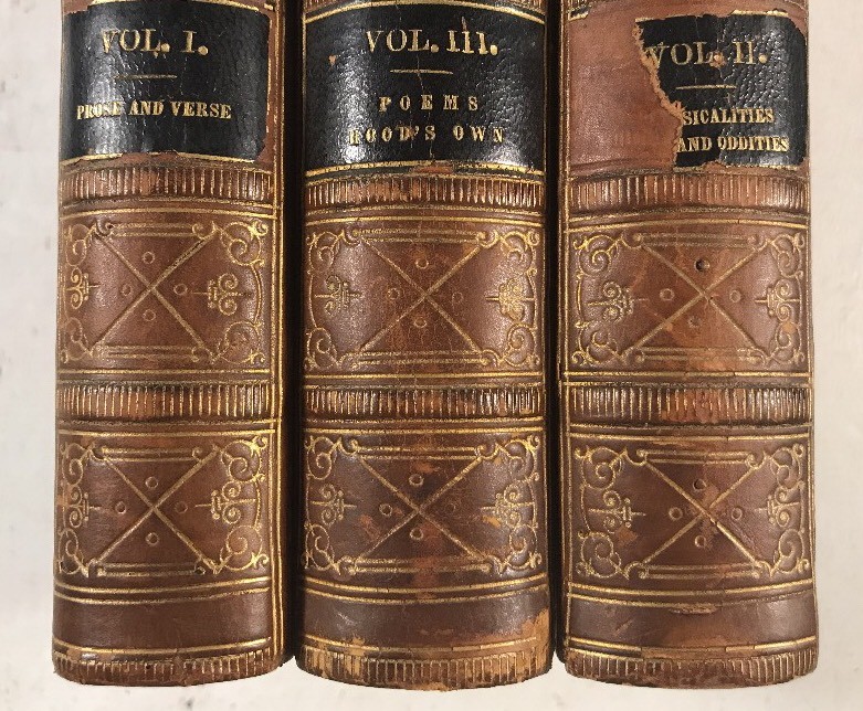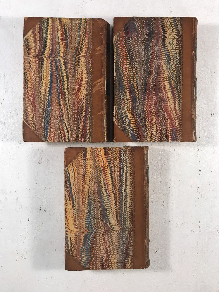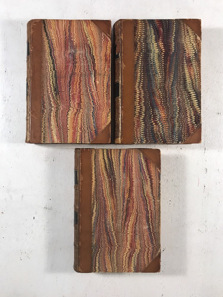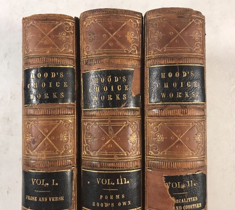 A beautiful 3 volume set of The Choice Works of Thomas Hood in a brown 3/4 leather binding. Condition: Some wear to extremities else very good vintage condition. See photos for complete description and condition. All bindings tight and sound. Publisher: Kiggins & Kellogg: New York Publication Date: 1857 Physical: 3 vols Size (inches): 7.5 x 5 x 5 inches of running shelf space Color: Brown3/4 leather with redish marble boards and marbled end sheets. Gilt titles and decorations on spine and marbled page edges. A lovely set. Language: English Please see photos for exact details and condition. Thanks for looking