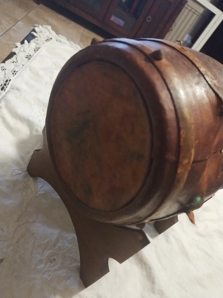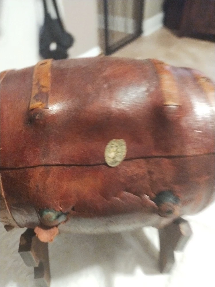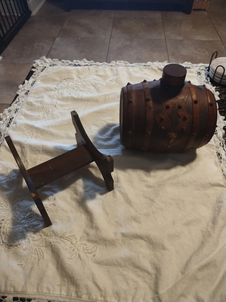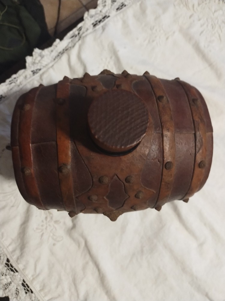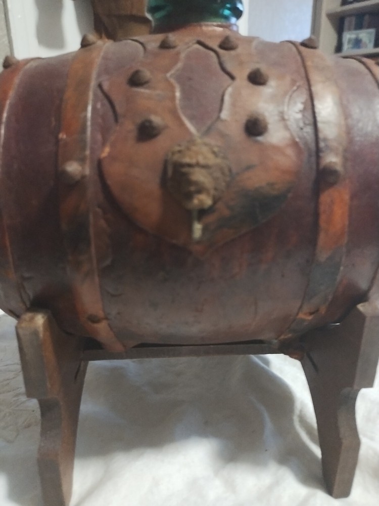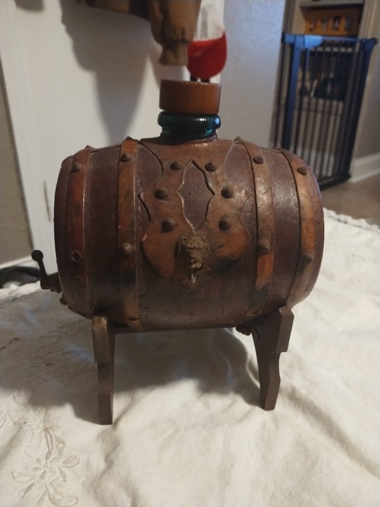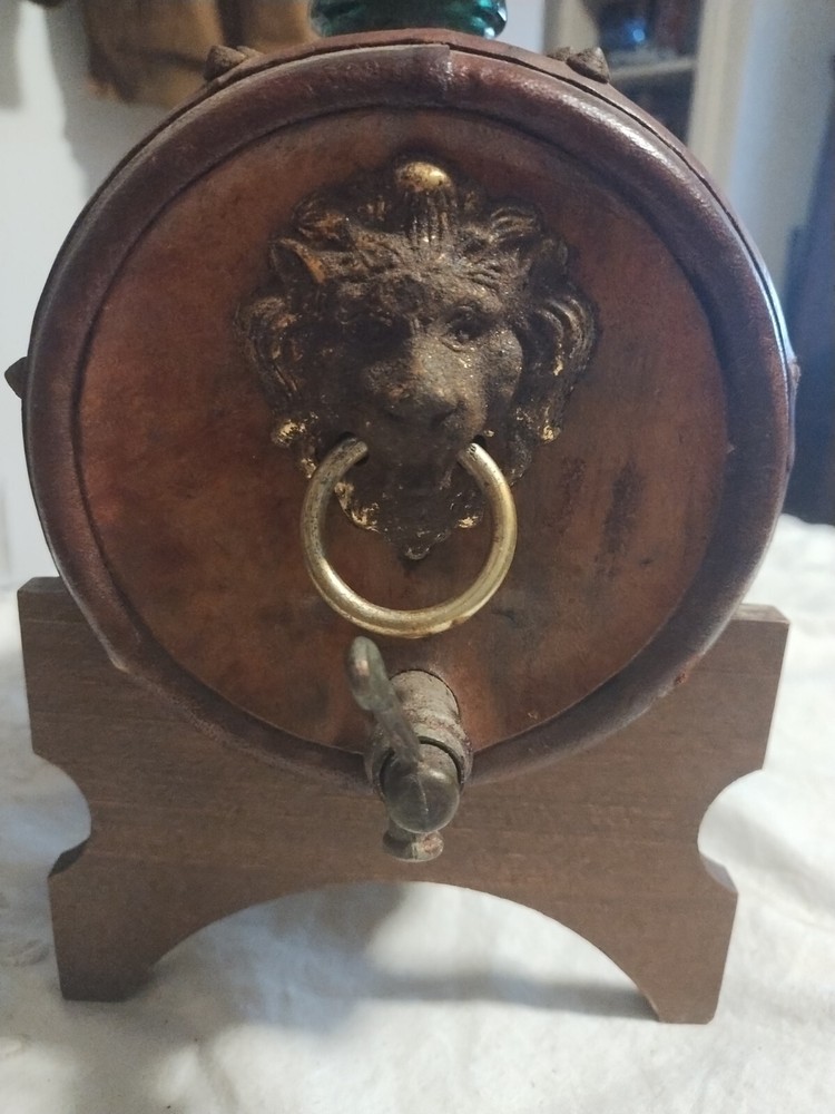 This vintage decanter set is a must-have for any barware collection. The set includes a spirit barrel and decanter, both made with a combination of wood and ceramic materials. The decanter features a unique leather-bound design with a lion crest, adding a touch of vintage charm to any occasion. With a round shape and two holes, this set is perfect for all occasions and can hold up to four items. The wooden stand provides a stylish display option. This handmade set is an original from the 1960s, making it a one-of-a-kind addition to your home. Perfect for whiskey lovers, this set is sure to impress.