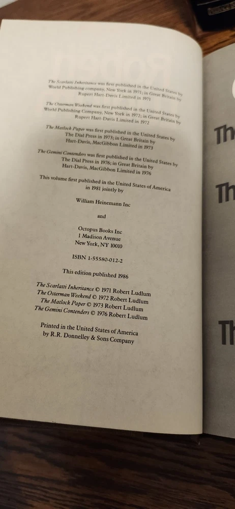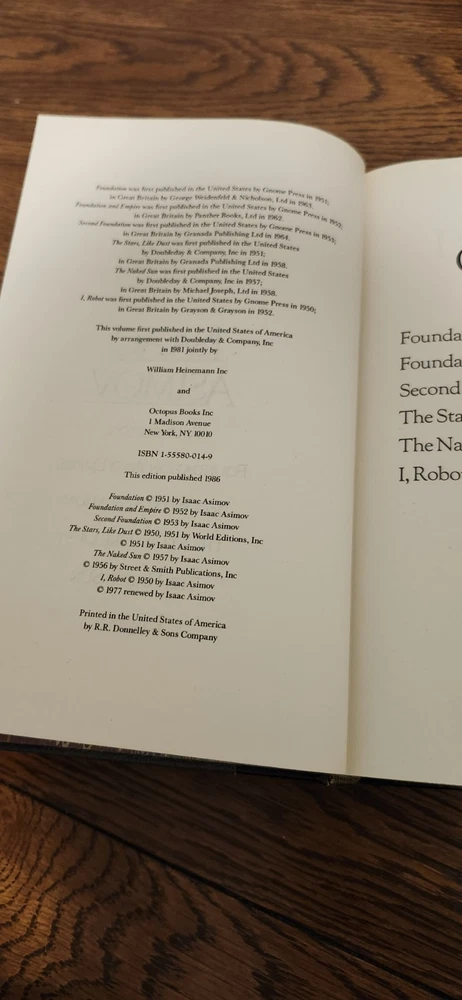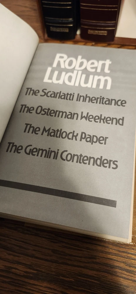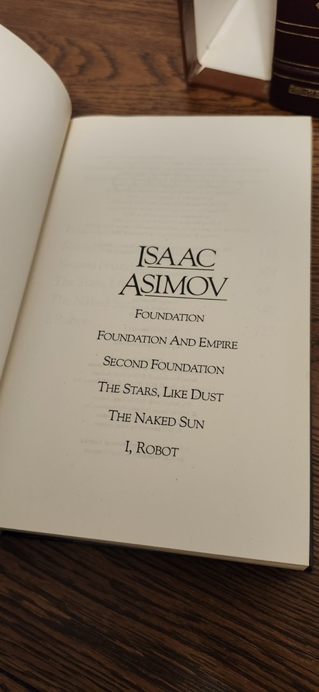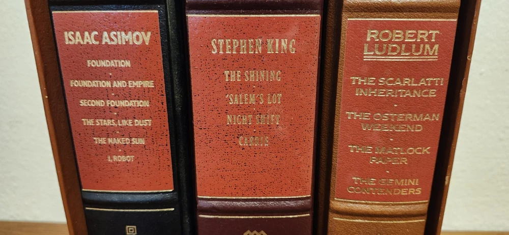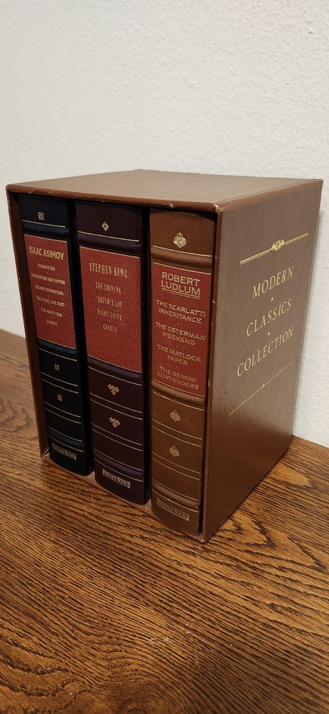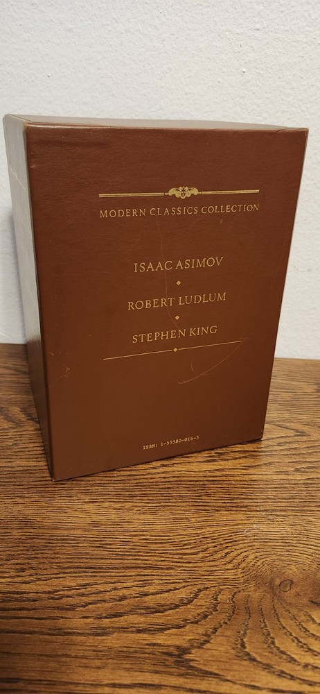 This is a collection of three modern classic books by popular authors Stephen King, Isaac Asimov, and Robert Ludlum. The books are leather bound and were published by Peerage Books in 1987. They are written in English and are original prints from the United States. Super cool set. All books are in good condition. See pics for more details and condition. All sales are final. No returns.