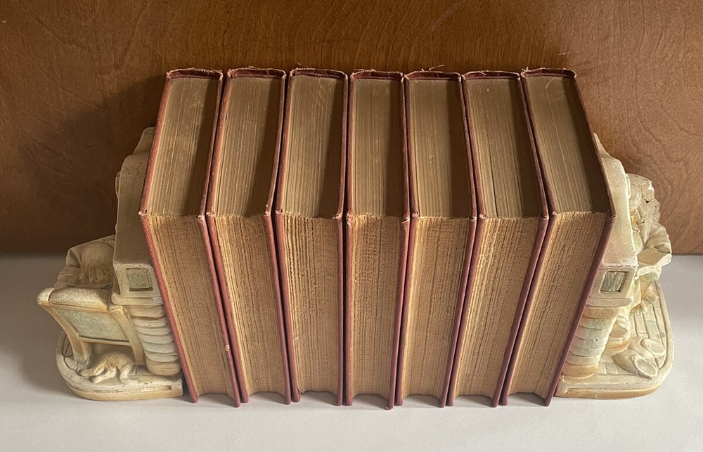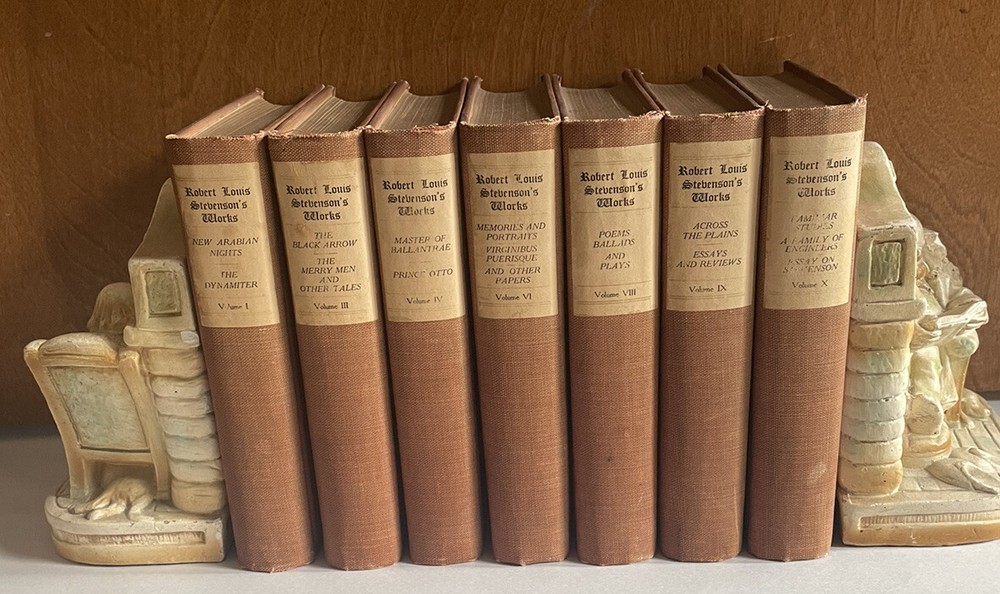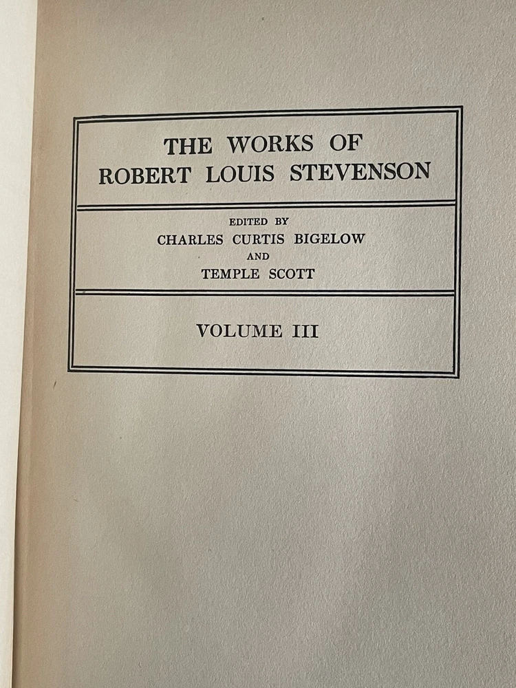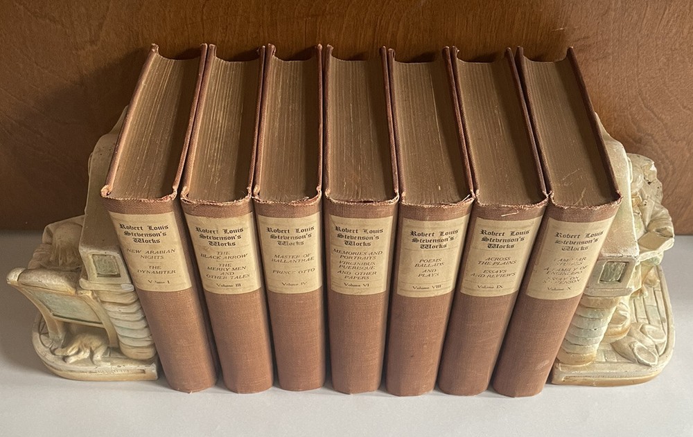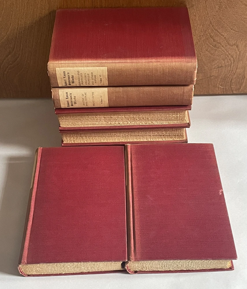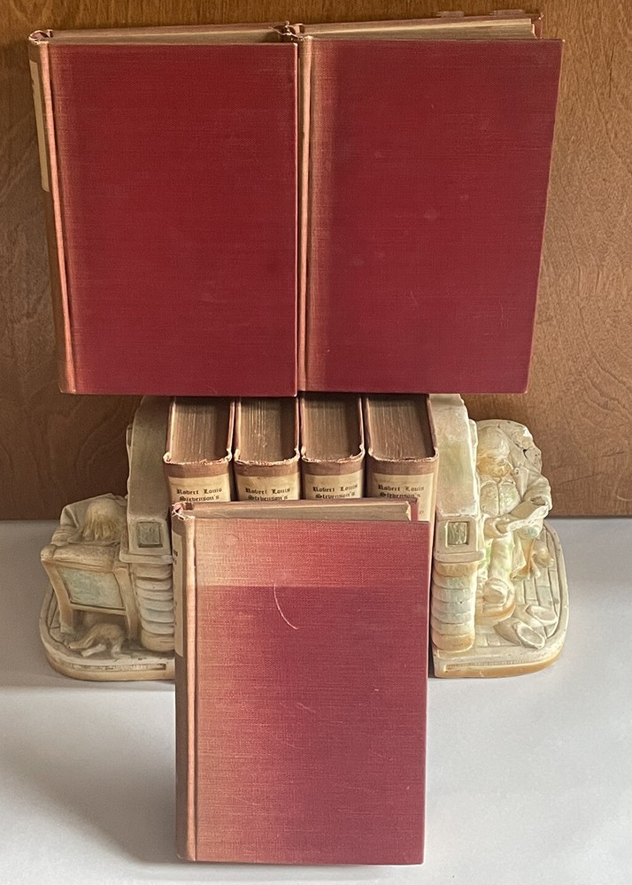 Vintage Partial Set Of. Robert Louis Stevenson’s Works. The Jefferson Press HC. Books are in good condition. Books have tight bindings, clean, unmarked and crisp pages. Wear to covers from aging as well as some discoloration on spine. Printing error some of the pages are not separate at the bottom. It does not affect the reading (see pictures)