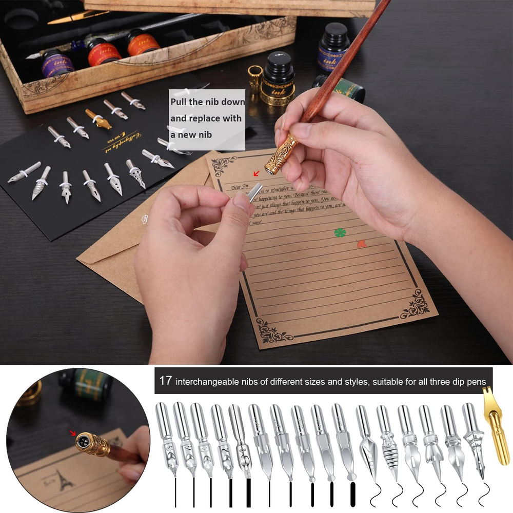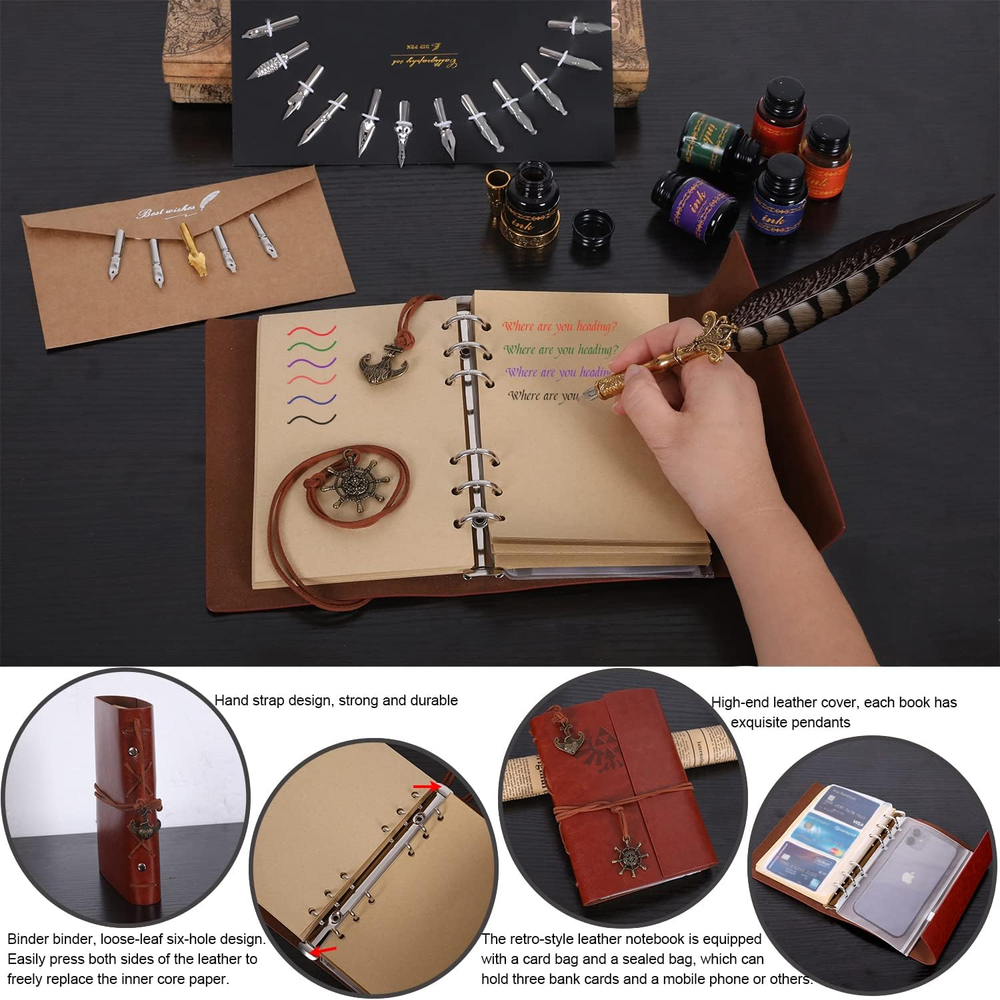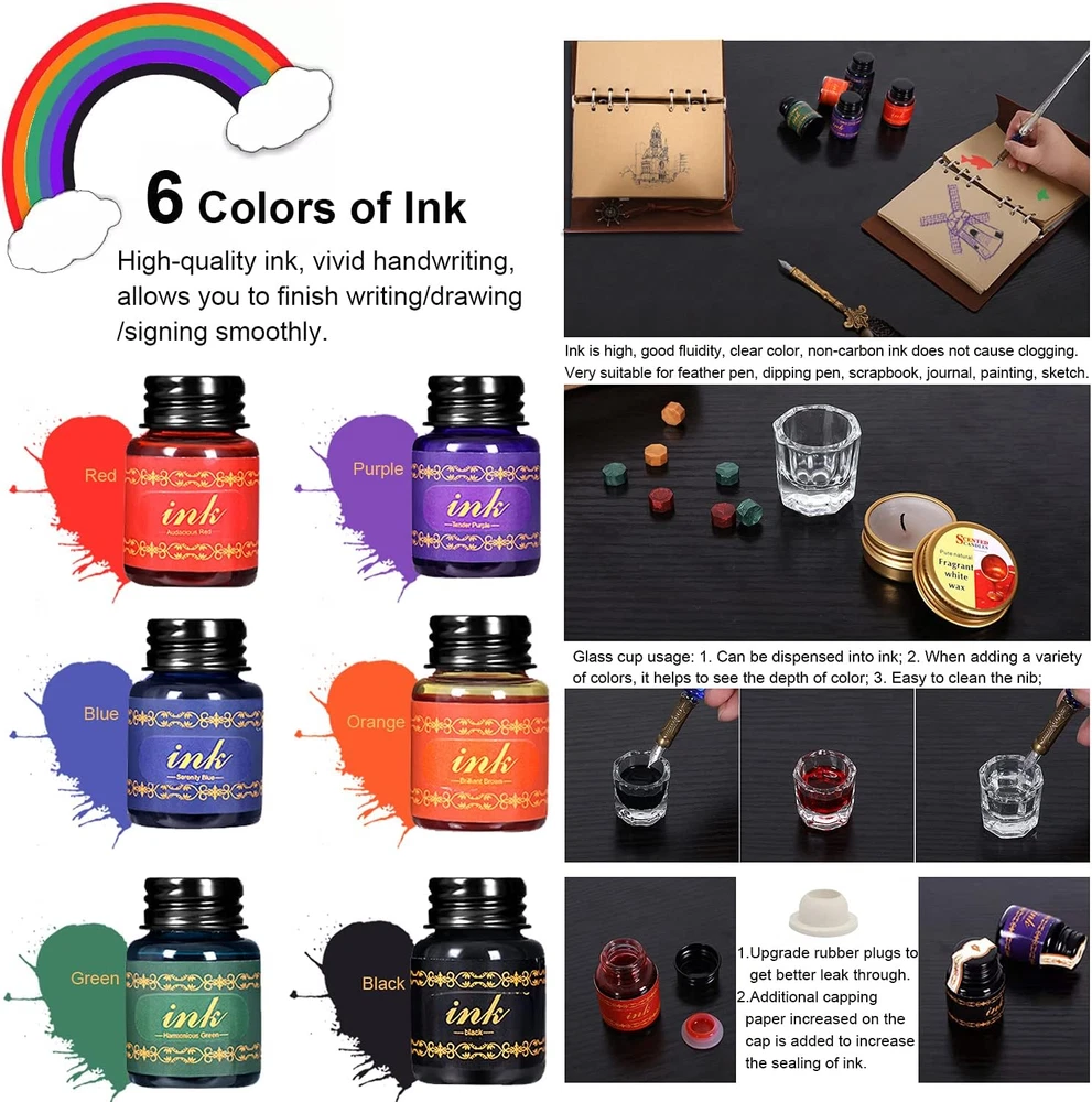 Store New Arrivals Add to Favorite View Feedback Contact Vintage Pheasant Quill Pen Ink Set,Feather Dip Pen Set with Classic Spiral Bound Leather Notebook,Beginners Glass Dip Pen Wood Calligraphy Pen Craft Decoration Pen,Best Gift Kit for Writing,Drawing Description Closure Snap Item Weight 2.4 pounds Style Pheasant Writing Instrument Form Dip Pen Number of Items 1 Color Glass Material Type Wood, Glass, Feather, Leather Line Size 0.3mm Ink Color Gold Age Range (Description) Kid, Adult Point Type Thick Package Dimensions 12.48 x 10.75 x 3.27 inches Size 1 Count (Pack of 1) 【Complete Feather Pen Set】Includes 3 dip pens, leather notebook, 17nibs,1 bottle of wax-sealing beads (about 50) tea wax anti-scalding spoon stamps and craft decoration pens, glass cup, 6*ink, pen holder, letter paper envelope and opening tools.Feathers on each feather pen are natural, special technology manufactures. The Antique wooden calligraphy pen and glass dip pen are made of high-quality material, and since the pen is manually manufactured, each dip pen is unique.You will like it! 【17 Nib】Including test salad strip of a 4mm gold parallel nib.5 special double rounded decorative nibs,perfect for creating serif letters without thick or thin lines.5 flat nibs,suitable for writing Gothic. 6 flexible pointed, suitable for writing round fonts, swash.Replace nibs only need to pull out the old nib and insert the new nib. All nibs are compatible with each calligraphy pens,writing smoothly and easy to clean.Beginners try different nibs to find the best nib for writing or drawing. 【Quill Pen Ink Set】 Keyboard typing is the norm, the opportunity to write with a pen becomes priceless. Through the real friction of these unique pheasant quill pens and 2 dip pens with paper, you can bring you a different writing experience, and you can awaken the long-lost writing pleasure in your memory. It is also equipped with 6 bottles of different colors of ink, which are bright in color and will not fade for a long time. The set is a decent and meaningful gift for family and children. 【DIY Wax Seal Kit】Octagonal sealing wax beads include green, red and yellow. The cut shape is neat and beautiful, which is convenient for different purposes. You can DIY mix different colors to get interesting wax seal pattern, and add special wax seal to your specific private object, suitable for making invitations, letters, manuscripts, maps, gift seals, wine seals, and other craft projects. You can also use silver craft decoration pens to describe the pattern to make it more unique. 【Quill Pen Set with Leather Notebook】Journal notebook are made of high-quality PU leather, soft to the touch, durable, binder design, A5 size leather notebook is easy to carry.Can be used as a diary, travel journal, drawing notebook. Both the cover and the insert will give you a permanent memory. If you have any questions about our feather pen and ink set with notebook, please feel free to leave us a message. If you are not satisfied, we will or replace your feather pen set. Product Description Feather pen ink set with classic spiral bound leather notebook This is a versatile quill pen set, it can be used as a feather pen ink set/a drawing set with a notebook/a calligraphy pen set/a wax seal set. This quill pen and ink set is an exquisite/decent/retro gift, suitable as a birthday gift/meeting gift, can be used for birthday/father’s day/mother’s day/valentine’s day/Christmas/Halloween/Thanksgiving/Easter and other holidays Decent gift Classic spiral leather bound notebook/handbook/diary/sketch book/travel journal notebook Record beautiful things and enjoy the fun of life. The included classic spiral leather bound notebook is matched with three retro dip pens and 6-color ink. The complete set allows you to easily record everything romantic and beautiful in your life. The leather notebook looks retro and exquisite, and the inside is blank kraft paper. You can use it for drawing/handbooking/recording life. Various colors of ink allow you to create at will, which is conducive to stimulating children's creativity. Vintage pheasant feather pen 6 color ink set This quill pen ink set contains 6 different colors of ink. The ink is bright in color and will not fade for a long time. It is very suitable for you to use for writing, drawing, signing, etc. You will like it! When you need to change different colors of ink, you can use a glass cleaning cup to clean the nib. Of course, you can also use a glass cup to hold the ink for color toning. Its transparency can help you judge the depth of the color. The 17 different styles of nibs are 0.5 mm to 5 mm in size. The nibs of the three dipping pens can be replaced, so that you can write smoothly and keep you happy during the process of practicing calligraphy.including 1 parallel nib with 4mm gold test salad strip. 5 special double silver rounded decorative nibs, perfect for creating serif letters without thick or thin lines.5 flat nibs, suitable for writing Gothic. 6 flexible pointed, suitable for writing round fonts, swash, etc. Just hold the nib and pull it down to easily replace the nib. After using the pen tip, please clean it in time. 3 dip pens and quill pens wax seal stamp kit You can choose to DIY melt one or more of the three-color wax beads (yellow, green, red) into a new color by yourself, and the handle of the melting spoon is designed for anti-scalding to protect your hands, please assured use. When you give a letter or item with a wax seal to a friend, it is not only beautiful, but also privacy.After wax sealing, you can use a silver decorative pen to depict the pattern of the seal, it will make your wax seal look more advanced / more refined / more unique. 3-color wax sealing beads DIY wax seal kit Vintage calligraphy pen set This feather pen 6-color ink set with leather notebook is suitable for calligraphy lovers and professionals of all ages over 7 years old Packing list: 1x feather pen ;1x wooden pen ;1
