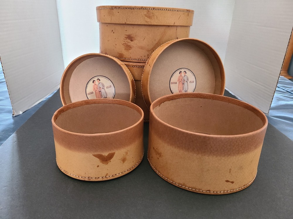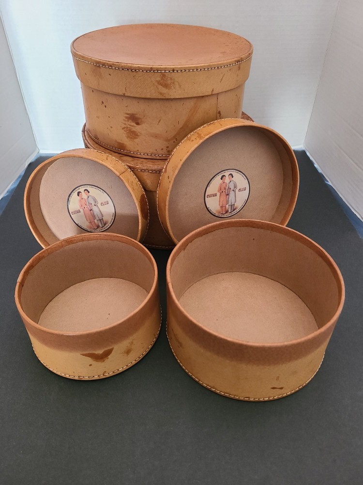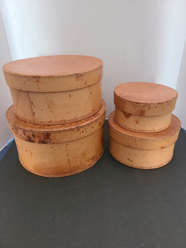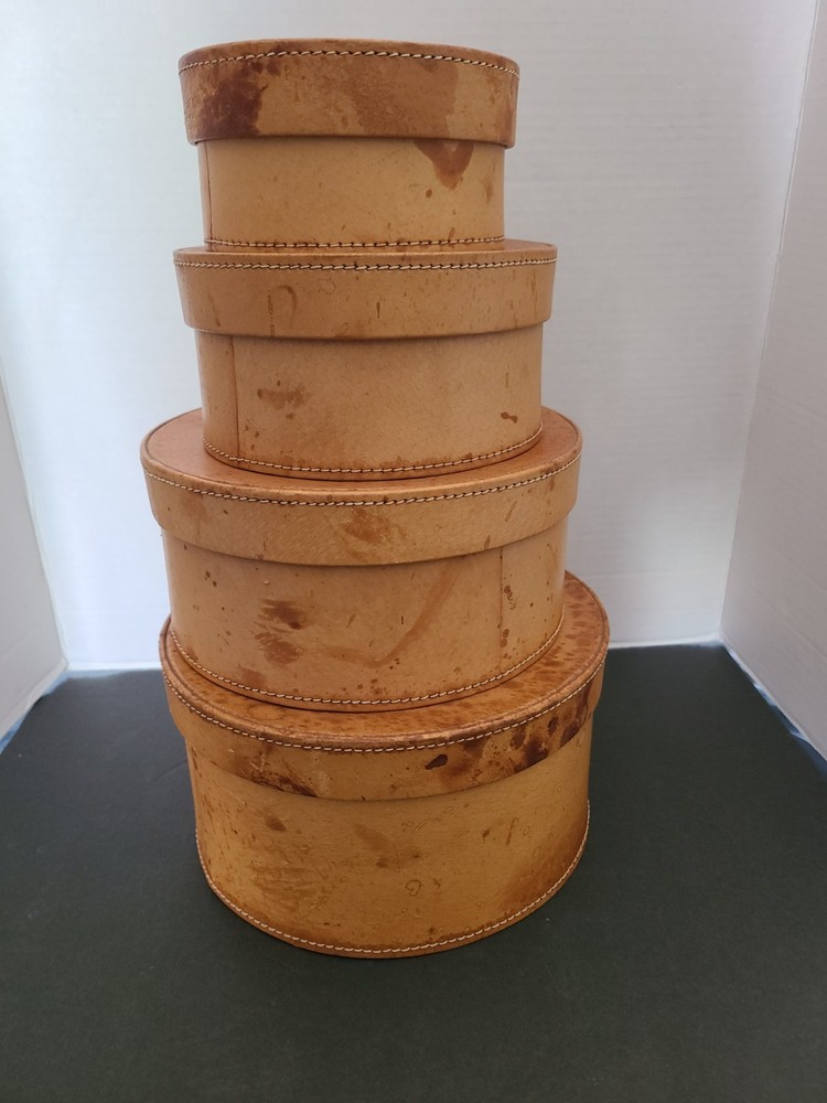 Crafted with an appreciation for timeless aesthetics, this set of four round leather-bound (possibly faux leather) nesting boxes presents a vintage charm that complements any antique-style decor. Each box is meticulously designed with a rich brown camel tan leather (possibly faux leather), enhancing its classic appeal. The stackable feature allows for convenient storage and display, effortlessly blending functionality with elegance. These nesting boxes are a testament to exquisite craftsmanship, perfect for those who cherish the beauty and the practicality of well-designed storage solutions. Their antique style evokes a sense of nostalgia, making them not just practical items but also cherished collectibles. Whether for organizing treasured keepsakes or as decorative pieces, these boxes are a versatile addition to any home.