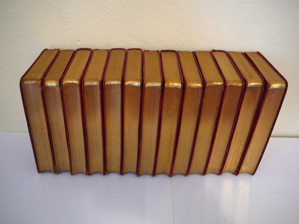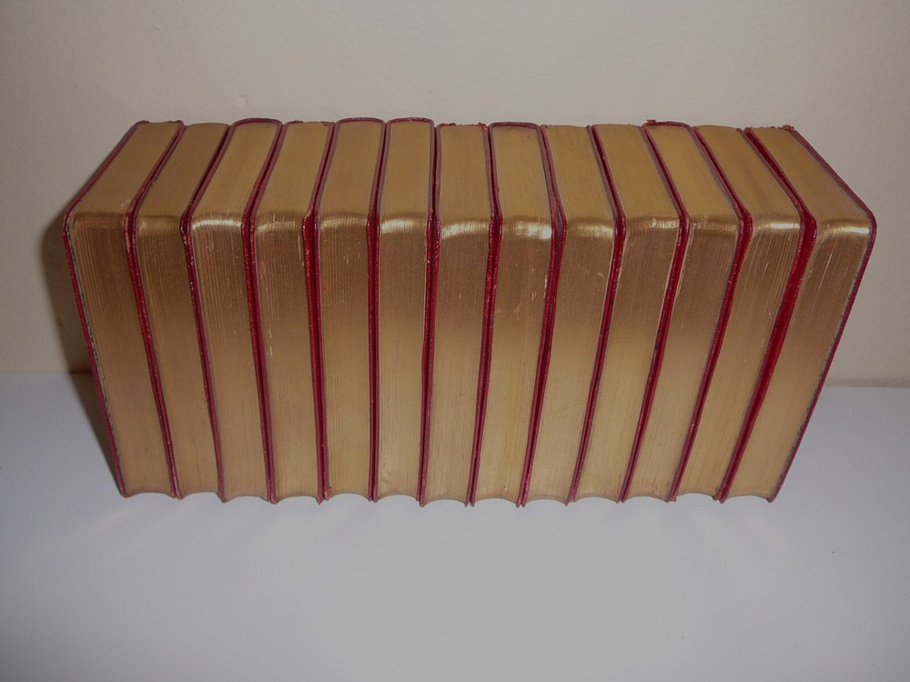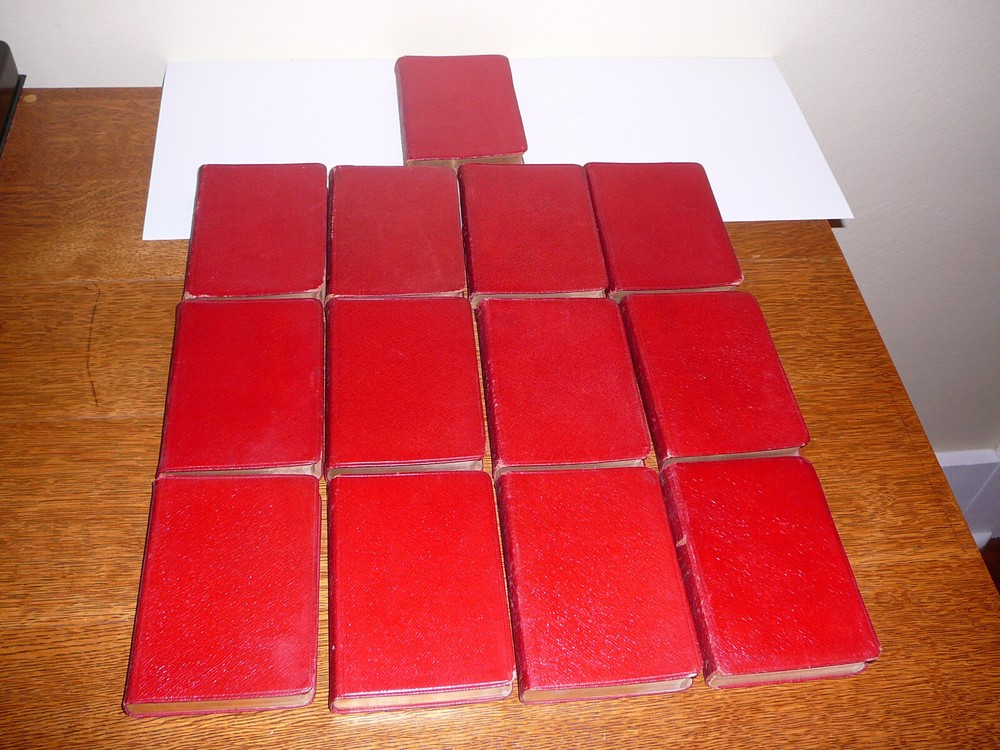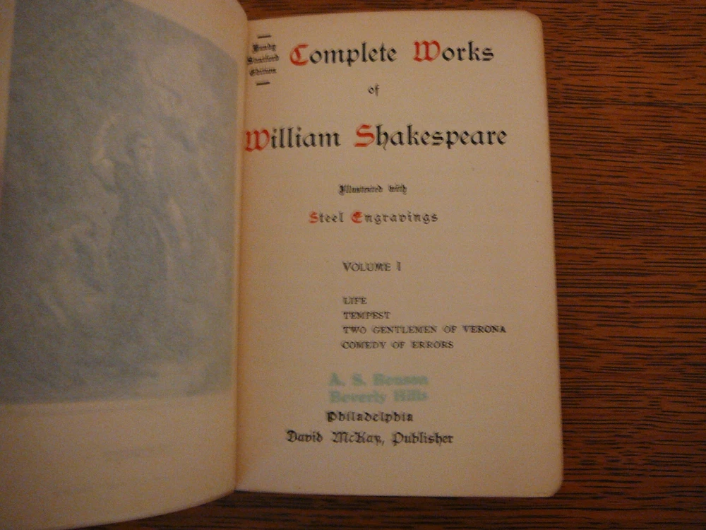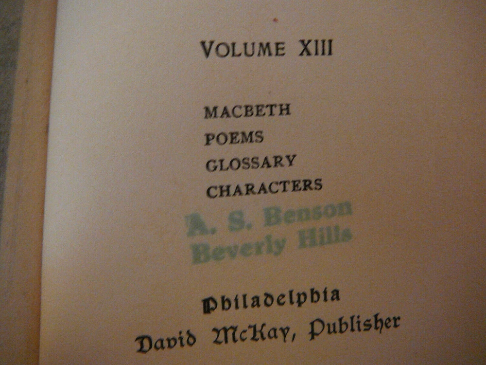 Vintage Set 13 Leather-Bound Volumes Shakespeare Complete Works - Novels & Poems - David McKay Publisher - Philadelphia. Handy Stratford Edition. Excellent vintage condition. 5" X 3-1/2" X 3/4". Bindings are good, although thirteen is loose near the front. Gold leaf paper edges. Dark red leather. Volumes one, two and thirteen have the most wear to the covers. Thirteen has a glossary and an index of characters. There are steel engravings of actors in the front of each volume. Stamped inside with a previous owner in Beverly Hills. Nice!
