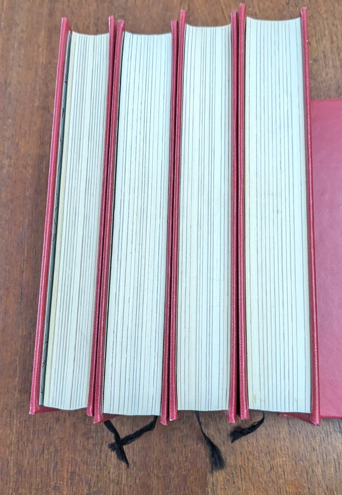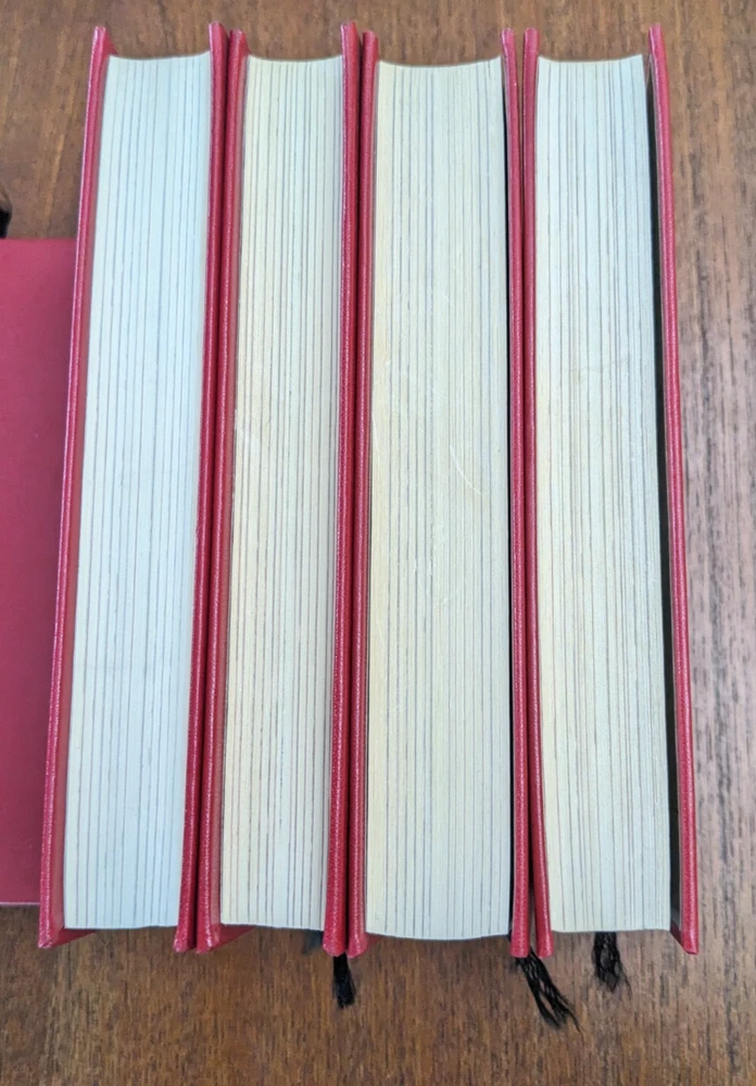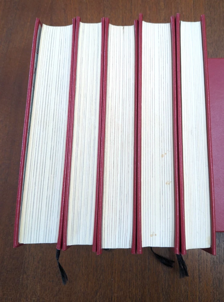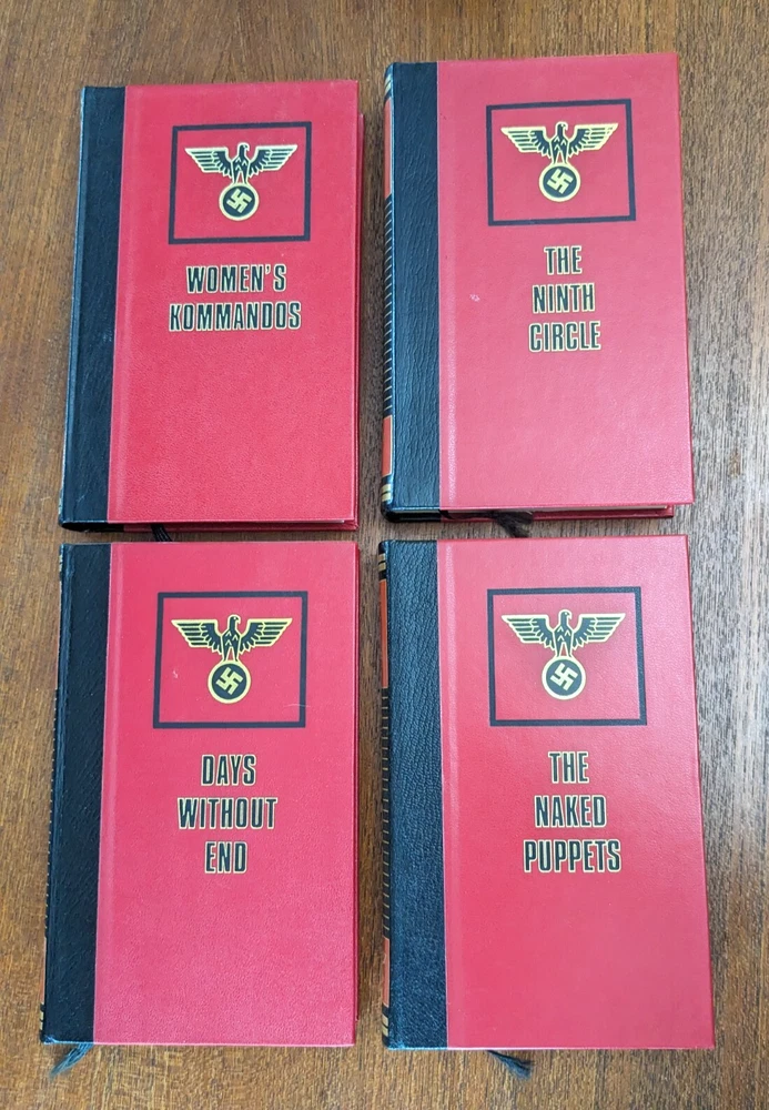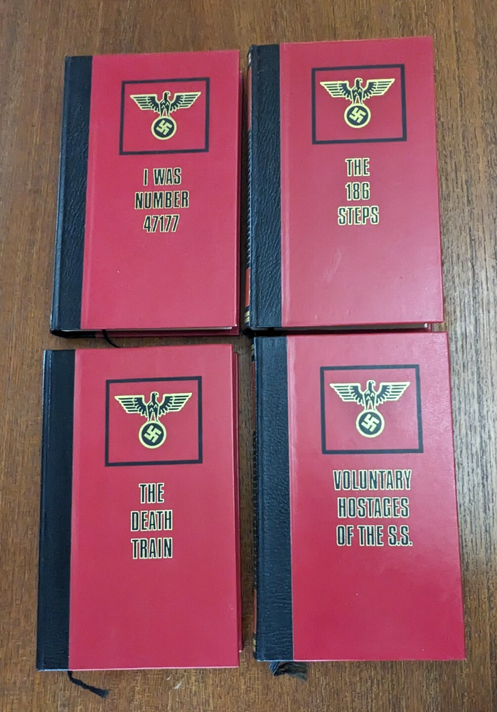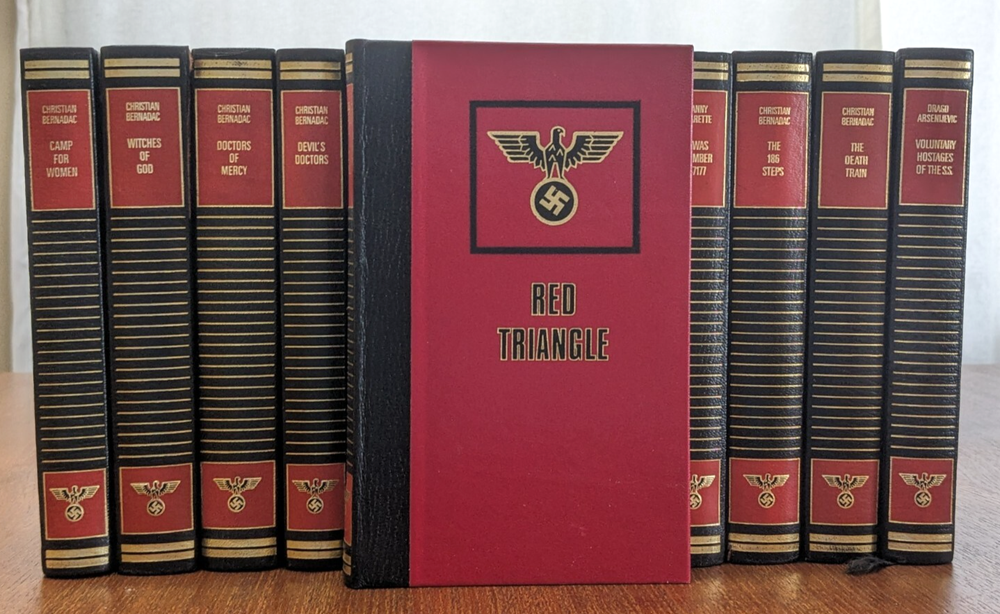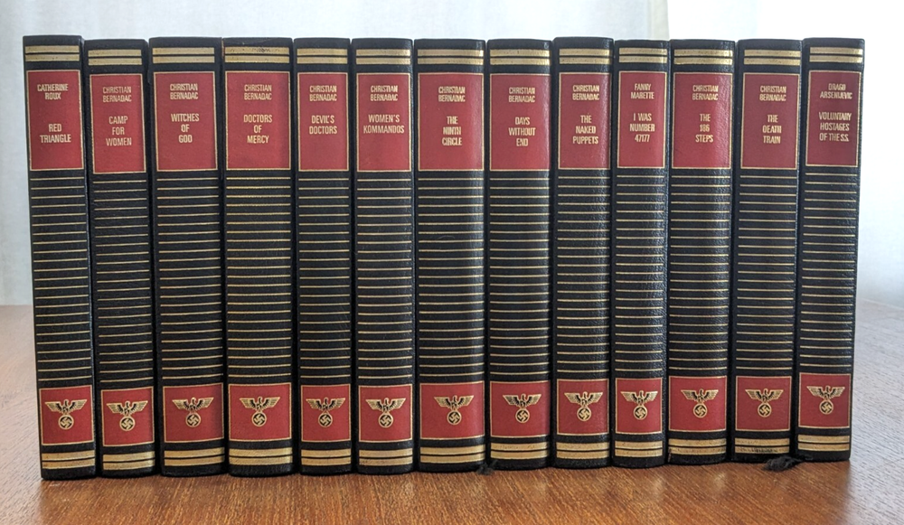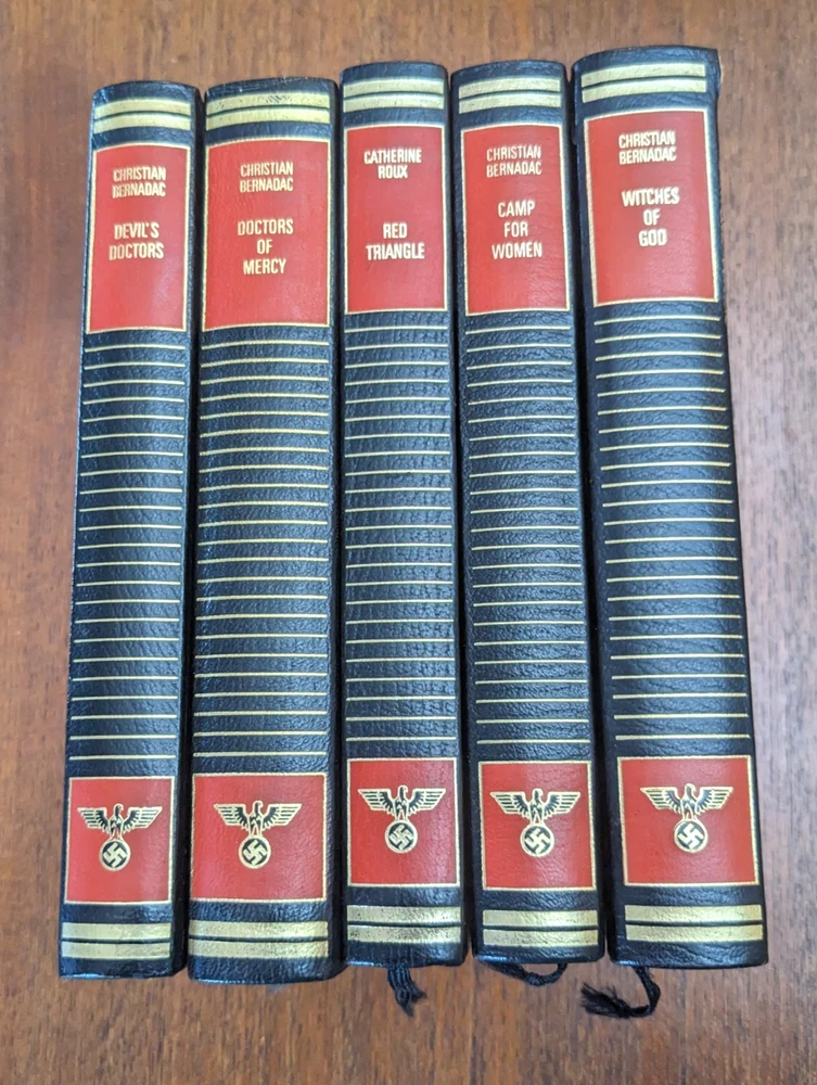 Vintage Set of 13 Christian Bernadac WW2 Nazi Holocaust Leather Bound Books Ferni Publishing House, Geneva 1978 These are 13 of the 16 books in the series. The titles are below. The condition is very good and the books appear to have had minimal use with minor surface marks and the bookmarks ends have fraying. The books have excellent bindings and pages excpet for the Witches of God which has a split in the outside binding on the top front side. Please check all of the pictures. Red Triangle Camp for Women Witches of God Doctors of Mercy Devil's Doctors Women's Kommandos Ninth Circle Days Without End The Naked Puppets I was NUmber 47177 The 186 Steps The Death Train Voluntary Hostages of the S.S.