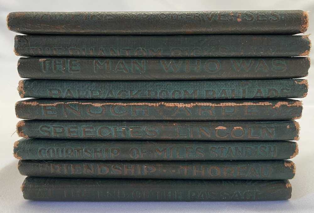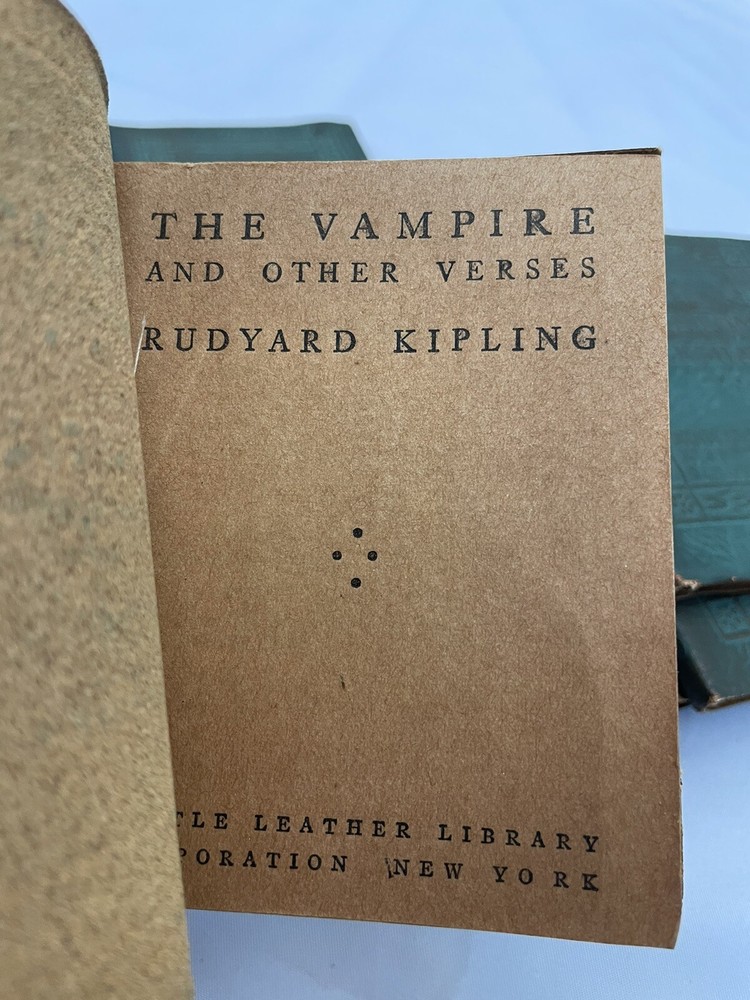 Vintage Set of NINE Little Leather Library Works of Rudyard Kipling Mini Books Joseph Rudyard Kipling (30 December 1865 – 18 January 1936) was an English novelist, short-story writer, poet, and journalist. He was born in British India, which inspired much of his work. Published between 1916-1924 Each tiny volume measures approximately 4" x 3 1/4" and features green outer covers Titles include: At The End of the Passage, Friendship and Other Essays · · , Courtship of Miles Standish, Vampire and Other Verses, The Phantom Rickshaw, The Man Who Was, Barrack Room Ballads, Speeches and Addresses Lincoln, Enoch Arden We utilize the "eBay Managed Payments" program where eBay processes Payments directly on the ebay Website. You will be able to Check Out with your Credit or Debit Card in an integrated Secure and Safe environment (we the Seller do not have access to any of your card or financial information, as this is all Securely handled by eBay) Ebay now offers more Payment Options at Checkout and they are focused on providing Consumers/Buyers greater choices in Payment Options (including the addition of Applepay on your Mobile App) If you still wish to use your PayPal Account eBay allows for Integrated PayPal payments or you can enter your PayPal Debit Card information during the payment processing transaction, or you prefer may Message us after your purchase for an Invoice. Shipping and Handling for this item will be FREE for Economy Shipping (Please review eBay's Shipping Chart or Contact us for Faster/Alternate Shipping Options). We do also ship Internationally via eBay's Global Shipping Program for Safe/Guaranteed Delivery = Please review eBay's Shipping Chart for all Shipping Costs/Fees Prior to purchasing.