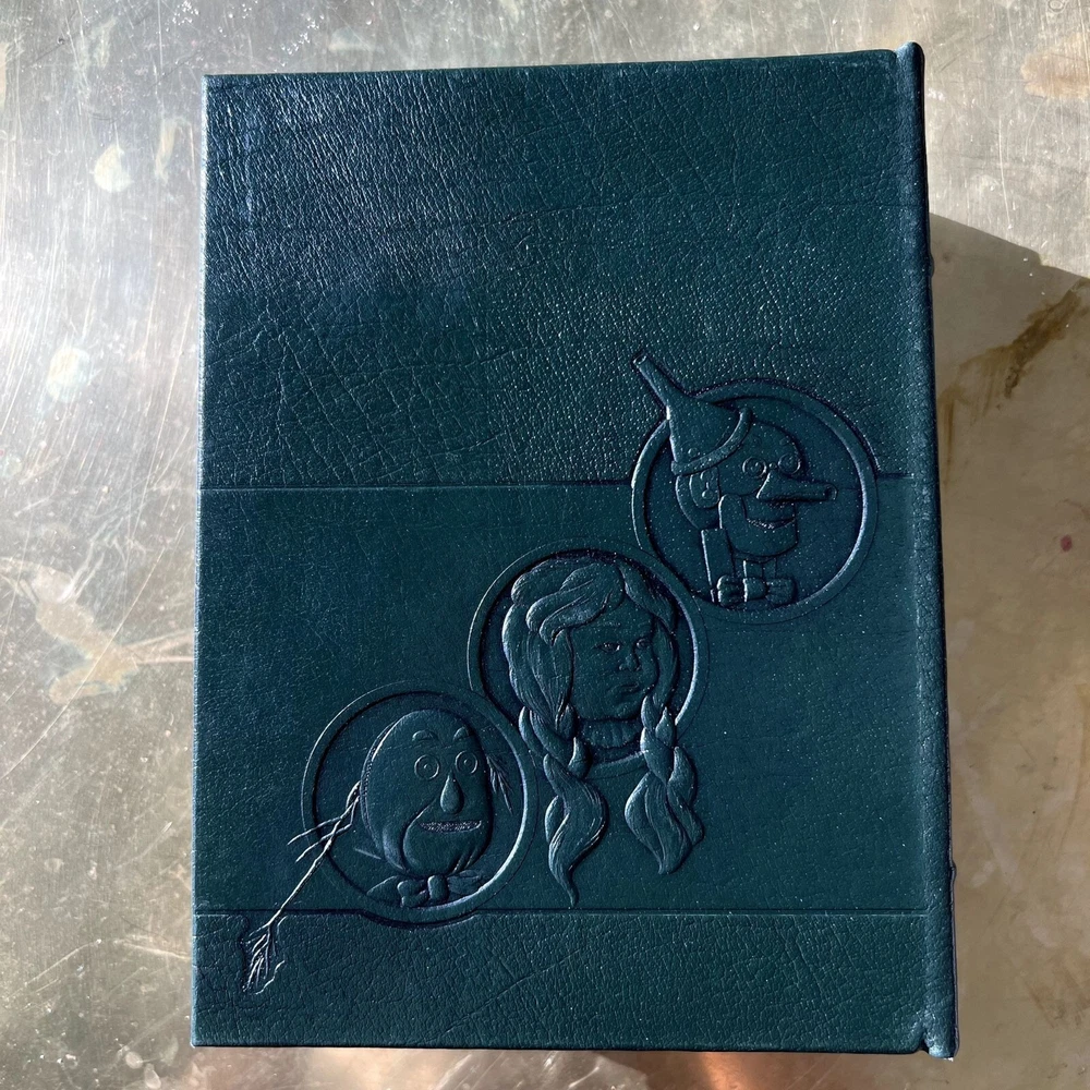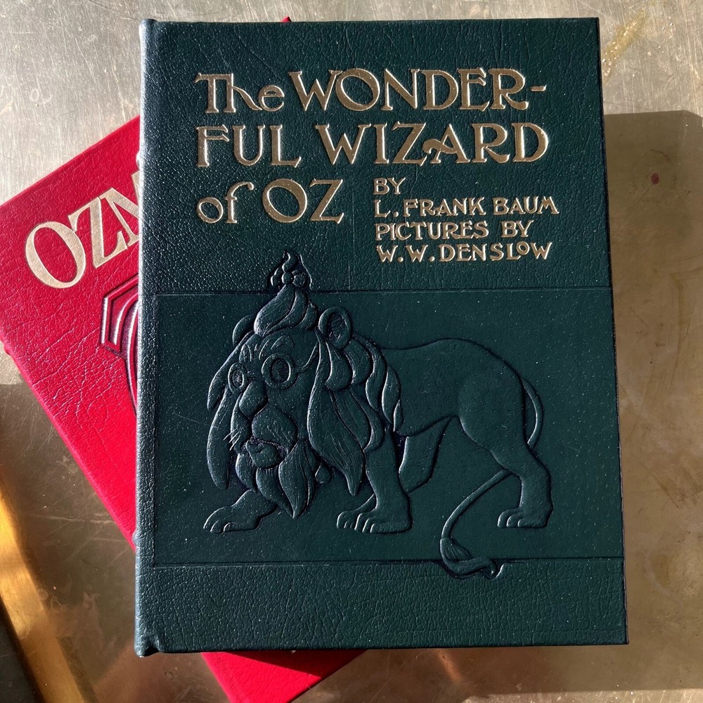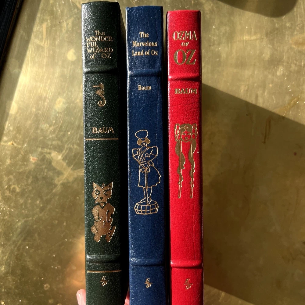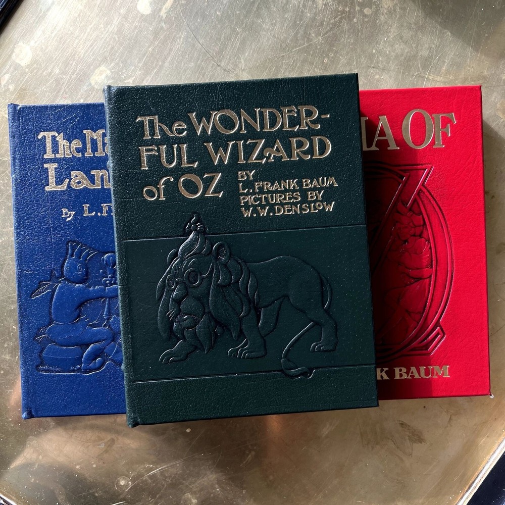 Mint condition, estate find. These look like they were never opened as their silk markers are still in place. Absolutely stunning works! Author: L. Frank Baum Illustrator: John R. Neill BAUM, L[yman] Frank. The Wonderful Wizard of Oz. With Pictures by W[illiam] W[allace] Denslow. The Marvelous Land of Oz. Pictured by John R[ea] Neill. Ozma of Oz. Illustrated by John R[ea] Neill. [Norwalk, CT: Easton Press, 1989]. 8vo, Vol 1: 268pp. Vol 2: 292pp. Vol 3: 275pp. Green, navy and red leatherette embossed and pictorially stamped in gold, each with silk bookmark bound-in; a.e.g. Moiré endpapers; color and b&w illustrations throughout. First printing of these facsimile editions, bound in what Easton Press calls “genuine leather” but Is more accurately leatherette or pressed leather. The first three novels in L. Frank Baum’s beloved Oz series produced by The Easton Press from the plates/film used to create the Books of Wonder Classics editions that Books of Wonder co-published with William Morrow and Company. These facsimile editions of the novels feature all of Denslow and Neill’s original illustrations (the plates and text of The Wonderful Wizard of Oz are based on the second state plates and text) as well as the original text of the novels and afterwords by Peter Glassman. --------------------- shelf 3