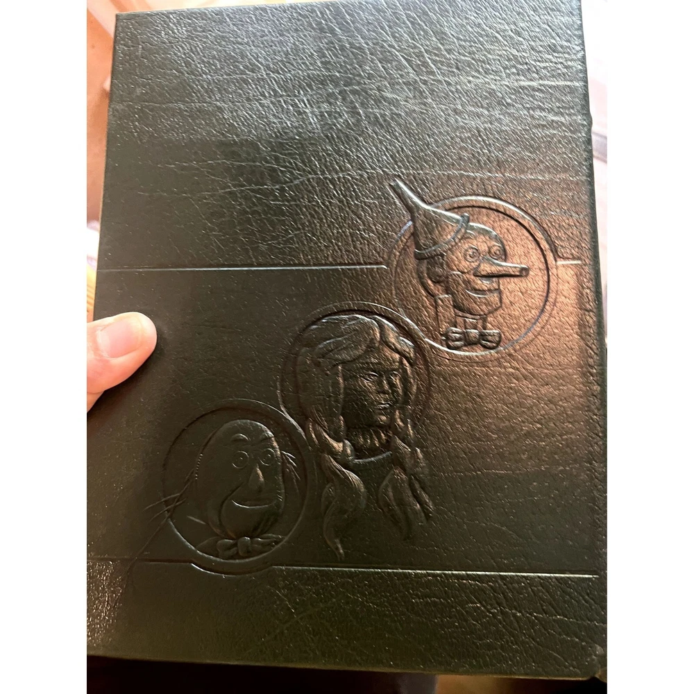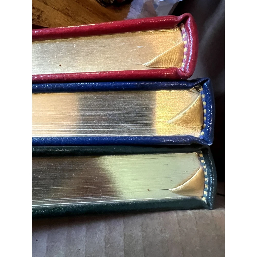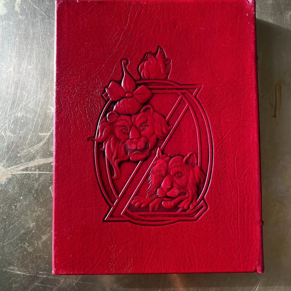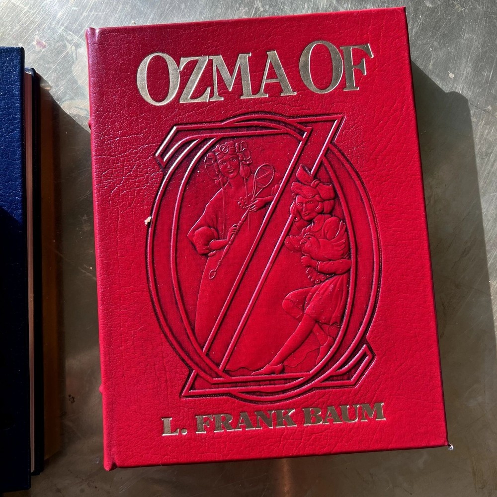 Mint condition, estate find. These look like they were never opened as their silk markers are still in place. Absolutely stunning works! Author: L. Frank Baum Illustrator: John R. Neill BAUM, L[yman] Frank. The Wonderful Wizard of Oz. With Pictures by W[illiam] W[allace] Denslow. The Marvelous Land of Oz. Pictured by John R[ea] Neill. Ozma of Oz. Illustrated by John R[ea] Neill. [Norwalk, CT: Easton Press, 1989]. 8vo, Vol 1: 268pp. Vol 2: 292pp. Vol 3: 275pp. Green, navy and red leatherette embossed and pictorially stamped in gold, each with silk bookmark bound-in; a.e.g. Moiré endpapers; color and b&w illustrations throughout. First printing of these facsimile editions, bound in what Easton Press calls “genuine leather” but Is more accurately leatherette or pressed leather. The first three novels in L. Frank Baum’s beloved Oz series produced by The Easton Press from the plates/film used to create the Books of Wonder Classics editions that Books of Wonder co-published with William Morrow and Company. These facsimile editions of the novels feature all of Denslow and Neill’s original illustrations (the plates and text of The Wonderful Wizard of Oz are based on the second state plates and text) as well as the original text of the novels and afterwords by Peter Glassman. --------------------- shelf 3