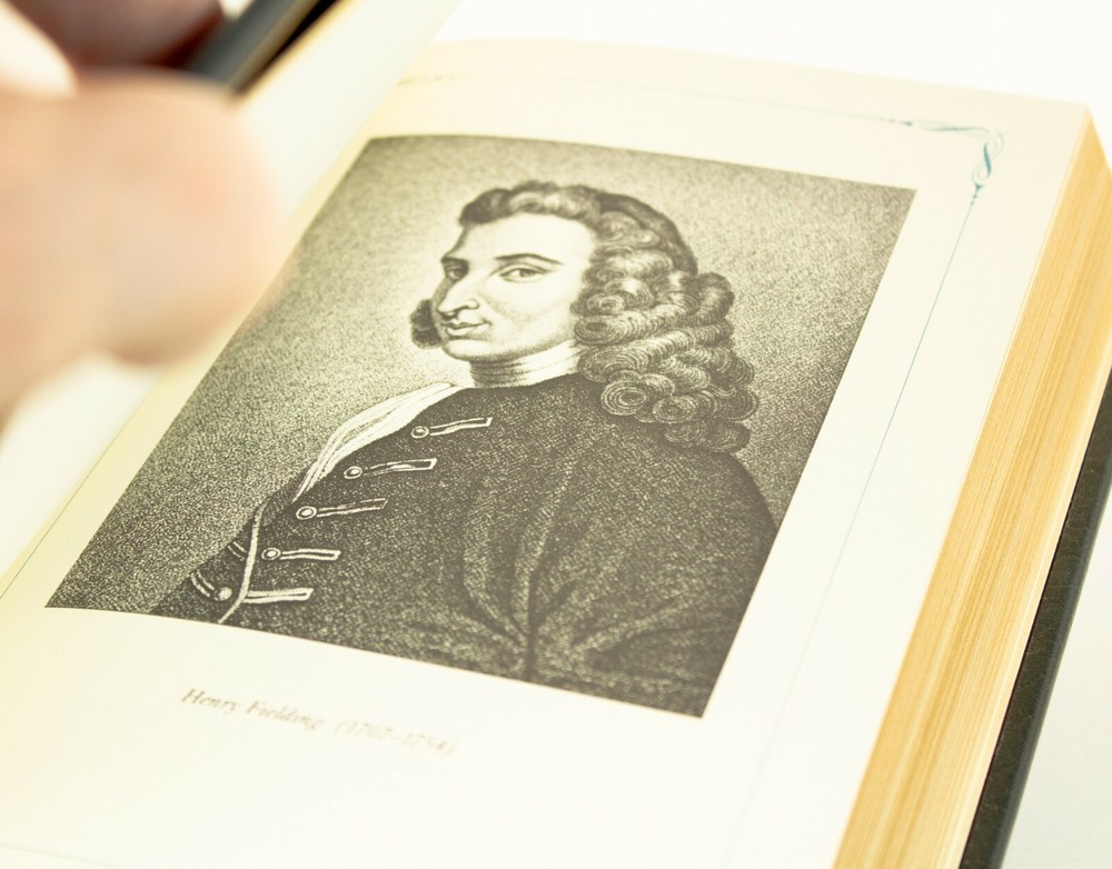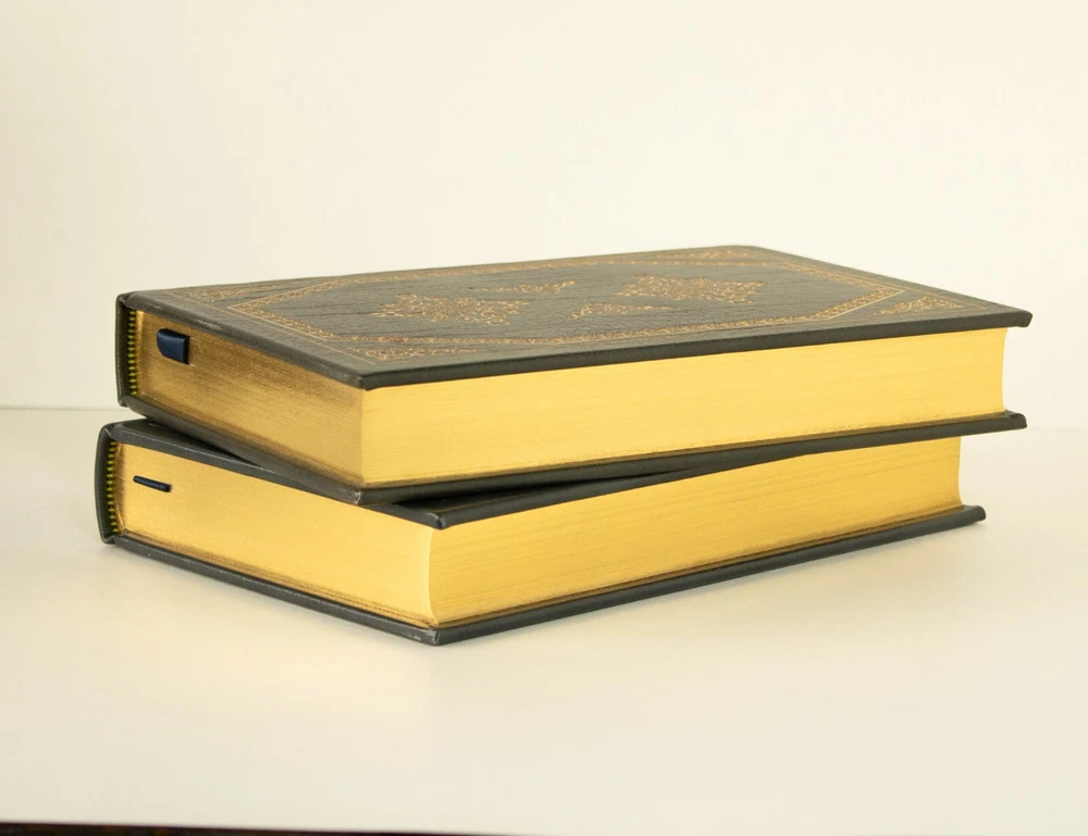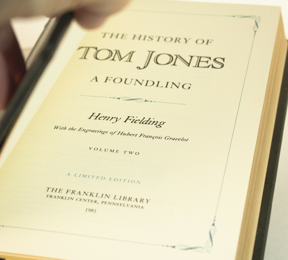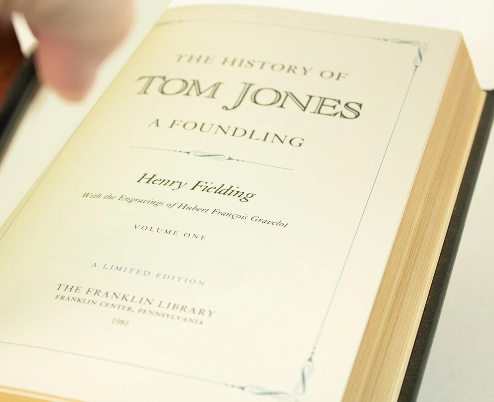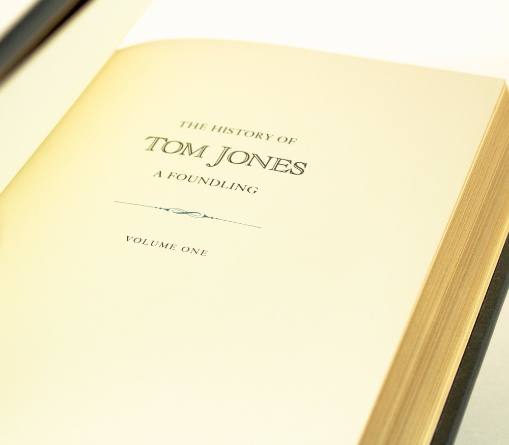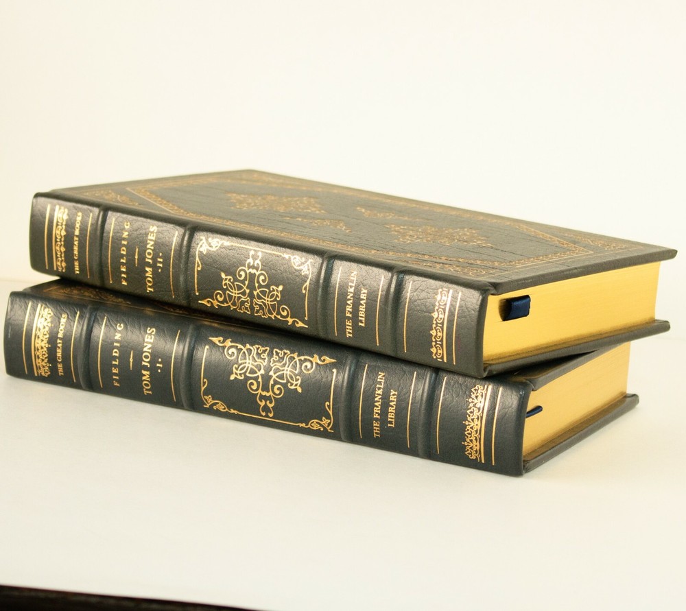 Tom Jones Two Volume Set Limited Edition The Great Books 1981 The 25th Anniversary Limited Edition of The Great Books Of the Western World. Tom Jones A Foundling Volume One and Two. Full Leather-Bound Book Features 22k Gold Accents, Gold Gilt Edges, Silk Endpapers, And A Sewn-In Bookmark. The Book is in Fine Condition No Signs Of Use. Lion Bookend For Display Only, Not Included.