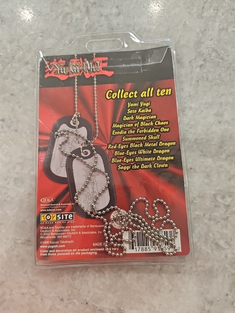 This collectible dog tag features the iconic Blue-Eyes White Dragon character from the popular Yu-Gi-Oh! franchise. Made of metal and manufactured by Toysite in China in 2002, this vintage piece is a must-have for any fan or collector of the series. The dog tag is silver in color and part of the Yugi set. Perfect for any enthusiast of collectible card games, this item is a unique addition to any collection. The dog tag is in excellent condition and ready to be worn or displayed. Don't miss out on the opportunity to own a piece of Yu-Gi-Oh! history.
