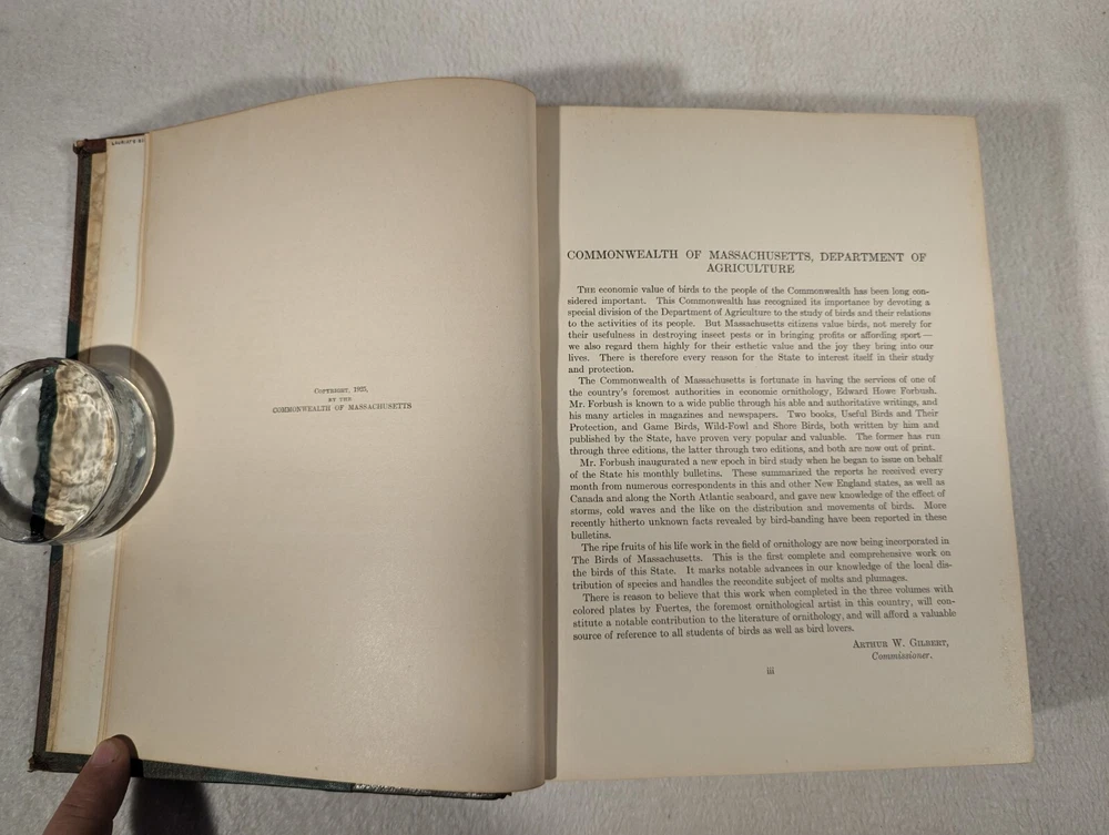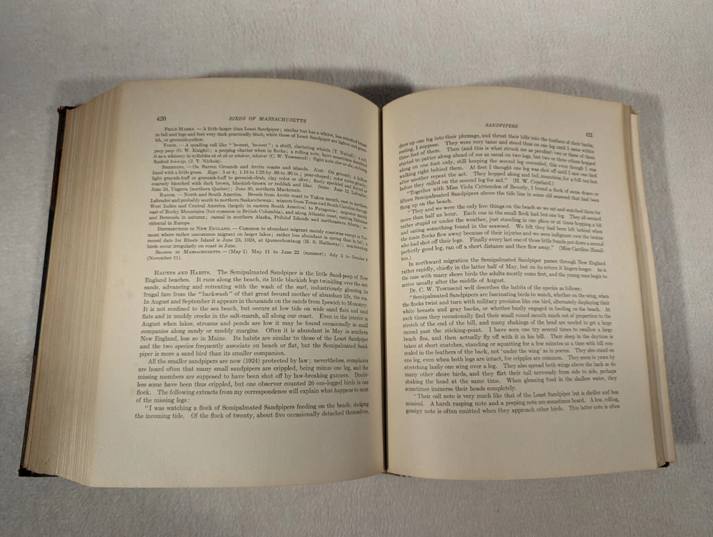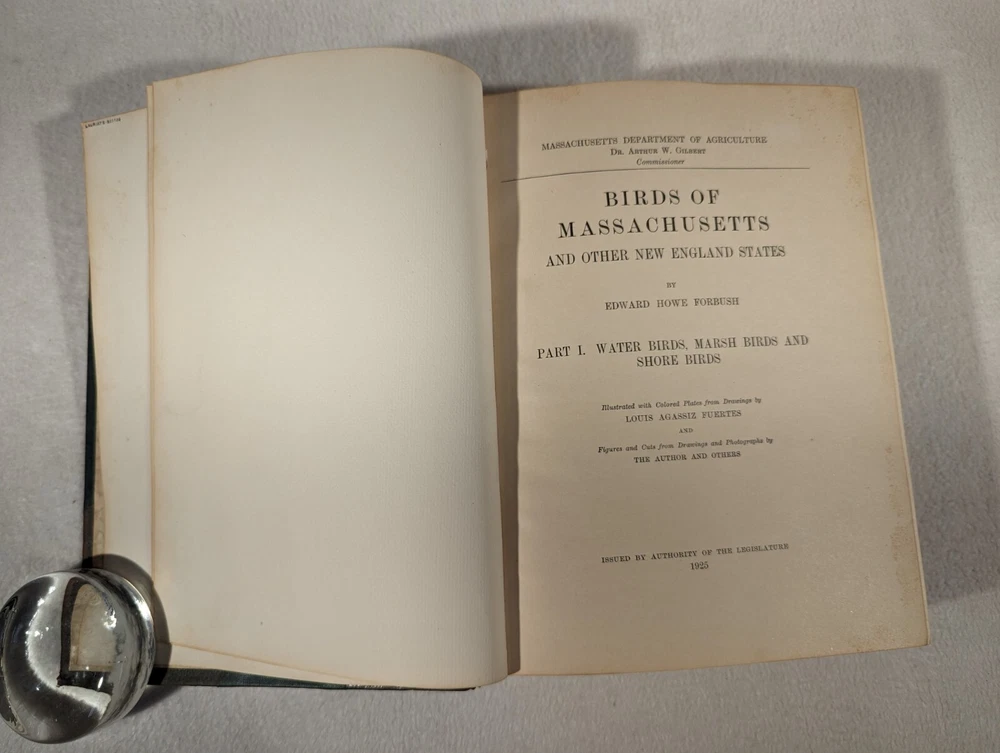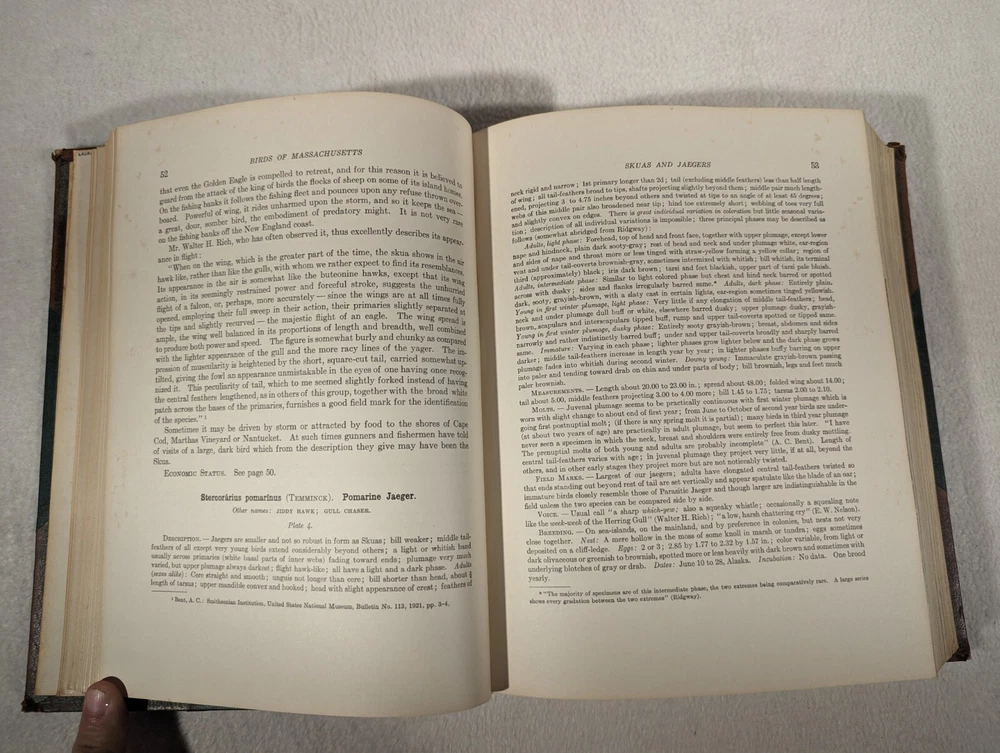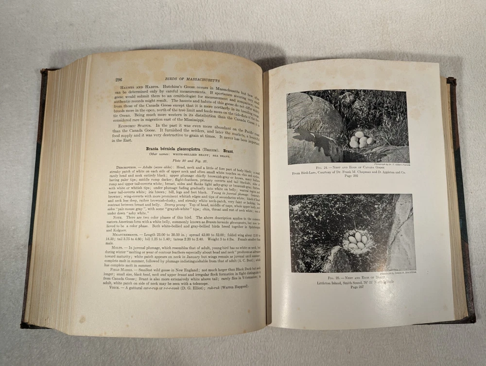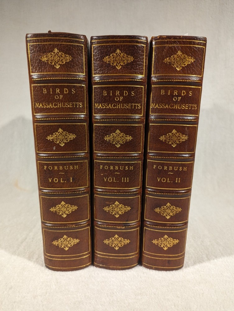 See Photos. Comes from an immaculately clean nonsmoking home. In very good condition. Leather spines and corners. Decorative quality. Fantastic patina on the leather with gilt lettering. Raised bands on the spine add to the look. Pages inside without being next to an illustration are crisp, clear, and clean. Pages next to illustrations show foxing. Volume one published in 1925, two in 1927, and final volume in 1929. Complete in three volumes. With many plates across all volumes. Set was issued by the Commonwealth of Massachusetts, Department of Agriculture. This comprehensive guide features detailed descriptions and stunning illustrations of over 400 bird species found in the region. Volume I: Water Birds, Marsh Birds, and Shore Birds, Volume II: Land Birds from Bob-Whites to Grackles, Volume III: Land Birds from Sparrows to Thrushes. During research, we could not find the leather variation. Detailed photos of one volume indicate quality for all. Seller Lot #24027. Listed shipping costs are for the lower 48 (USA) states. For the Eastern US, there is a strong possibility that you will get it with 2 or 3 day shipping. We ship internationally and encourage buyers to use the eBay Global Shipping Program. If there is a difference between the item description and the photos, use the photos to resolve. Pictures are of the exact item(s) you will receive. Should you be moved to give positive feedback, expect thoughtful and kind positive feedback in return. Thanks for looking at our listing! Check out other vintage/antique items we have at http://stores.ebay.com/Suburbia-Harvest?_rdc=1.