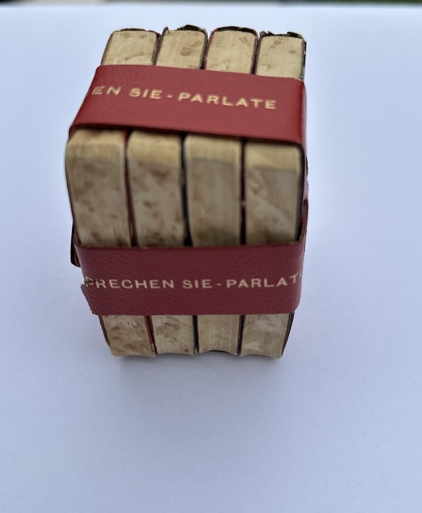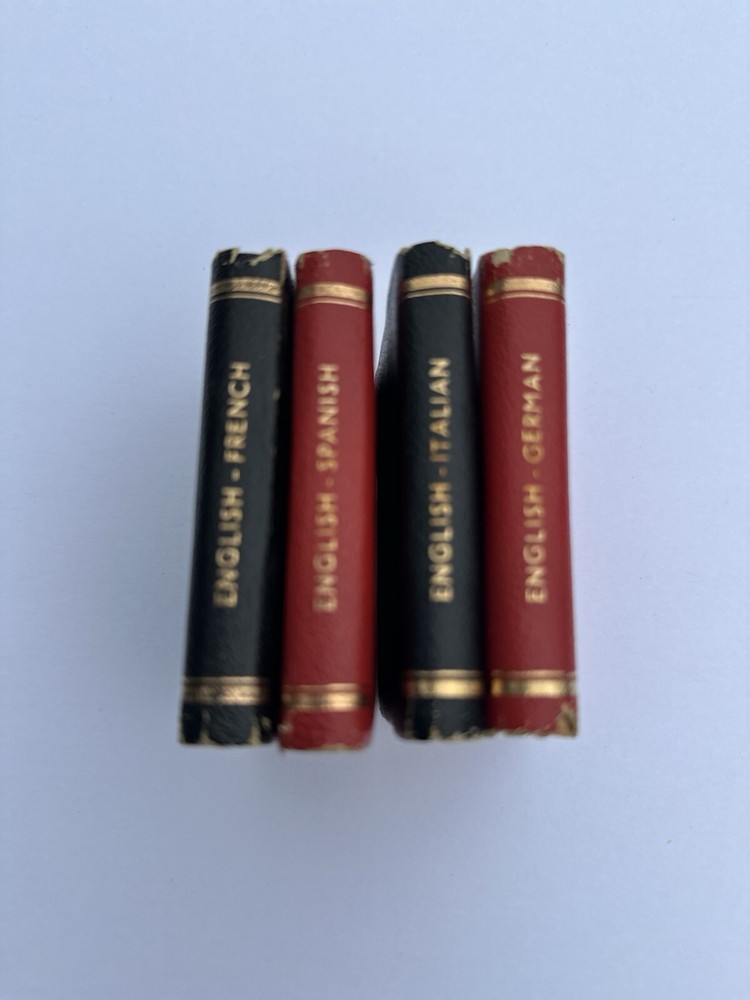 This vintage language study set by Burgess & Bowes includes a miniature dictionary and reference materials in German, French, English, and Italian. The leather binding adds to its antique charm, and it was published in Belgium for good measure. The set is in its original form and is a great addition to any collection of antiquarian and collectible books. The Midget Dictionary Set covers a range of topics and is perfect for language enthusiasts. It includes special attributes that make it a unique and valuable item. The set is a must-have for collectors and language experts alike.
