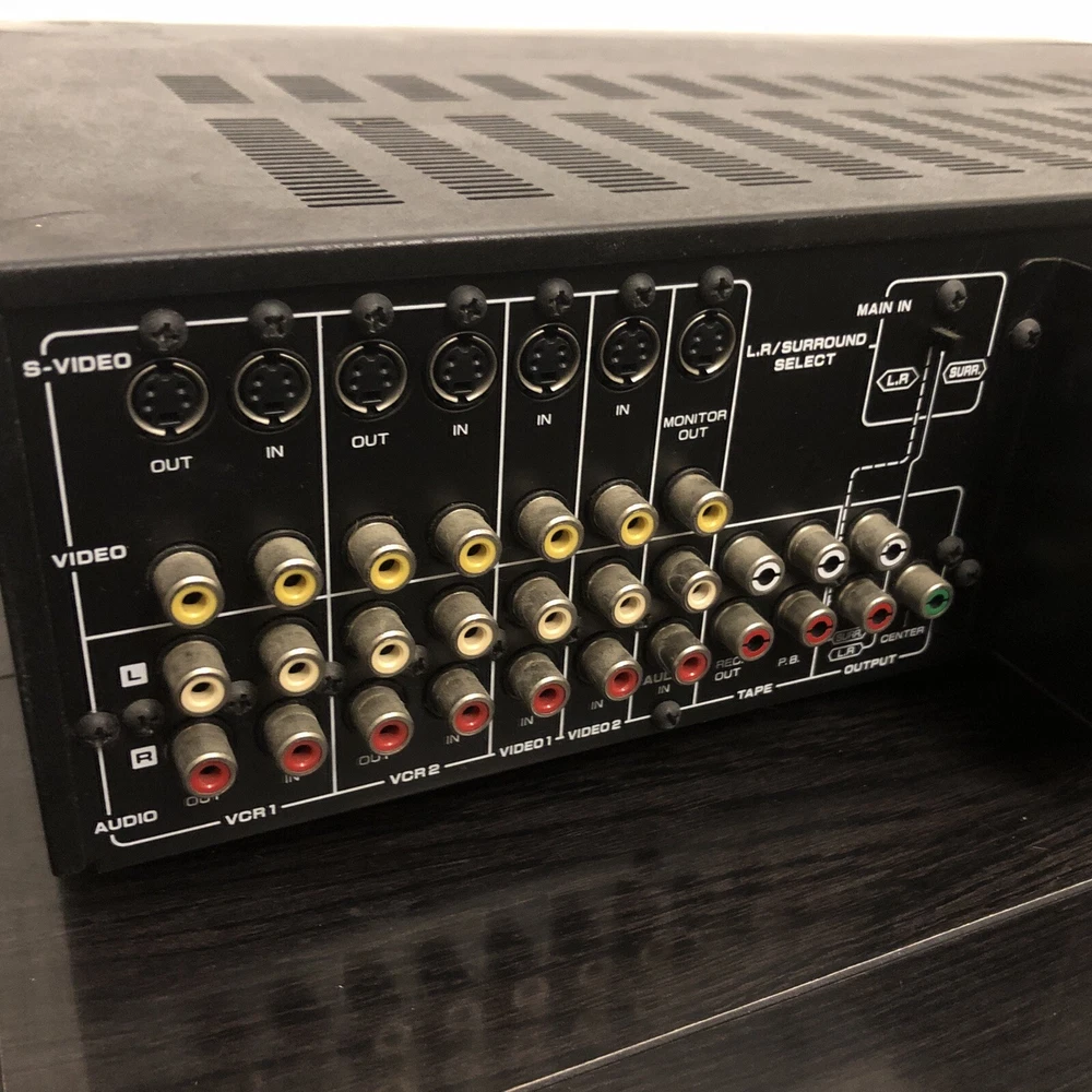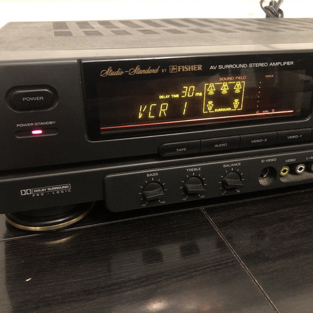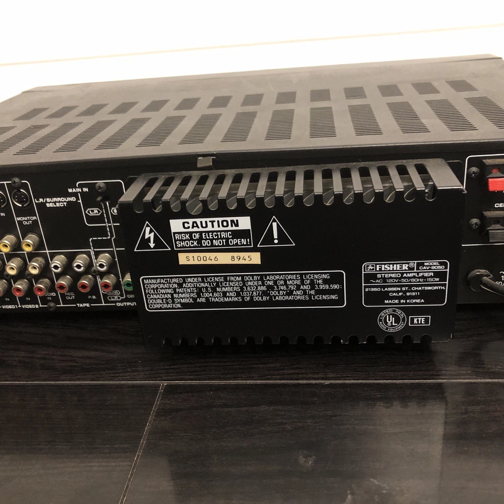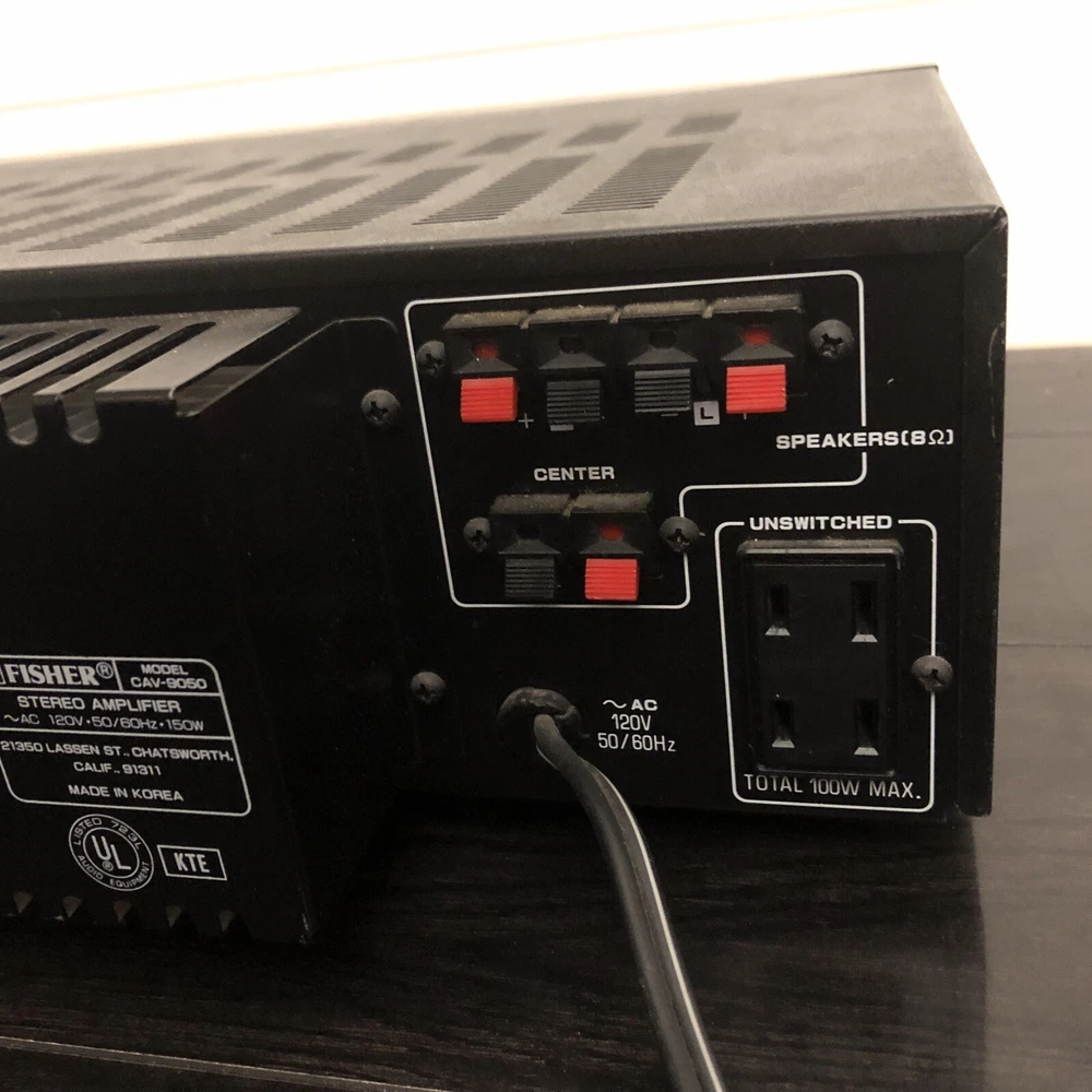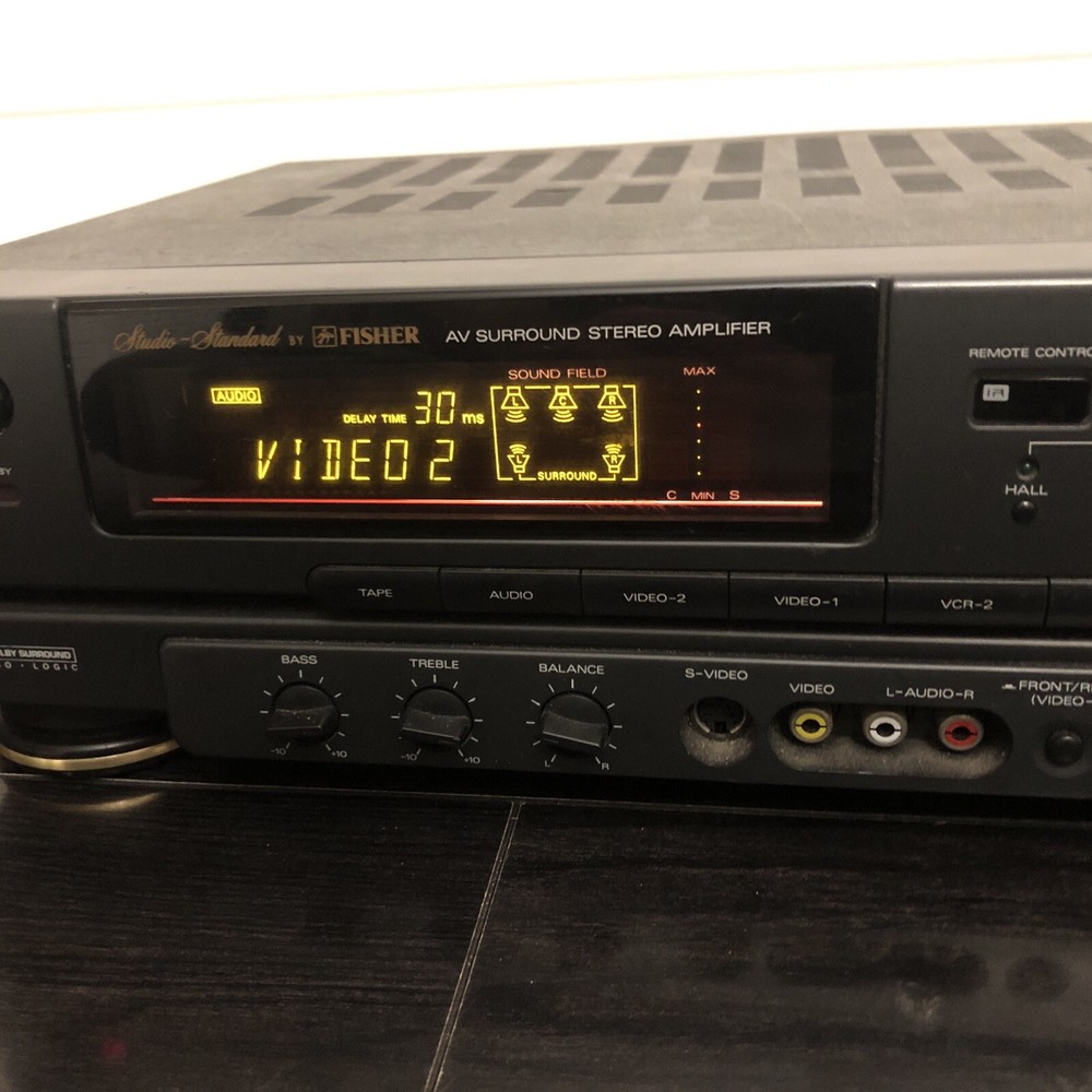 No remote included The vintage Fisher CAV-9145 AV Surround Stereo Amplifier is a rare find that offers 150W of power for a high-quality audio experience. This A/V receiver in black color features audio inputs for AUX and S-Video, as well as audio outputs with raw cable speaker jacks for versatile connectivity options. The Fisher CAV-9145 model is a unique piece in the realm of home audio, perfect for enhancing your entertainment setup with its classic design and impressive performance.