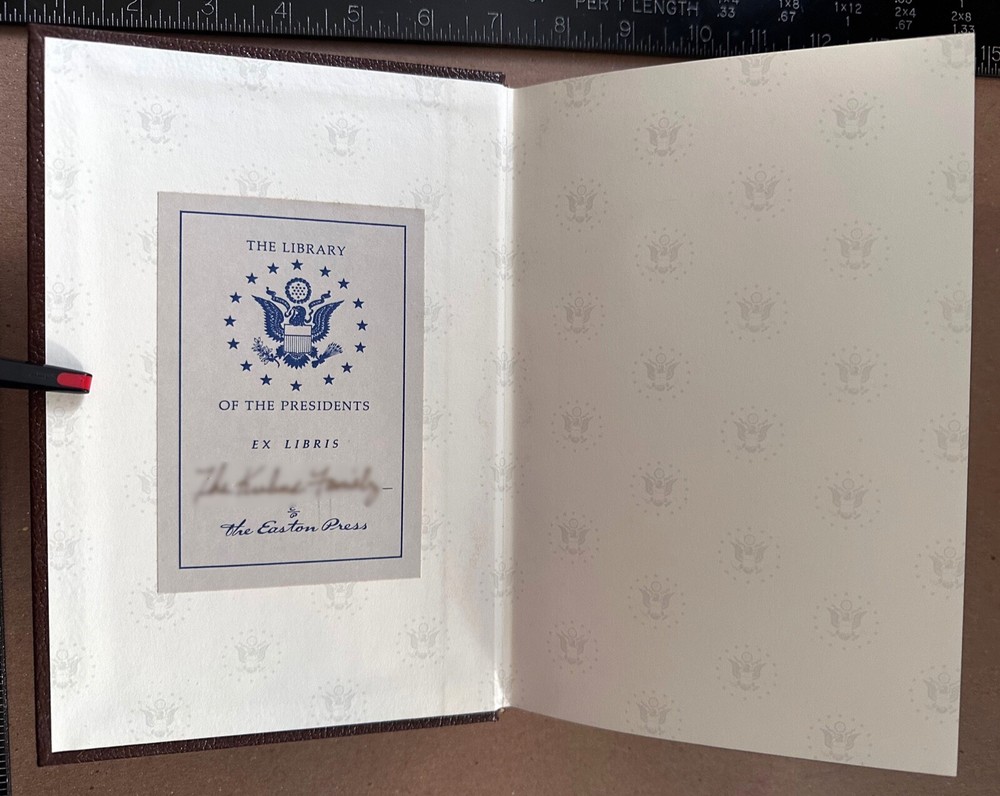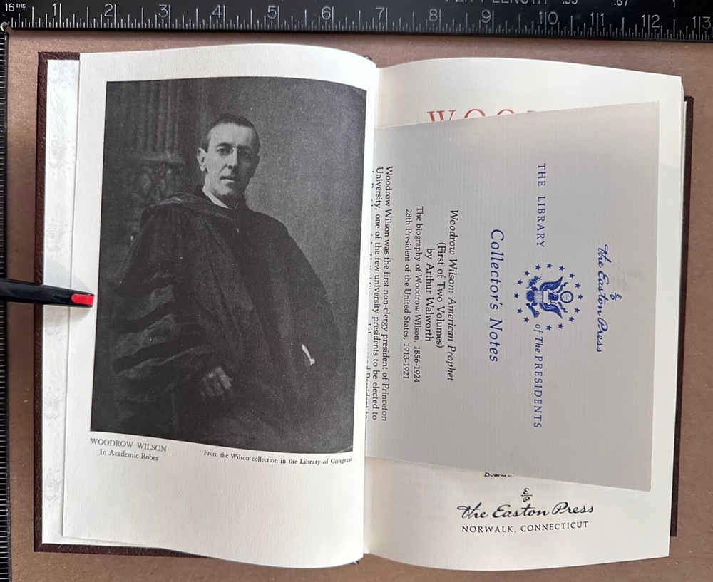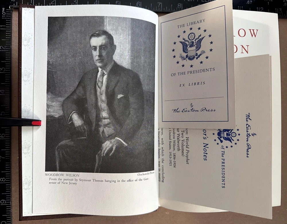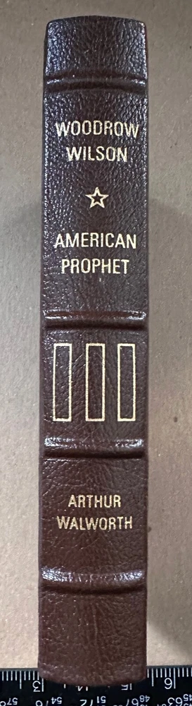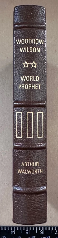 TITLE: Woodrow Wilson: Volume 1: American Prophet / Volume 2: World Prophet (Two-Volume Set) (Easton Library of the Presidents, No. 28) AUTHOR: Walworth, Arthur AUTHOR 2 (if applicable): n/a AUTHOR 3 (if applicable): n/a ILLUSTRATOR (if applicable): n/a PUBLISHER: The Easton Press, Date: 1989 ISBN: N/A (pre-ISBN publication) FORMAT: Leatherbound, 454/438 pages EDITION: First Edition Thus (Reprinted Third Edition) PRINTING [if applicable]: 1st Printing (No Later Stated) BOOK CONDITION: Very Good JACKET CONDITION: No Jacket (As Issued) DIMENSIONS (if available): 8.50 x 5.50 x 2.75 in. approx. KEYWORDS: President, United States, Easton Library, Woodrow Wilson, 28rd President, America, 1900s, 20th Century, Biography, History, Government, Politics, DESCRIPTION: From the Collector's Notes: Volume I: Woodrow Wilson was the first non-clergy president of Princeton University, one of the few university presidents to be elected to the Presidency of the United States, and the second President to win the Nobel Peace Prize. Ironically, though re-elected as the man who "kept us out of war," he brought the United States into World War I in order to "make the world safe for democracy." Born in Staunton, Virginia, in 1856, Woodrow Wilson was the son of a Presbyterian minister whose high moral principles he espoused without reserve. He gave up his law practice to enter the Ph.D. program at Johns Hopkins University, taught at Bryn Mawr College for three years, and, in 1890, was appointed professor of jurisprudence and political economy at Princeton, his alma mater. Wilson became president of Princeton in 1902. He was elected governor of New Jersey in 1910, and two years later was elected the first Democratic U.S. President in two decades. As a result of Woodrow Wilson's advocacy, the Federal Reserve System and the Federal Trade Commission were established, the Clayton Antitrust Act became law, and a Federal income tax was imposed for the first time since the Civil War. In the first volume of this biography, Arthur Walworth takes the reader through the first term of Wilson's administration. It was during this period that Mexico broke off relations with the United States. Provoked by hostile actions, the President had sent in the Marines to occupy the Vera Cruz custom-house, and ordered U.S. troops to enter Mexico in pursuit of the bandit-guerilla leader Pancho Villa. Walworth exhibits his deep sympathy with Woodrow Wilson's grief and loneliness occasioned by the death of the first Mrs. Wilson. Likewise, as the historian Alan Nevins remarked, Walworth displays "a subtle perception of Wilson's mind and character, a sense of the drama and color of his life, and a detached attitude in measuring his accomplishments and failures." "A clean and sprightly narrative," as The Yale Review characterized it, this biography "is particularly successful in catching the spirit of its subject, in revealing his passions and his fulfillments, his extraordinary capacity for love, for hate, for self-mastery, and for self-delusion." A definitive biography of Woodrow Wilson, Woodrew Wilson: American Prophet won the Pulitzer Prize for Arthur Walworth. The concluding volume, which will be distributed to subscribers next month, is devoted to the eventful last seven years of the President's life, including the period of America's triumphant participation in World War I. Volume II: Woodrow Wilson's second term, with which the concluding volume of Arthur Walworth's biography begins, was in many ways an ominous forecast of Franklin Delano Roosevelt's third term. Both Presidents had steered a neutral course during the beginning of global conflict. Both Presidents eventually found it incumbent upon themselves to involve America in those conflicts, to fight our enemies with every means that could be brought to bear, and to help bring about the final victory of the Allied powers. before completing their last terms. Both Wilson and Roosevelt, moreover, pinned their hopes for postwar peace on a worldwide organization, and though the United Nations actually materialized, Wilson tragically failed to effect American participation in a League of Nations that was doomed from its inception. Wilson's final seven years are vividly reconstructed in this, the second volume of the Pulitzer Prize biography of our twenty-eighth President. Here is a moving account of a Chief Executive struck down by an incapacitating illness while on a cross-country tour undertaken to urge ratification of the Treaty of Versailles. After a paralytic stroke suffered on October 2, 1919, and while being cared for by his second wife, Wilson continued to issue appeals for the treaty. Wilson remained an invalid during his last five years. "Arthur Walworth has written a biography of distinction... a book easy to read and essential to a broad appreciation of Wilson and his political era. The student of history will find it invaluable as an accurate and authoritative work of reference." Such was the endorsement of Charles Seymour, president emeritus of Yale University. Stewart Mitches, a former director of the Massachusetts Historical Society, called it a work of prime importance, one that shows "a sense of proportion, humor, accuracy, and tenderness." Born in Newton, Mass., in 1903, Walworth attended Phillips Andover Academy and Yale, and was a member of the editorial department of Houghton Mifflin Company for eight years. Besides the Wilson biography, published in 1958, his books include Black Ships off Japan: The Story of Commodore Perry's Expedition (1946), Cape Breton, Isle of Romance (1948), and American Diplomacy at the End of World War II (1977). Woodrow Wilson: World Prophet now joins Woodrow Wilson: American Prophet in The Library of the Presidents. Meticulously printed in Kingsport, Tennessee, at the Kingsport Press, on special Warren Olde Style wove paper, and bound by Kingsport in rich genuine leather, this volume matches the preceding one in its outstanding physical attr