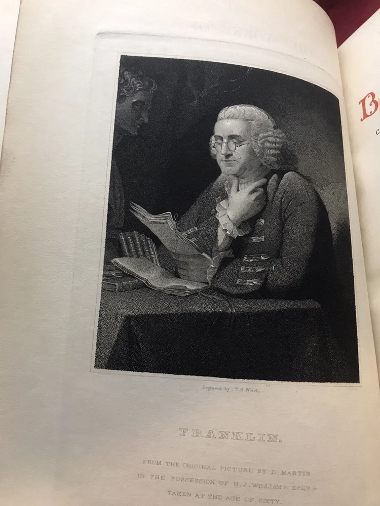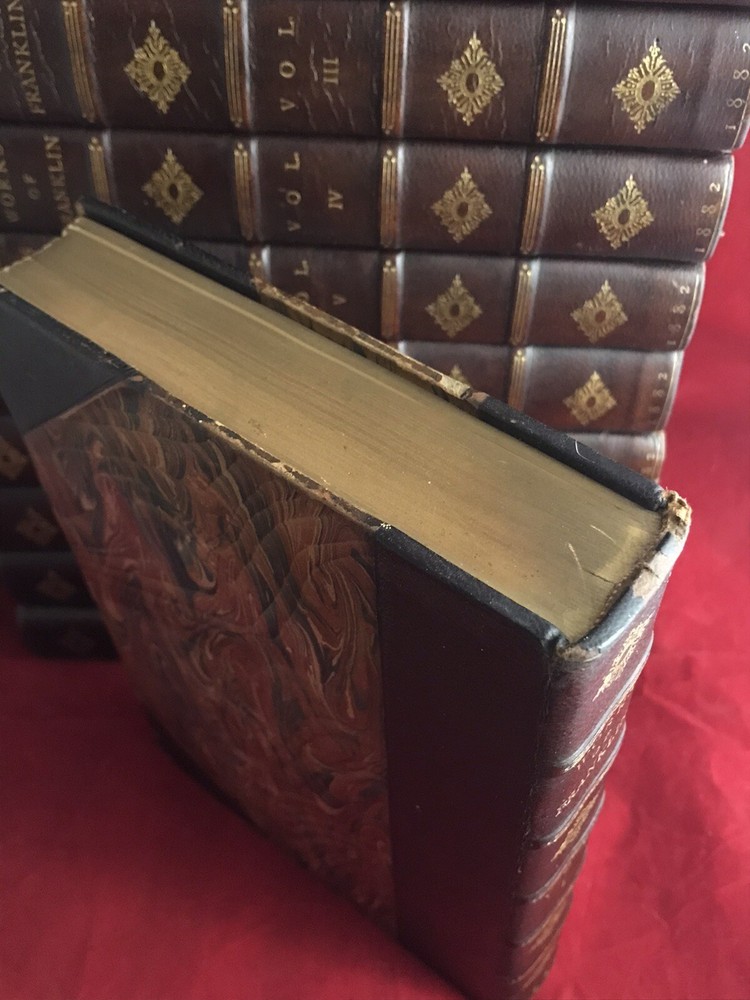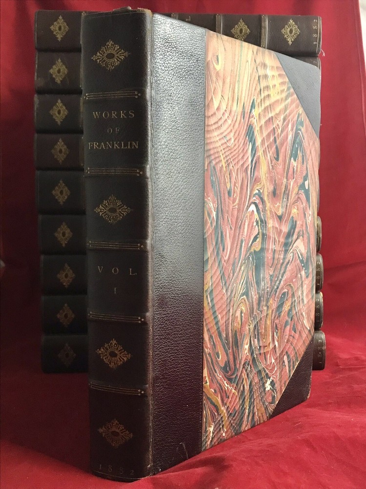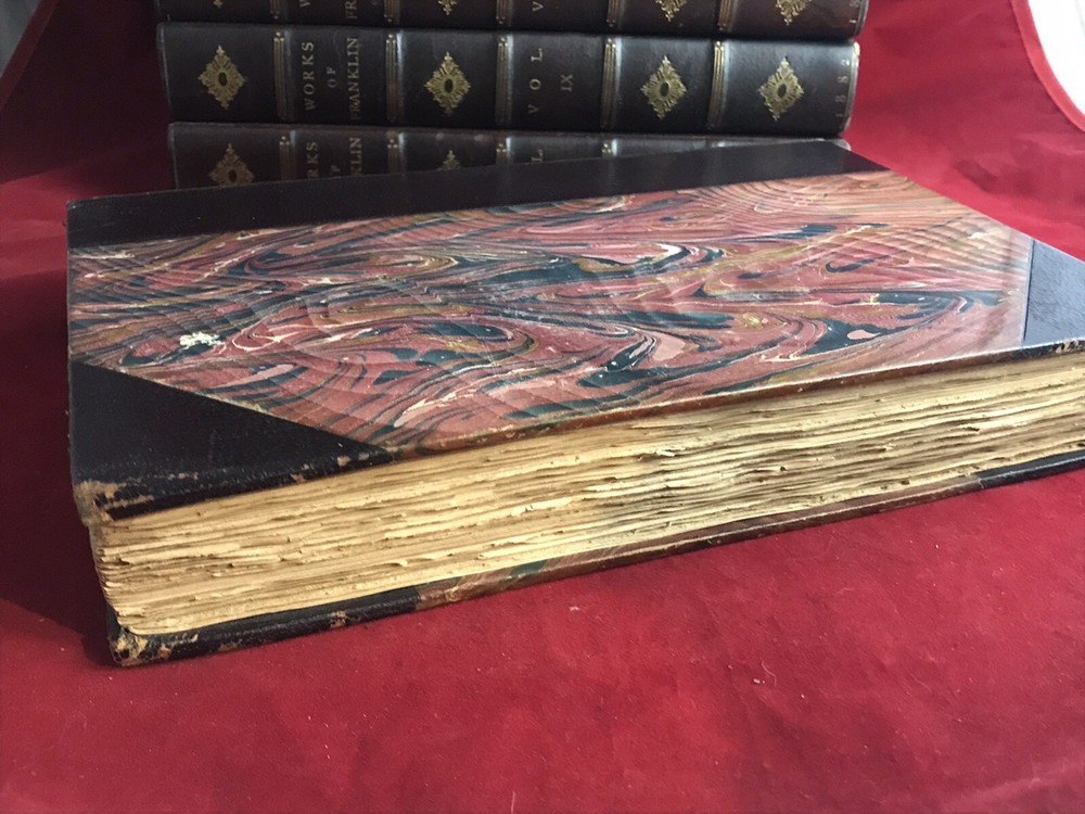 The Works of Benjamin Franklin with notes and life of the author by Jared Sparks. 1882 first edition. Ten volume complete set. Bound in three-quarter leather over marbled paper boards, matching the end papers. Bindings signed by the bookbinder “Blackwell”. Top page edges gilded with rough cut outer edges. Leather looks great for age. No splitting or heavy rubbing, but there is a small about of cracking on the spines. That results from leather being dried out, so we polished the leather with a deep penetrating conditioner to prevent further wear. Each book is 10” tall by 6.75” wide.
