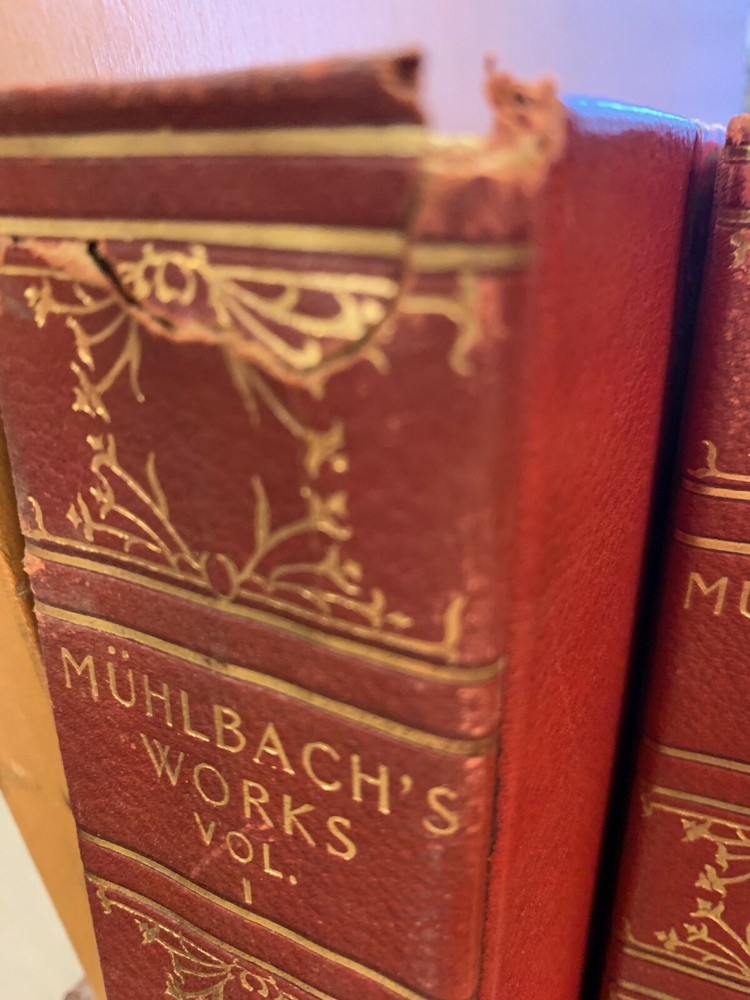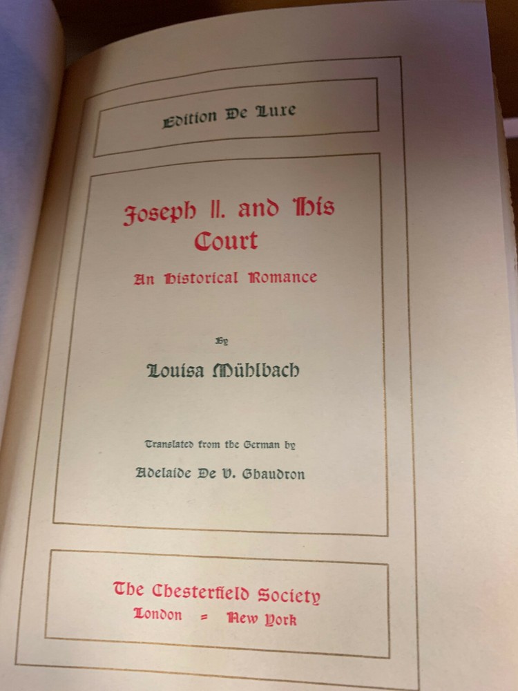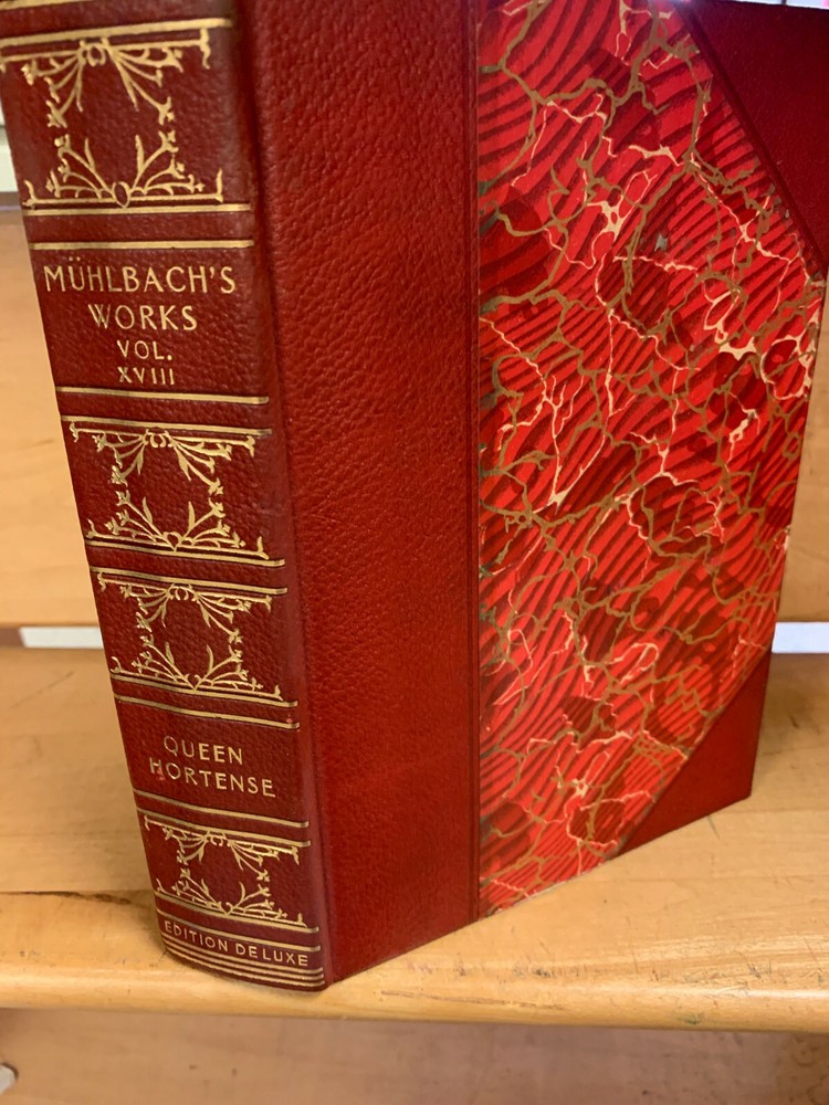 Louisa Muhlbach MUHLBACH'S WORKS: EDITION DE LUXE IN 18 VOLUMES London: The Chesterfield Society, 1893. #982 OF ONE THOUSAND SETS. Complete set of eighteen volumes, finely bound in 3/4 red leather and marbled boards, gilt decorated spines, marbled endpapers, top edges gilt. The spine of Vol. One is torn but intact at its crown with all of the remaining 17 volumes in fine condition. The complete works of the popular German historical fiction novelist in their English translations. Set includes: v. 1. Joseph II, and his court.--v. 2. Prince Eugene and his times. --v. 3. Frederick the Great and his family.--v. 4. Marie Antoinette and her son. --v. 5. Louisa of Prussia and her times.--v. 6. Napoleon and the Queen of Prussia.--v. 7. Andreas Hofer.--v. 8. Goethe and Schiller.--v. 9. Berlin and Sans Souci, or, Frederick the Great and his friends.--v. 10. The Empress Josephine.--v. 11. Napoleon and Blücher.--v. 12. Henry VIII and his court: or, Catherine Parr.--v. 13. Frederick the Great and his court.--v. 14. The merchant of Berlin.--v. 15. Mohammed Ali and his house.--v. 16. The daughter of an empress.--v. 17. Old Fritz and the new era.--v. 18. Queen Hortense.