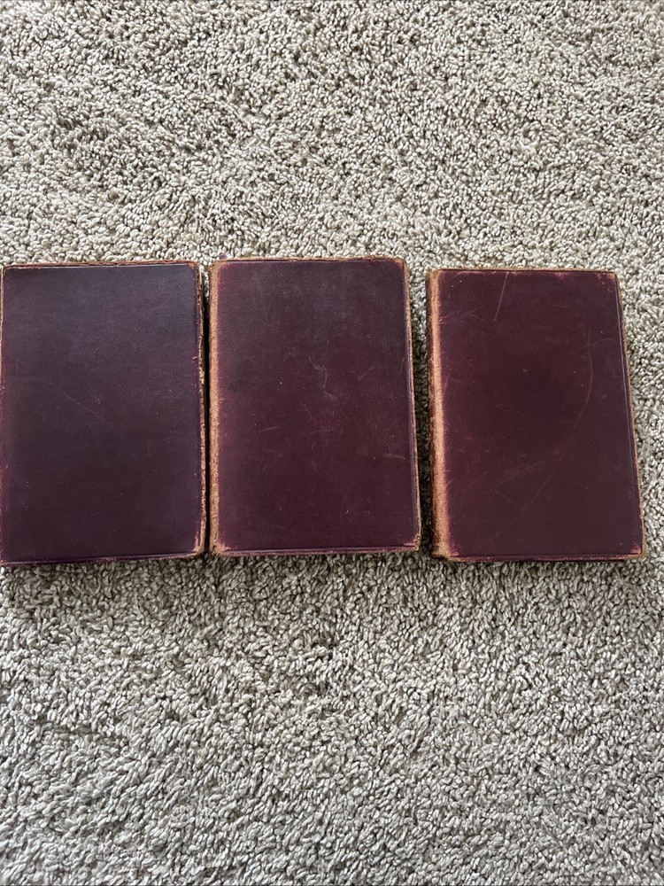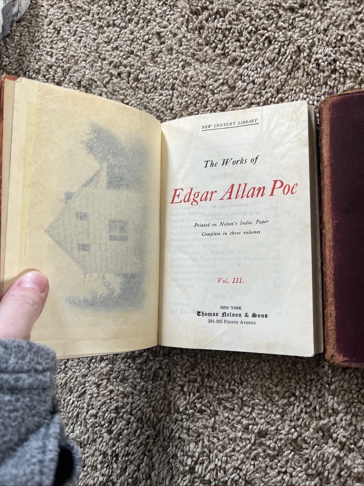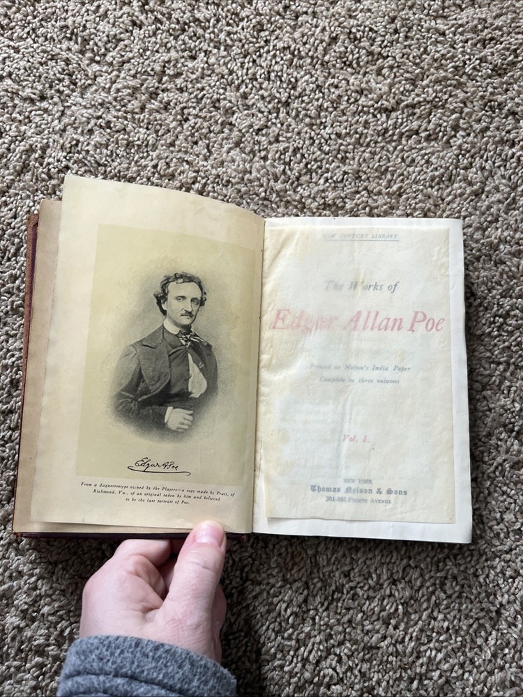 Immerse yourself in the tales of mystery and macabre with this complete set of Edgar Allan Poe's works, published by Thomas Nelson in 1905. The three volumes are beautifully bound in leather, with a spine adorned by the author's name and the year of publication. The pages are filled with his famous stories, including "The Raven", "The Tell-Tale Heart", and "The Murders in the Rue Morgue". This original and collectible set is a must-have for any literature and fiction enthusiast, and is sure to add a touch of vintage charm to any bookshelf. ASK QUESTIONS